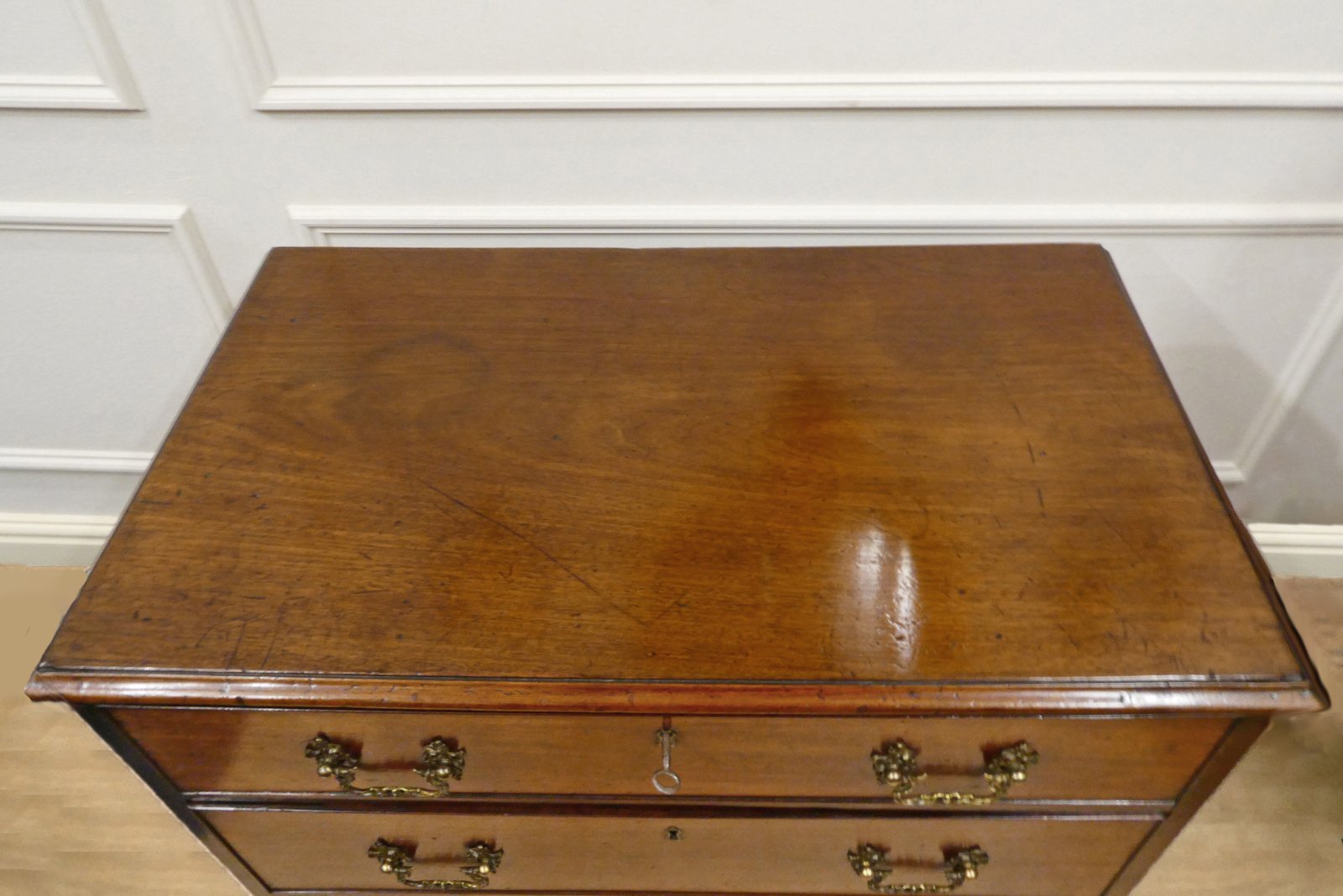 A very good quality George III, Chippendale period figured mahogany chest of drawers of small proportions, with three graduating drawers all retaining their original decorative brass Rococo style handles. The drawers have brass key escutcheons, and are finished with cockbeading to the edges, and they all have working locks and come with a key.