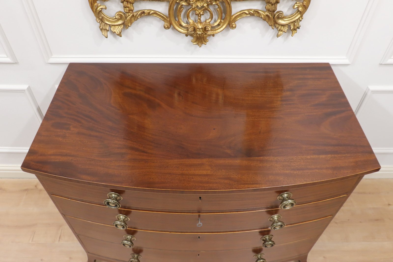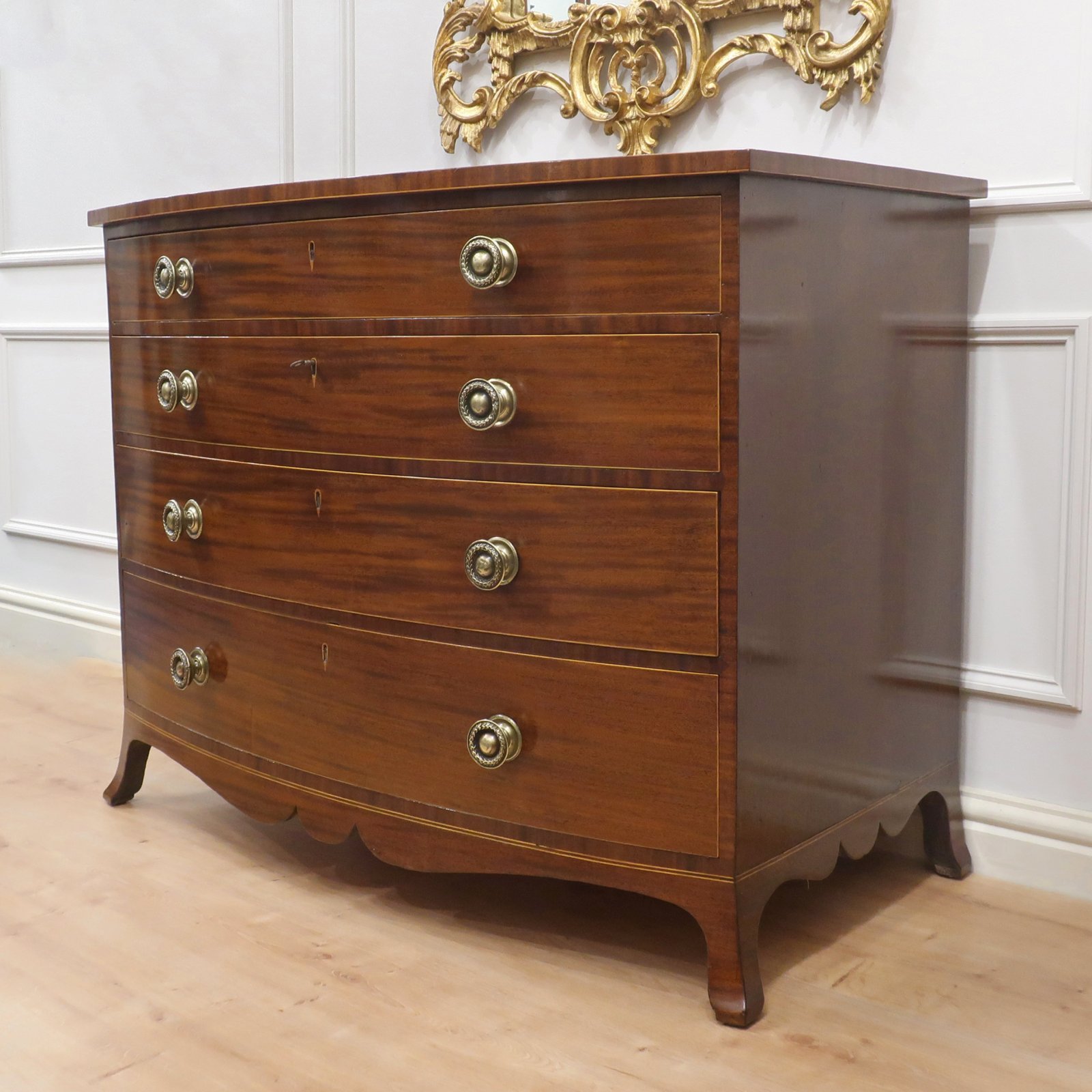 A very good quality George III figured mahogany bow fronted antique chest of drawers with four graduating drawers, each framed in boxwood, with inlaid boxwood key escutcheons, retaining their original decorative brass knobs. The chest of drawers has crossbanding and boxwood string inlay to the edge of the top, crossbanding to the front, a shaped apron and stands on splayed feet.