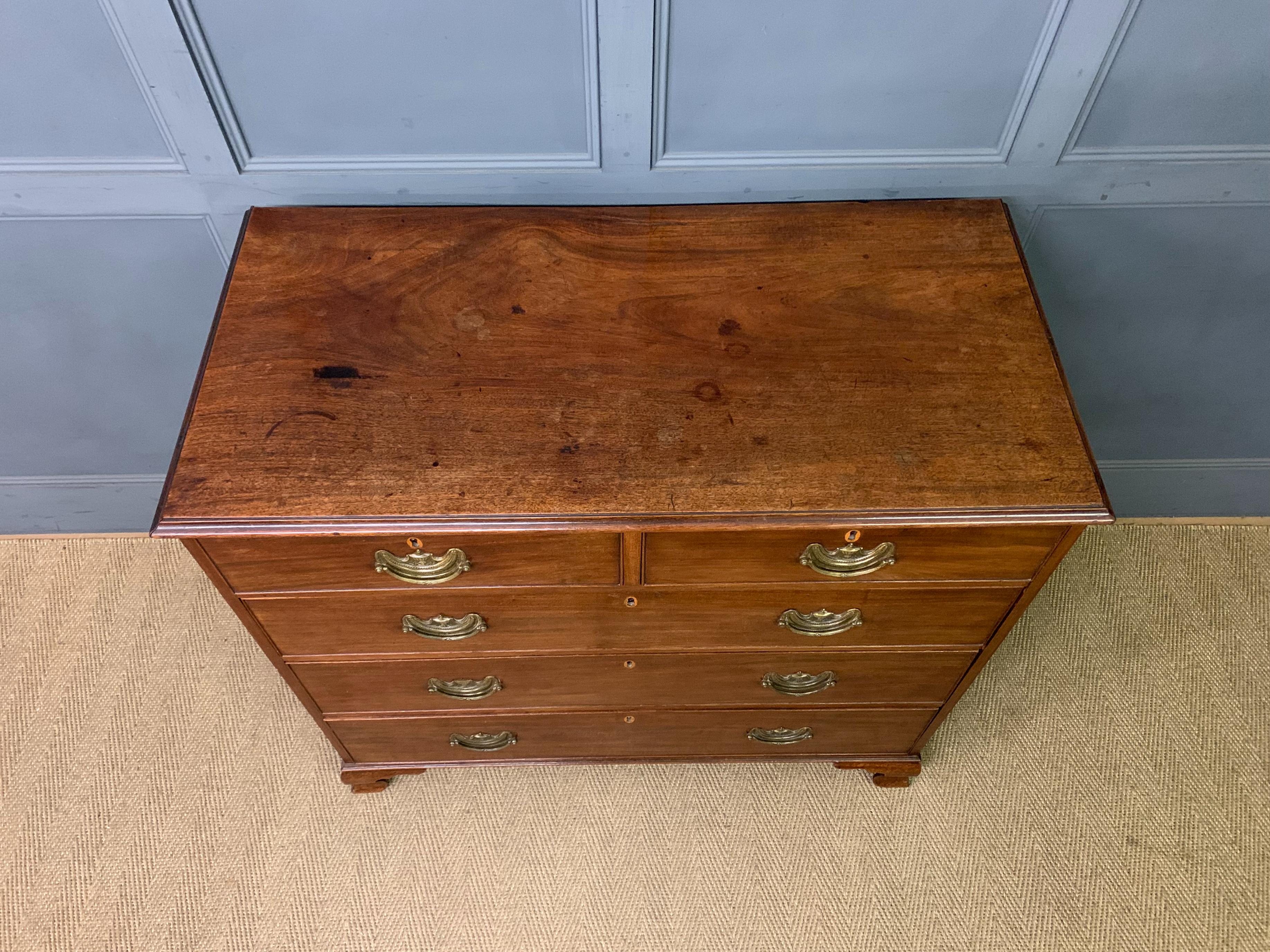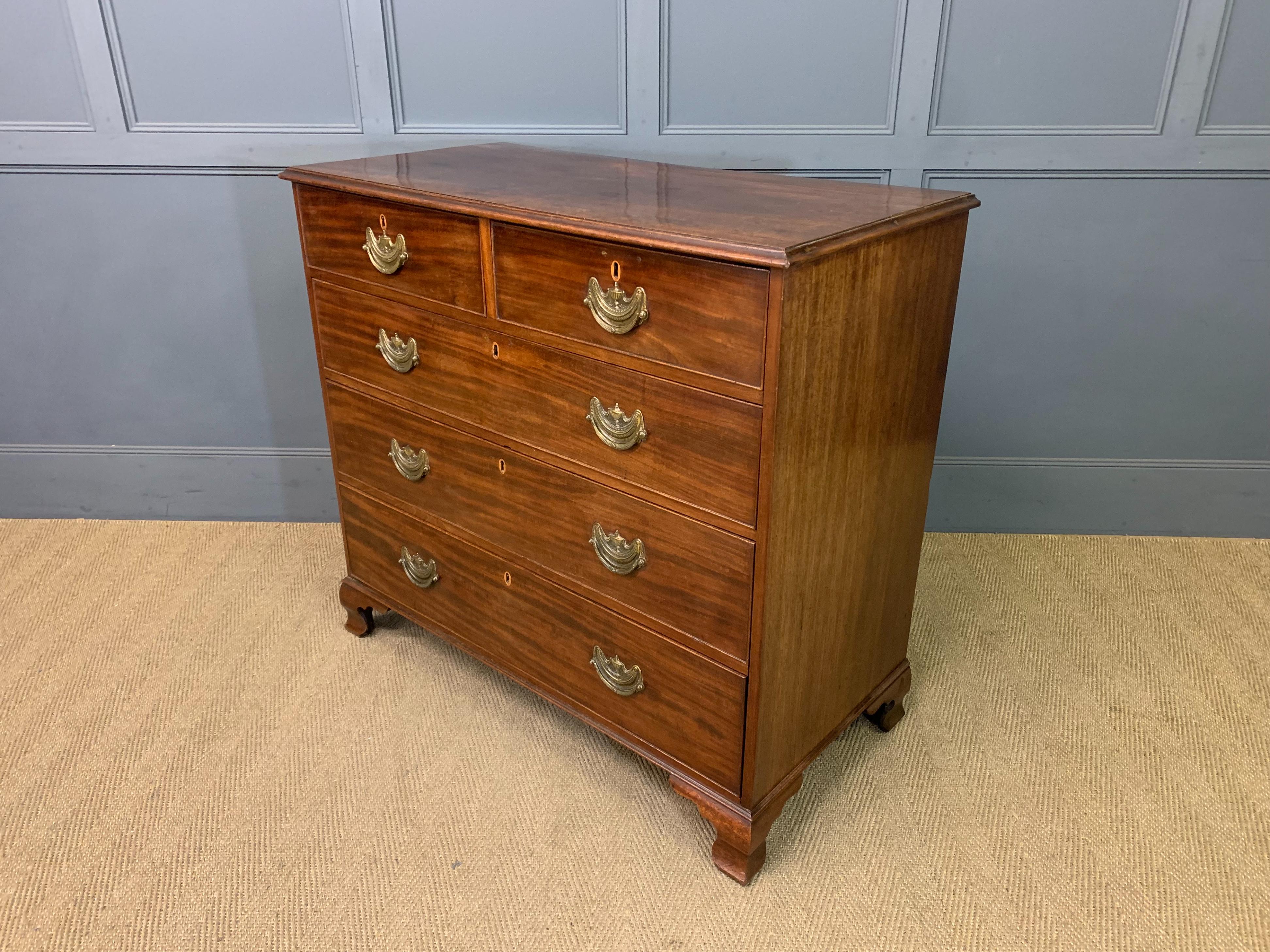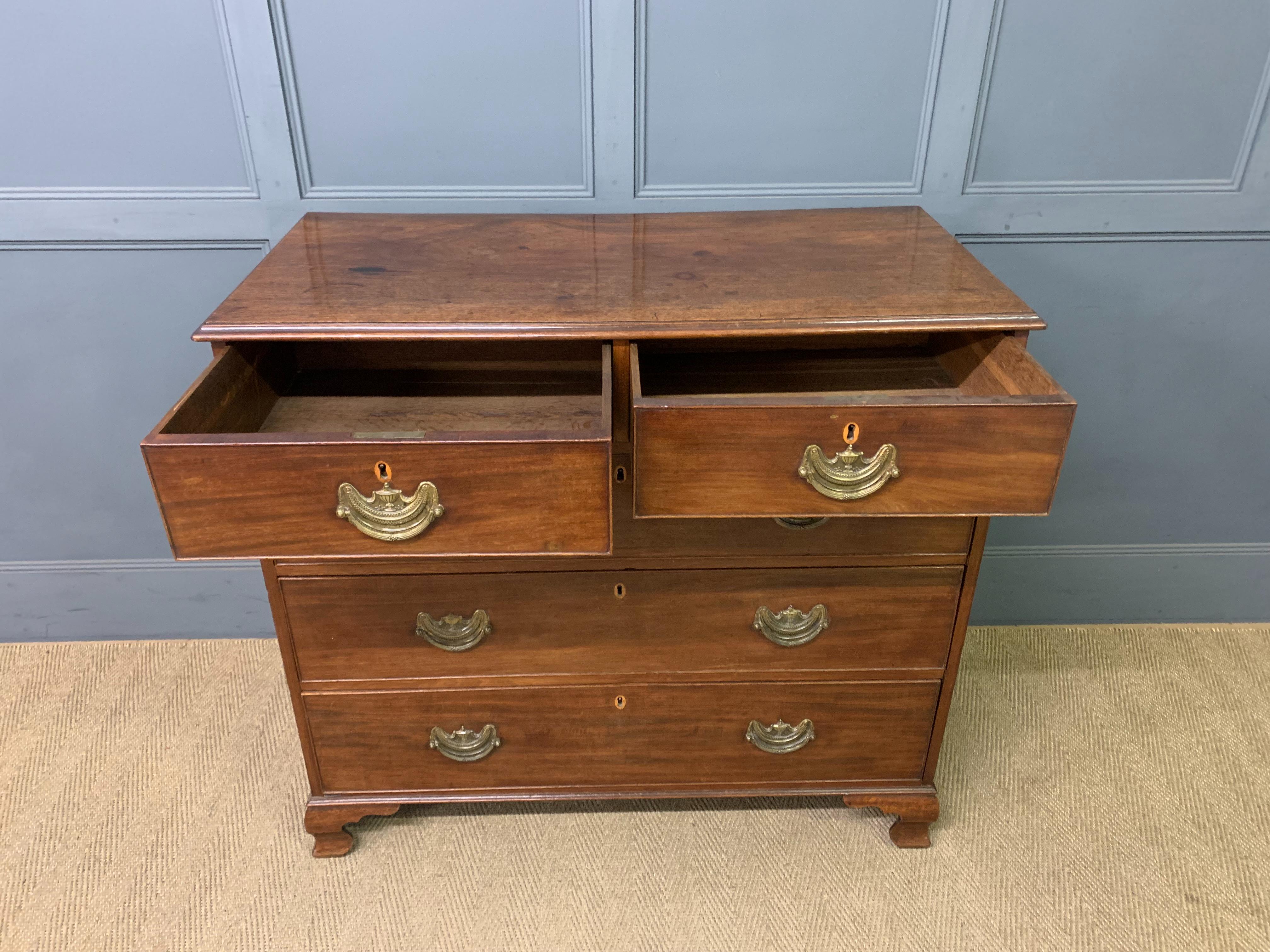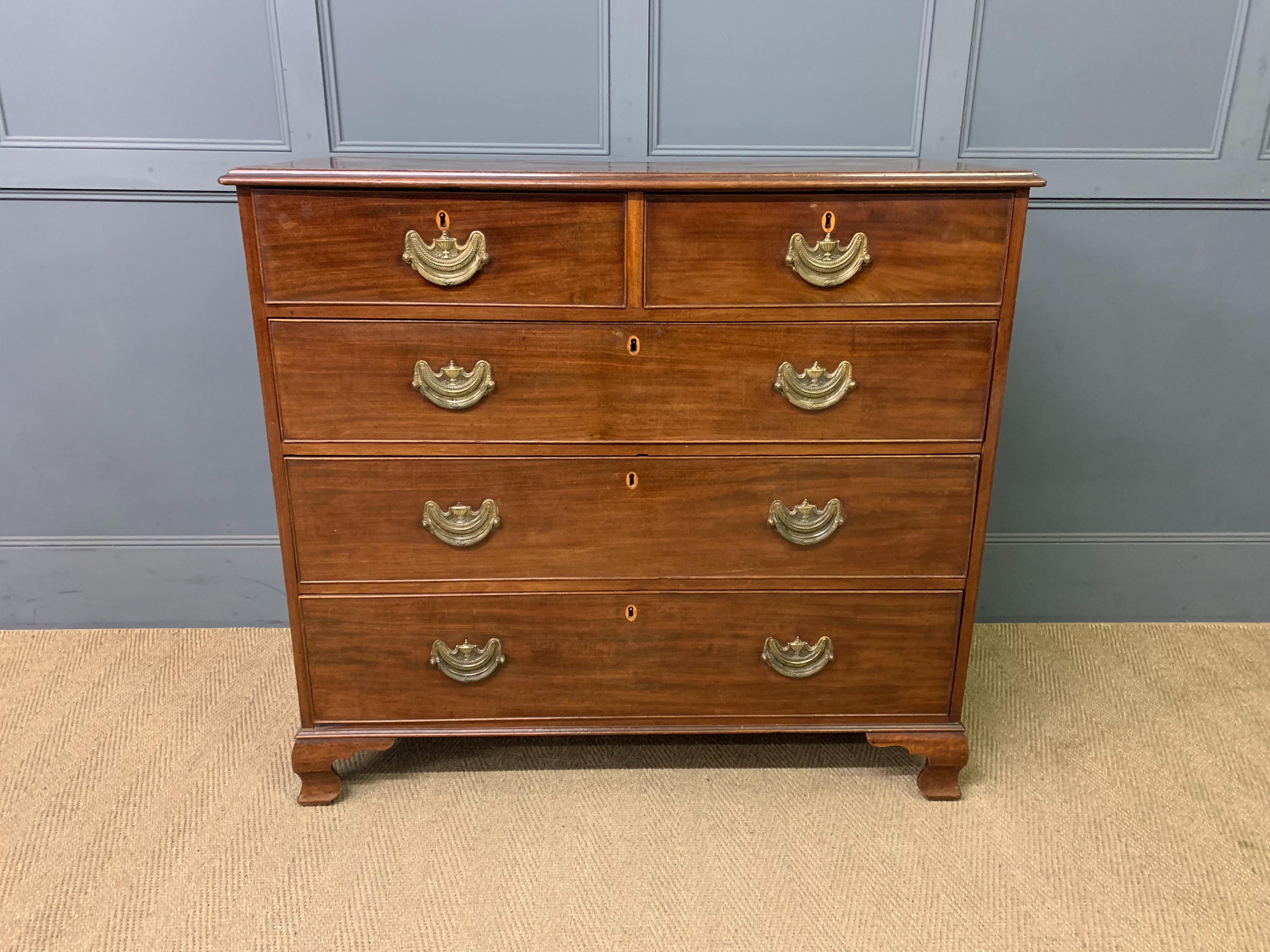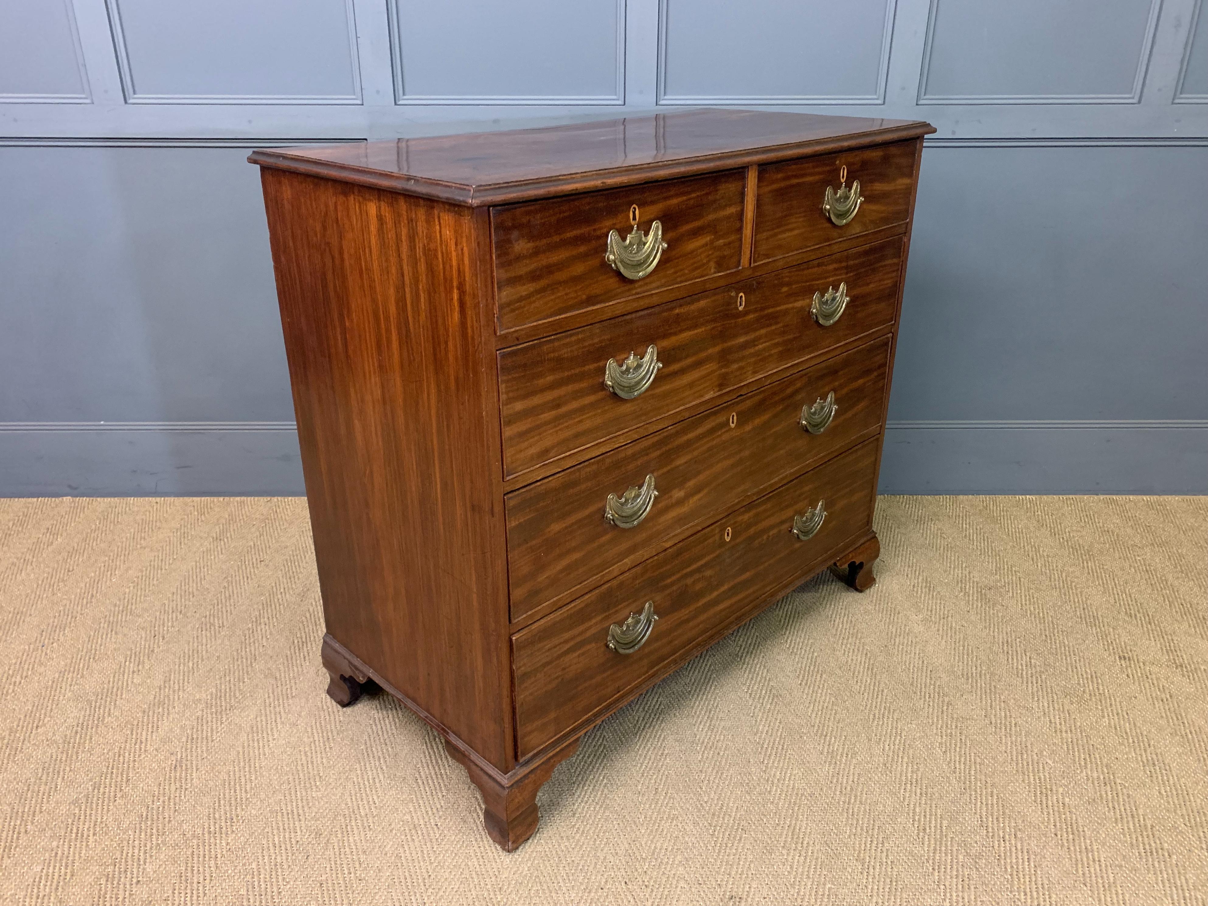 A charming George III period mahogany chest of drawers retaining its original superb solid brass handles. Well constructed in solid mahogany with solid oak drawer linings. With satinwood escutcheons. Retaining its original locks and bold solid brass handles. With an arrangement of 2 short over 3 long, graduated drawers. All standing on ogee bracket feet. Cleaned and waxed in our workshops and now offered for sale in very good original condition, with a warm colour and patina. With minor imperfections , adding character and befiting of a chest 250 years old.