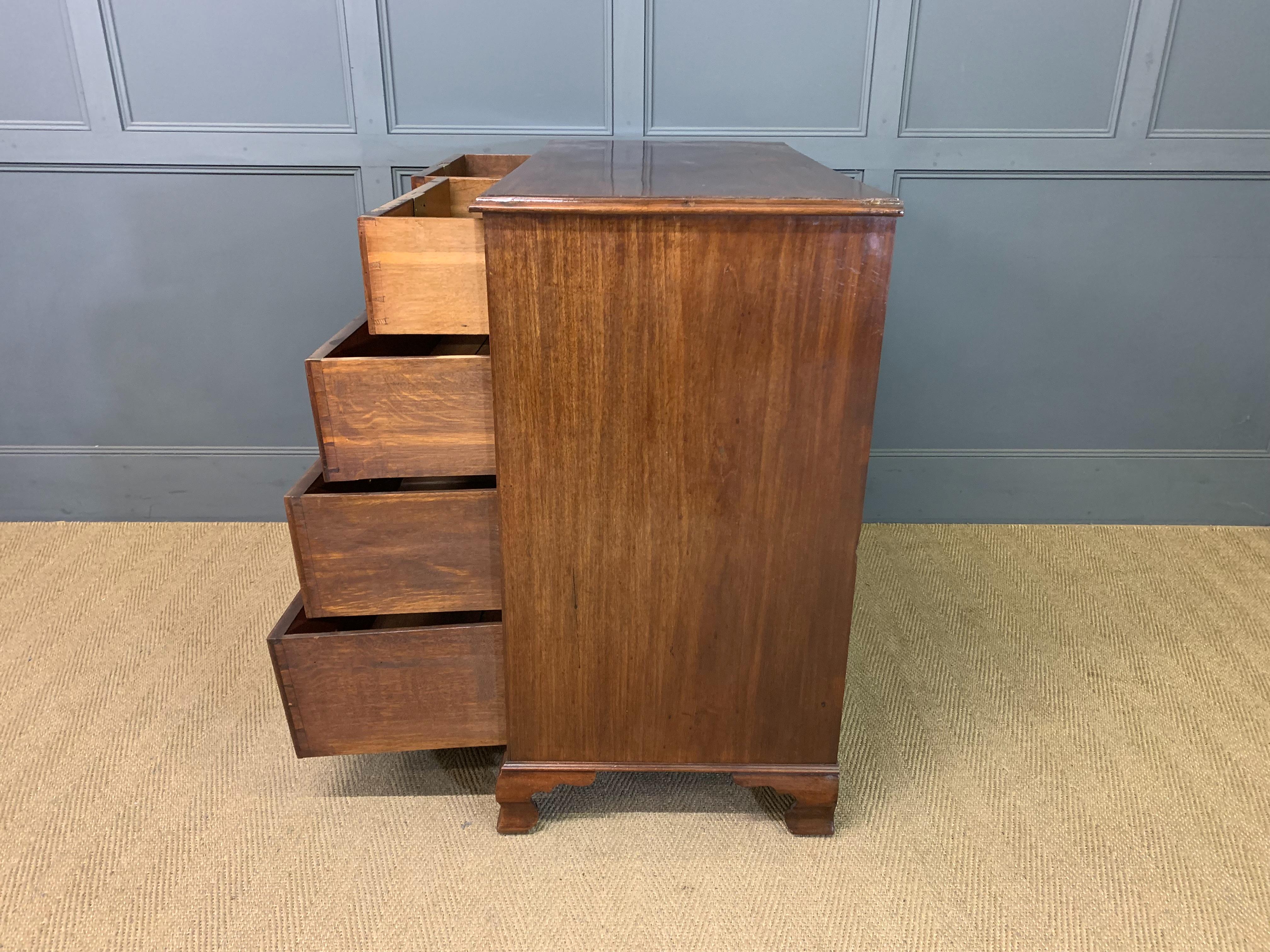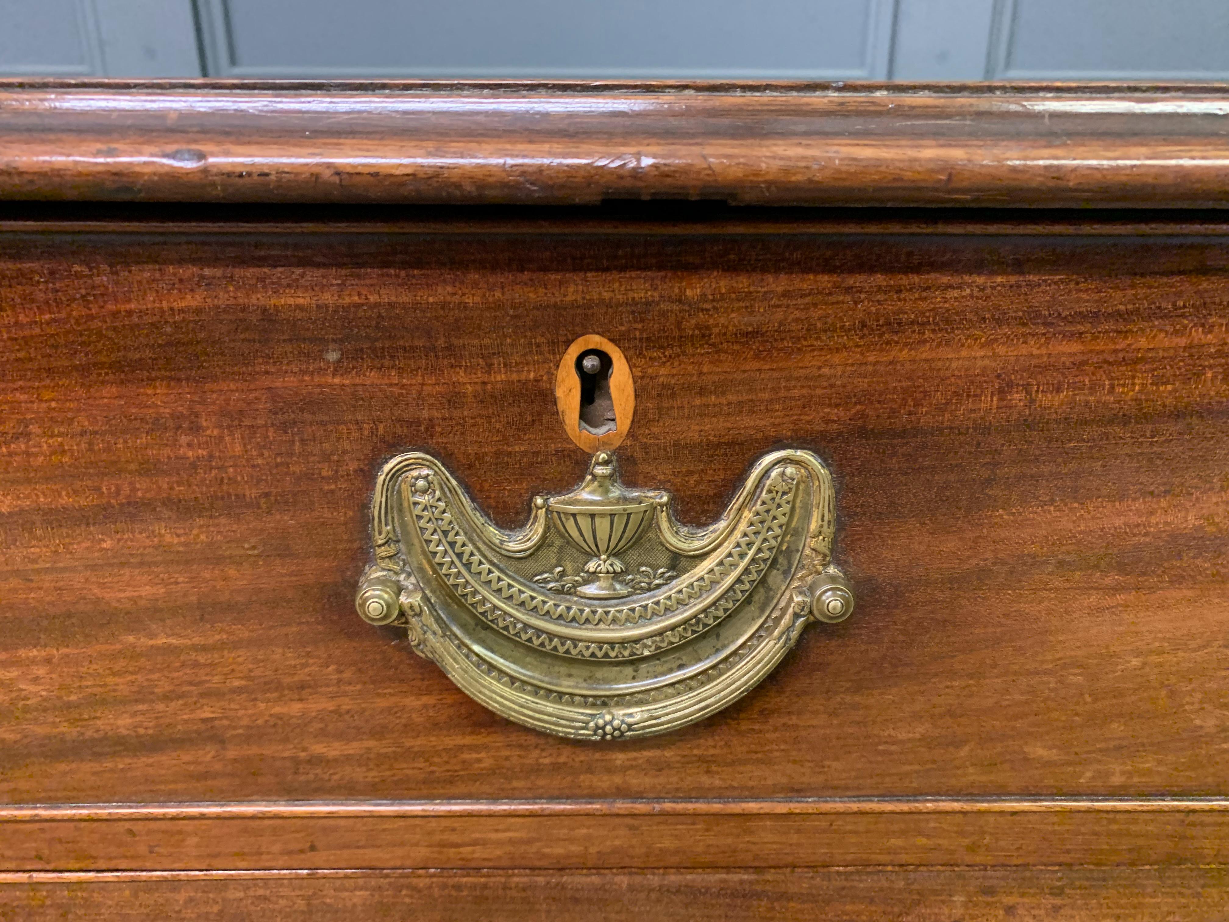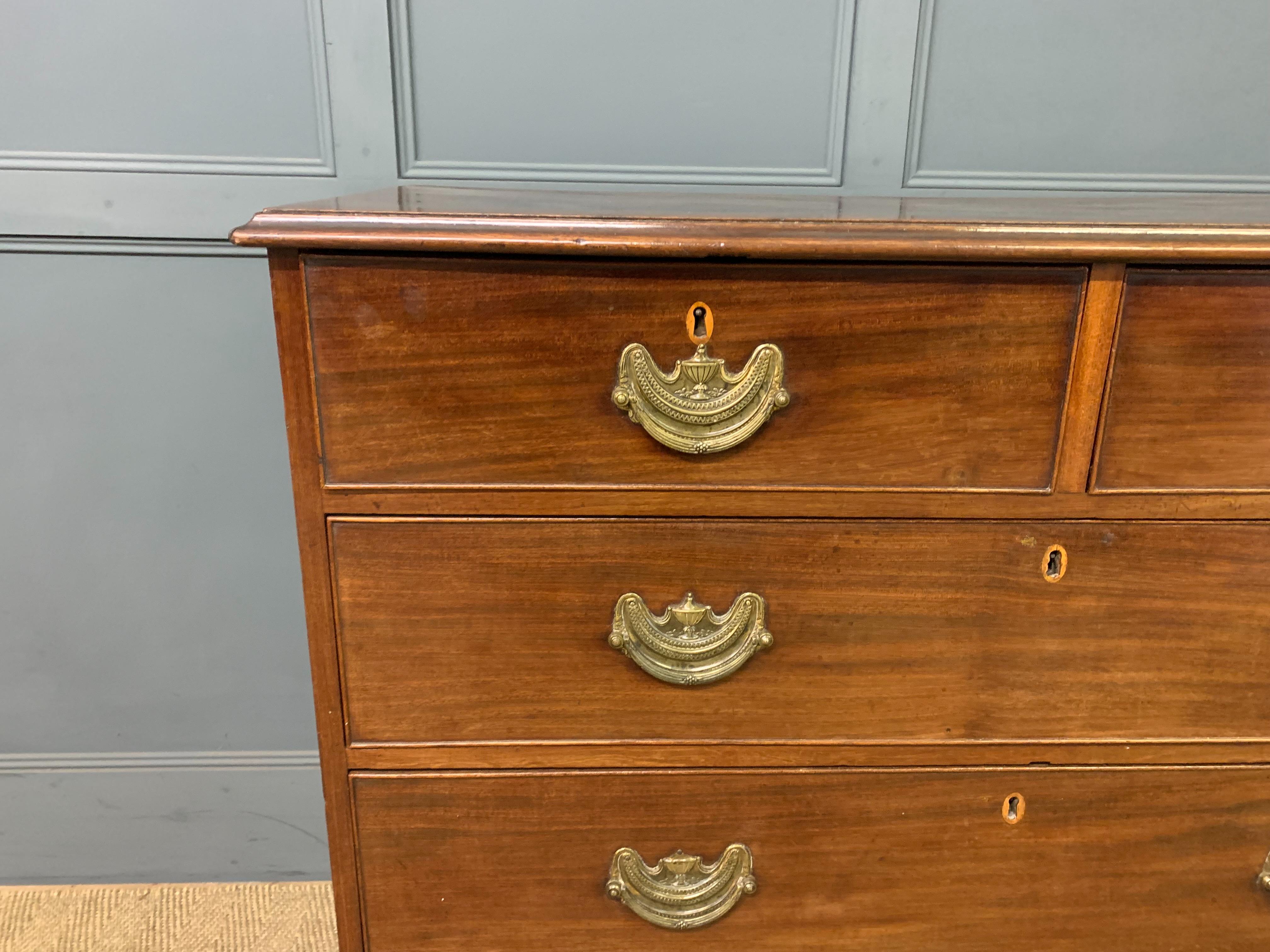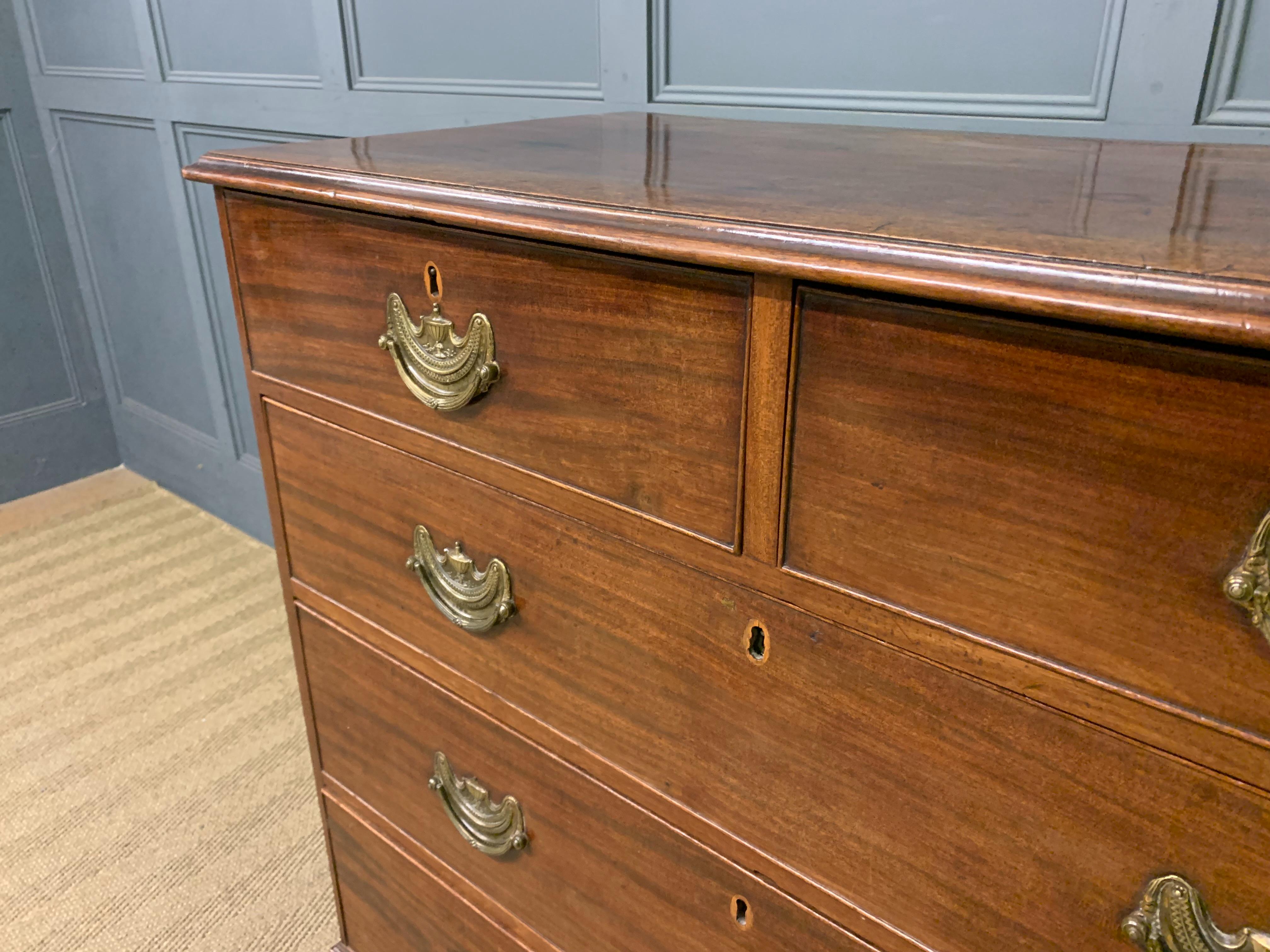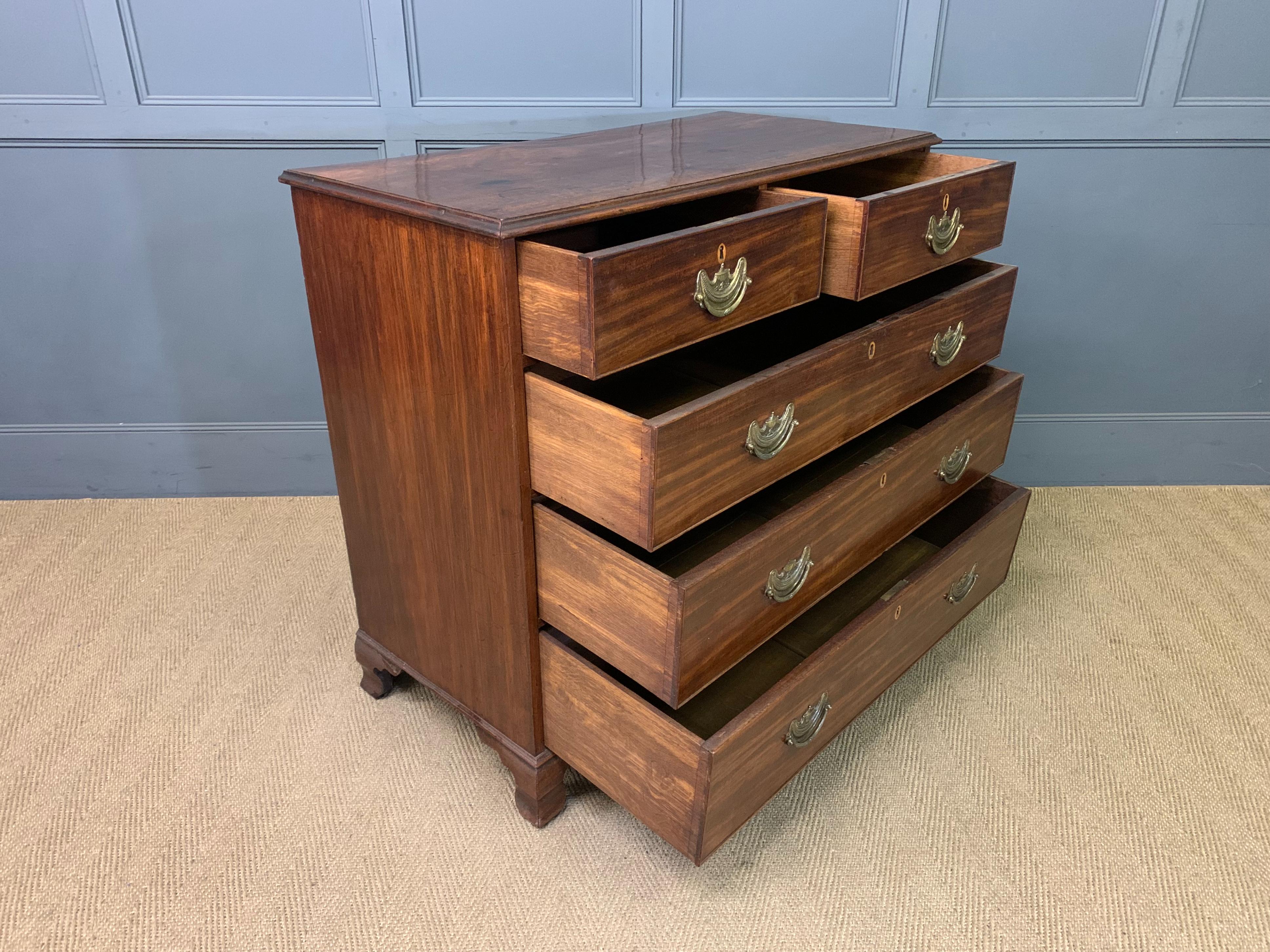 A charming George III period mahogany chest of drawers retaining its original superb solid brass handles. Well constructed in solid mahogany with solid oak drawer linings. With satinwood escutcheons. Retaining its original locks and bold solid brass handles. With an arrangement of 2 short over 3 long, graduated drawers. All standing on ogee bracket feet. Cleaned and waxed in our workshops and now offered for sale in very good original condition, with a warm colour and patina. With minor imperfections , adding character and befiting of a chest 250 years old.