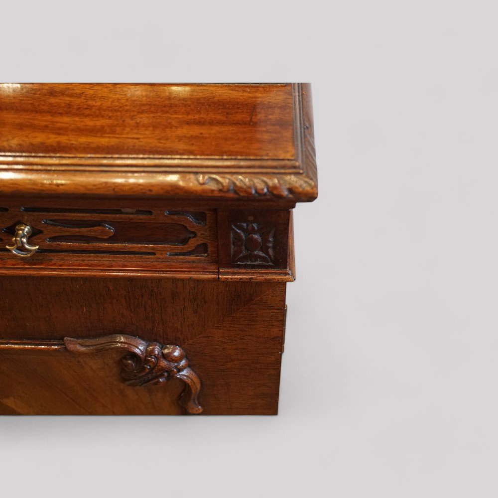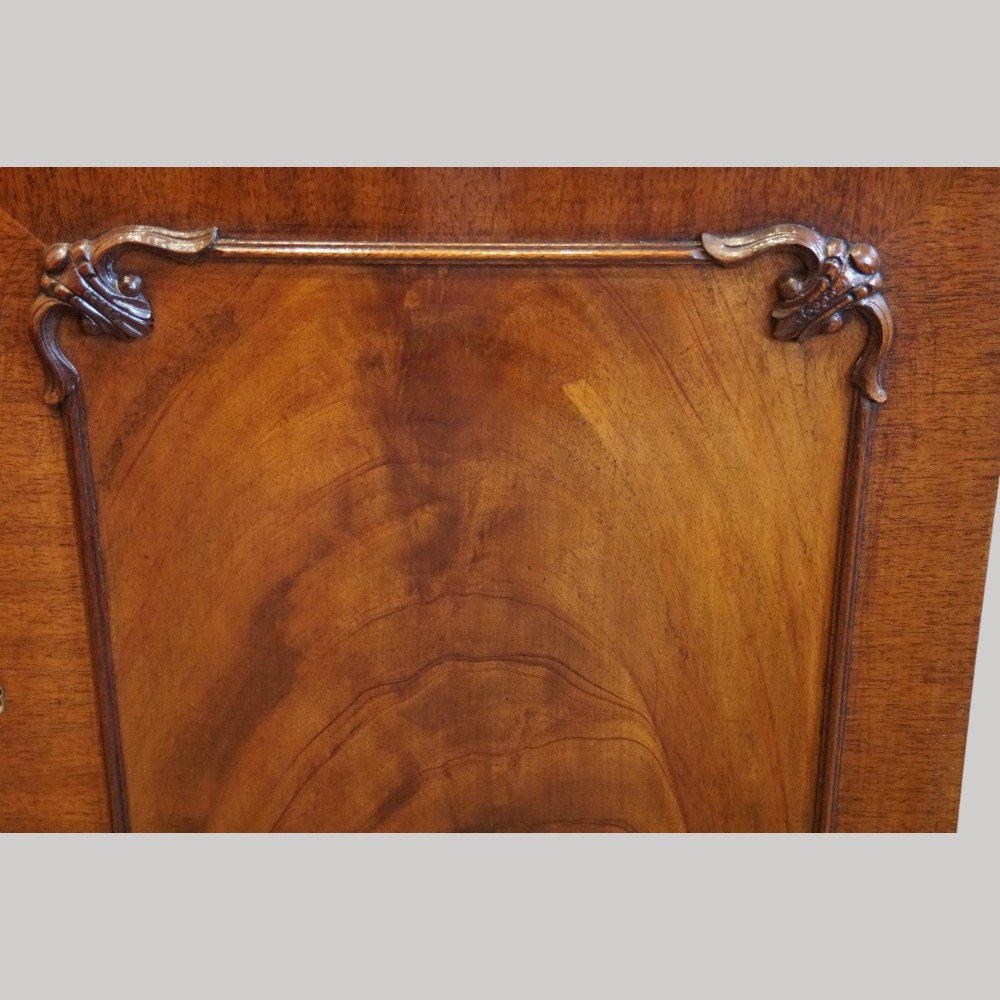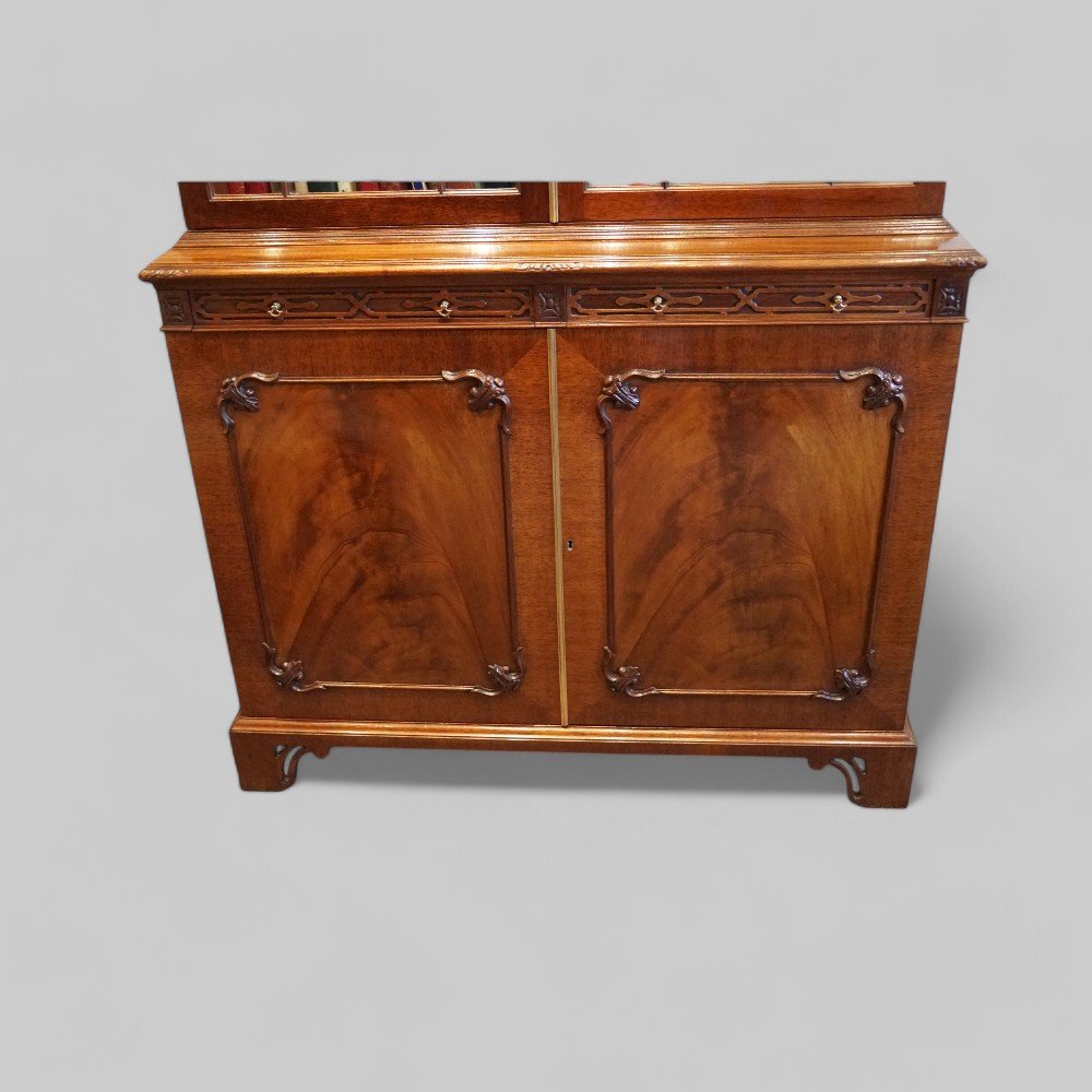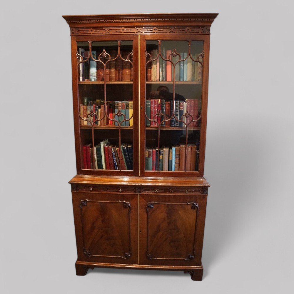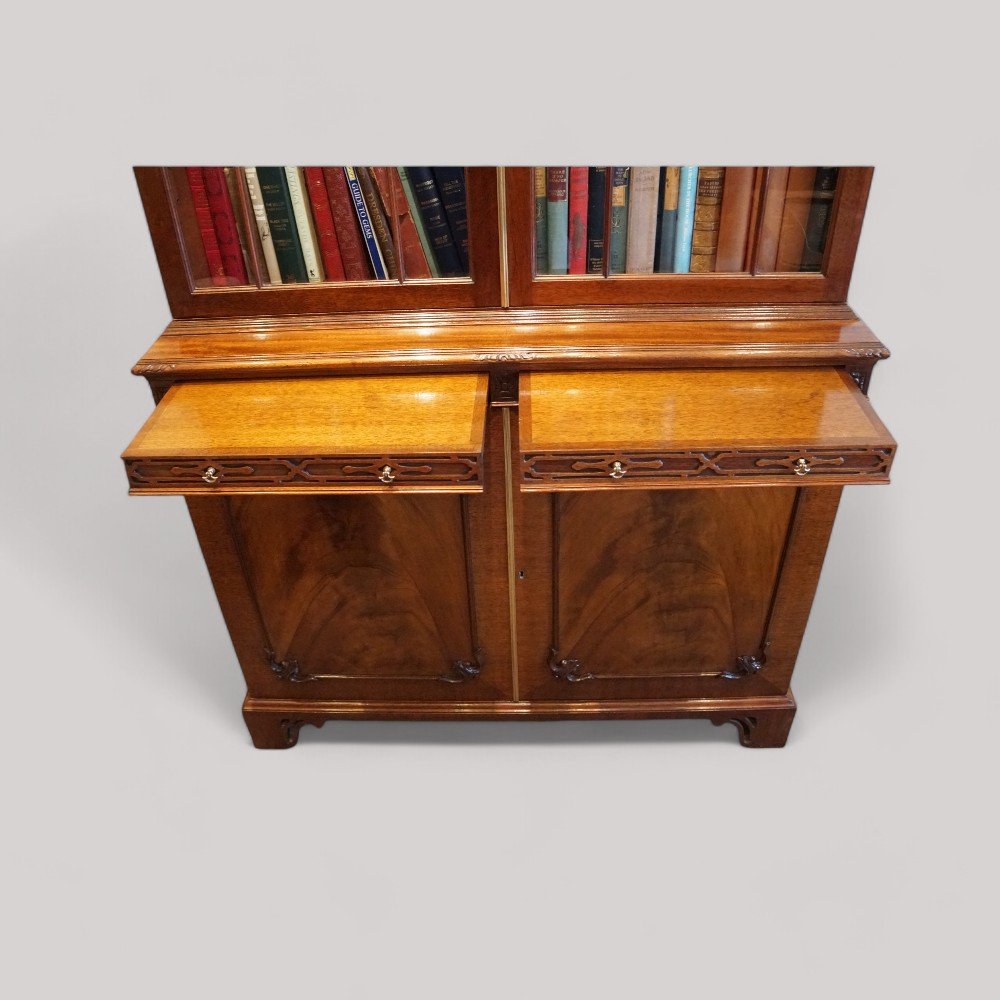 It is made with the influence of Chippendale with the blind fret to the cornice and book slides, together with the fine carving to the corners of the waist.