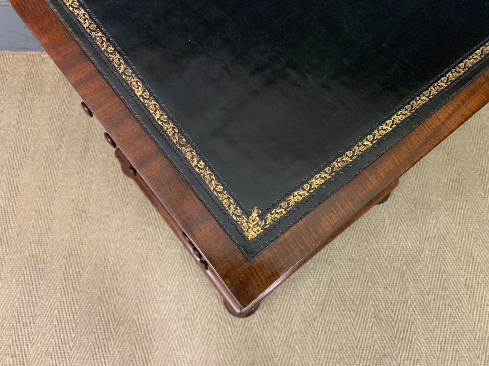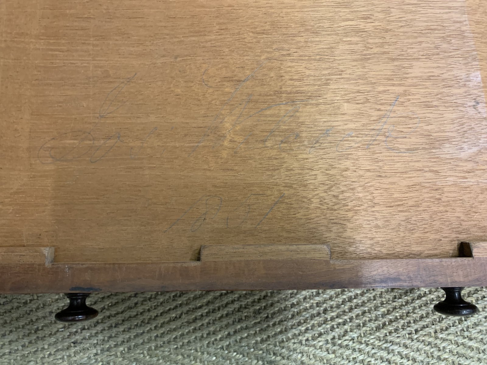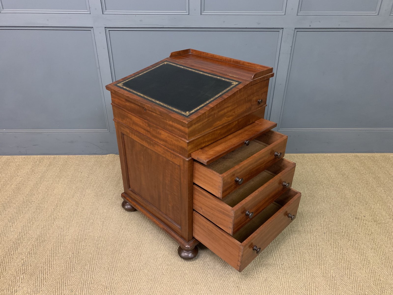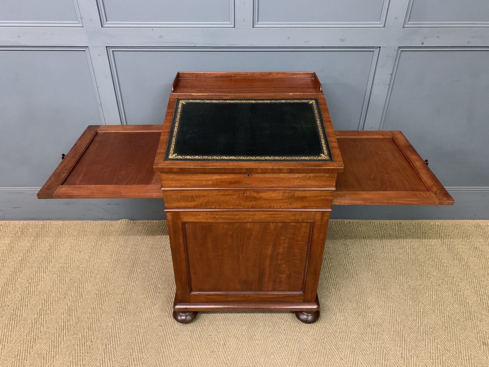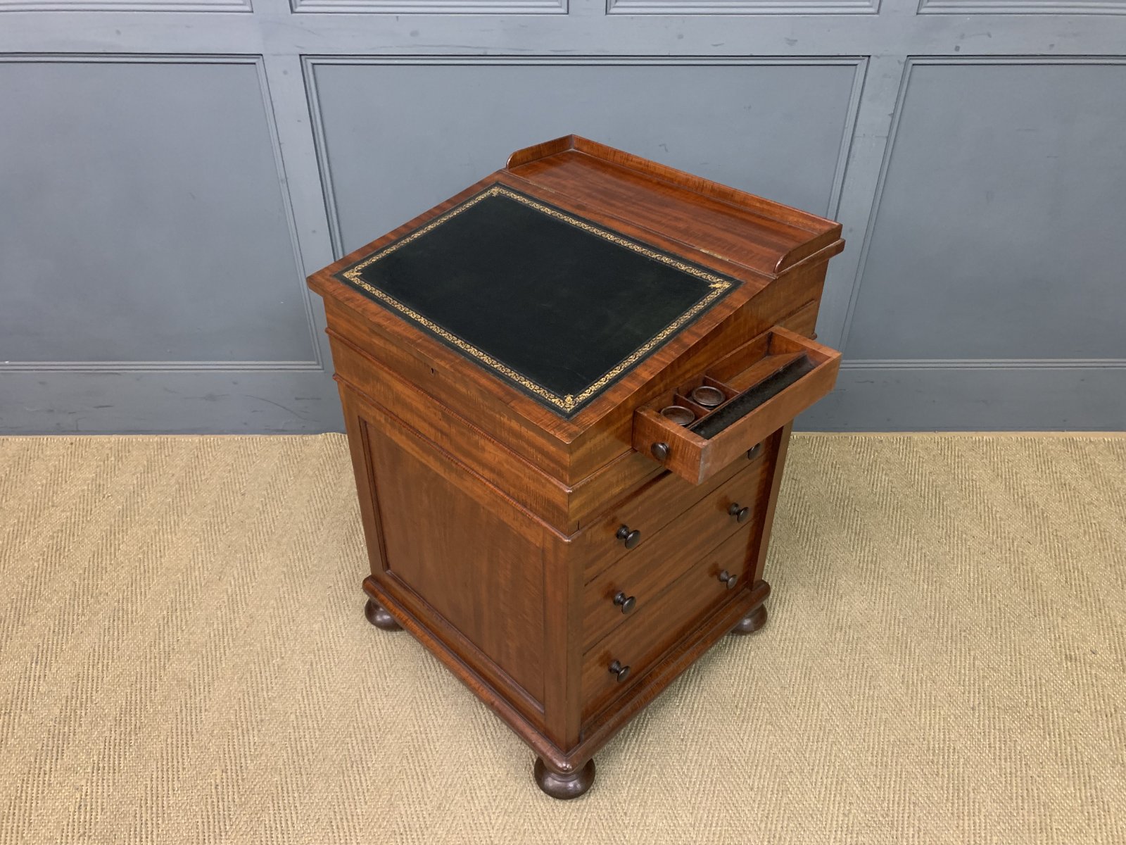 A superb quality early Victorian period mahogany Davenport by Gillows of Lancaster (not stamped). Of fine construction in solid mahogany with attractive mahogany veneers. With a sliding top, fitted with a three quarters gallery and a sumptuous leather writing surface complete with gilt tooled decorations. The lift up top opens to reveal an interior with 2 short drawers and 2 dummy drawers. The handle to one of the dummy drawers pulls out in order to release the hinged stationary tray. With a pair of pull-out slides and a series of 3 drawers to one side and 4 dummy drawers to the other side. The drawers lock via a locking bar (key supplied). All standing on solid turned bun feet. Cleaned and waxed in our workshops and now offered for sale in excellent condition, with a wonderful colour and patina. One drawer signed and dated in pencil to the underside - Jas Wilcock 1851. Locks stamped.