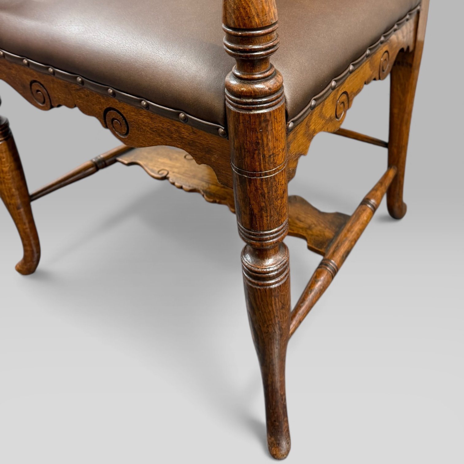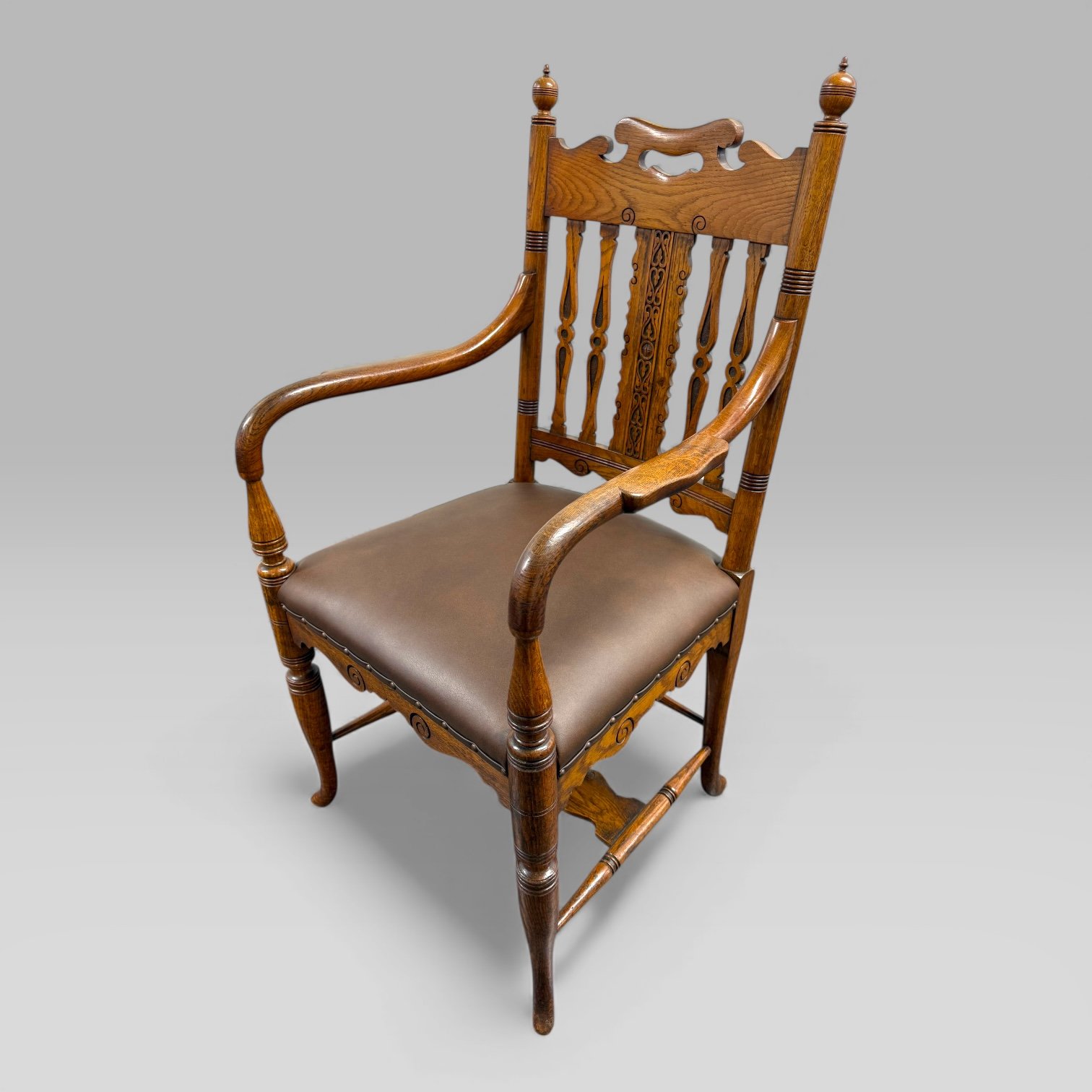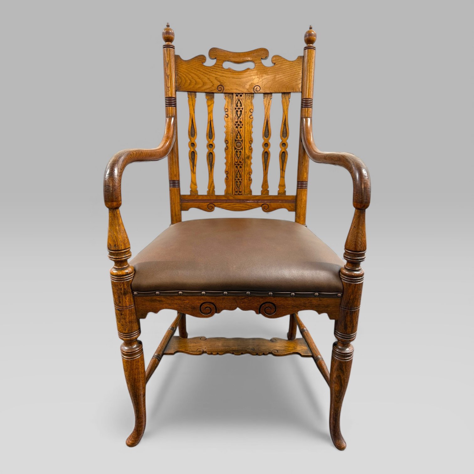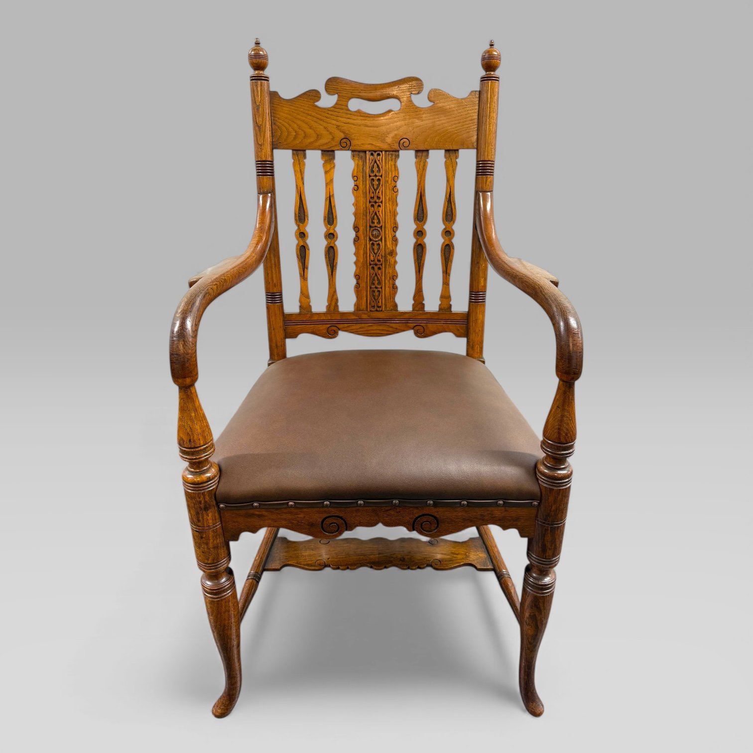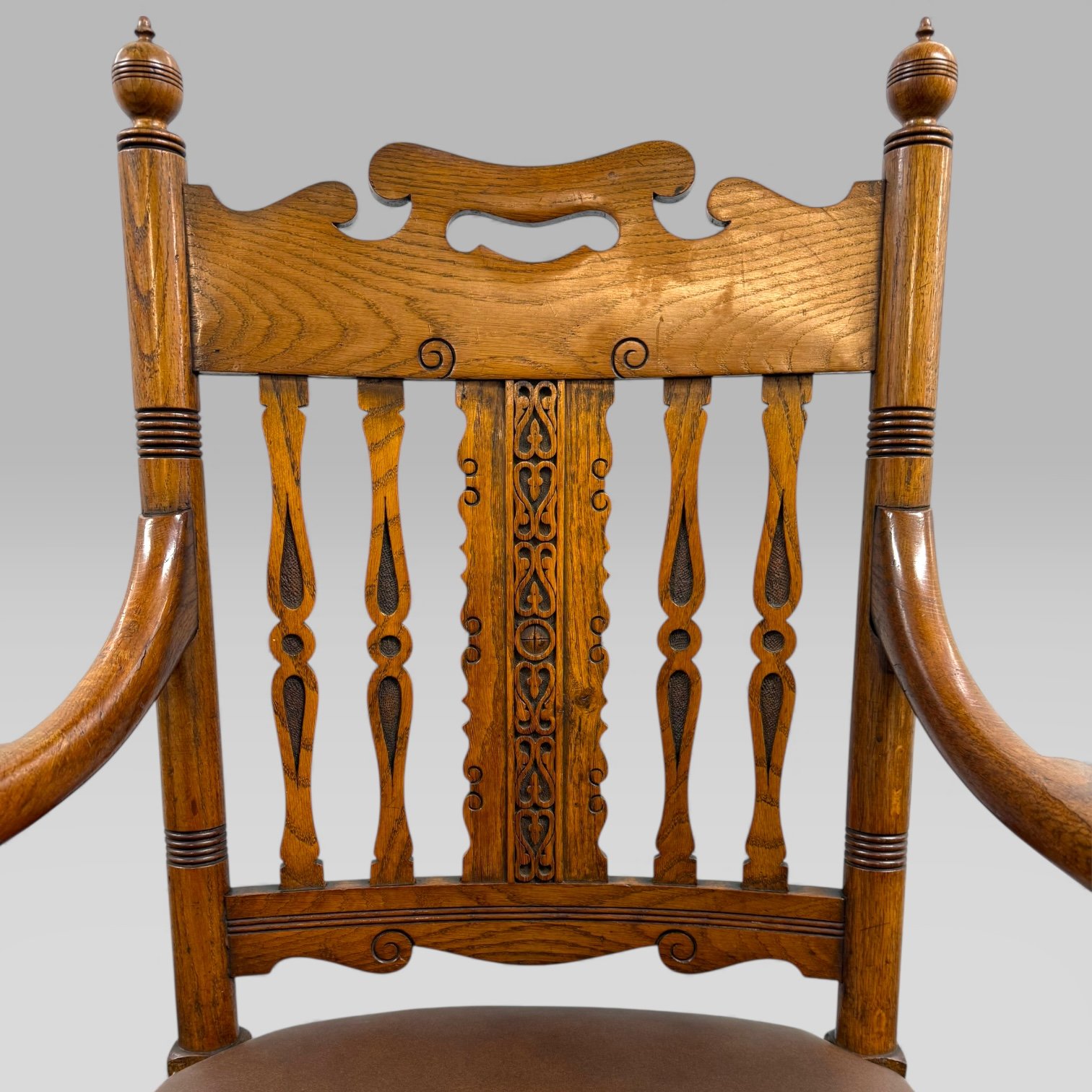 A Gillows Late Victorian Golden Oak Desk Chair attributed to Bruce James Talbert. This fine chair has a carved back with detailed geometric designs, turned legs, a carved finial on top of both sides, a great condition upholstered brown seat and carved detailing throughout.