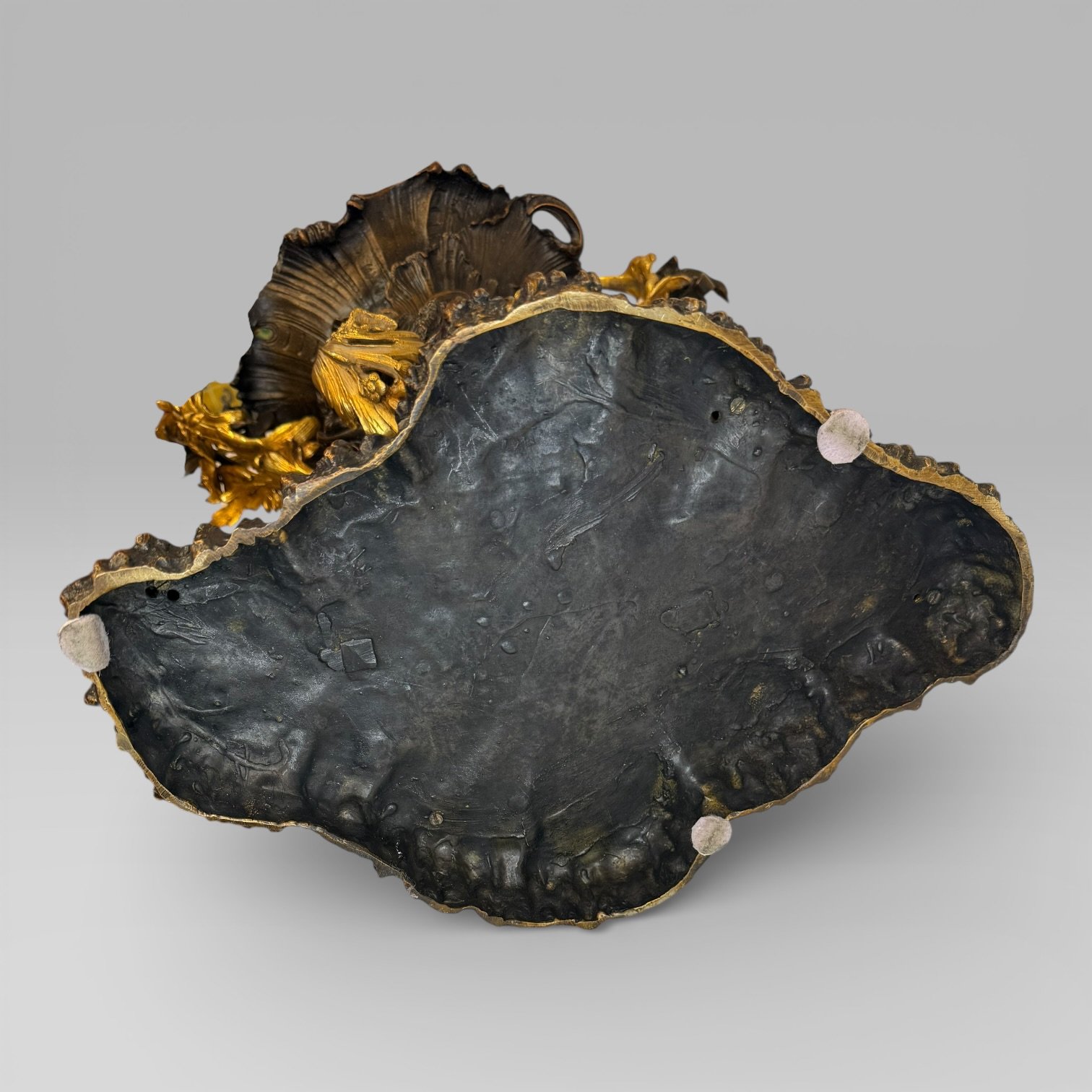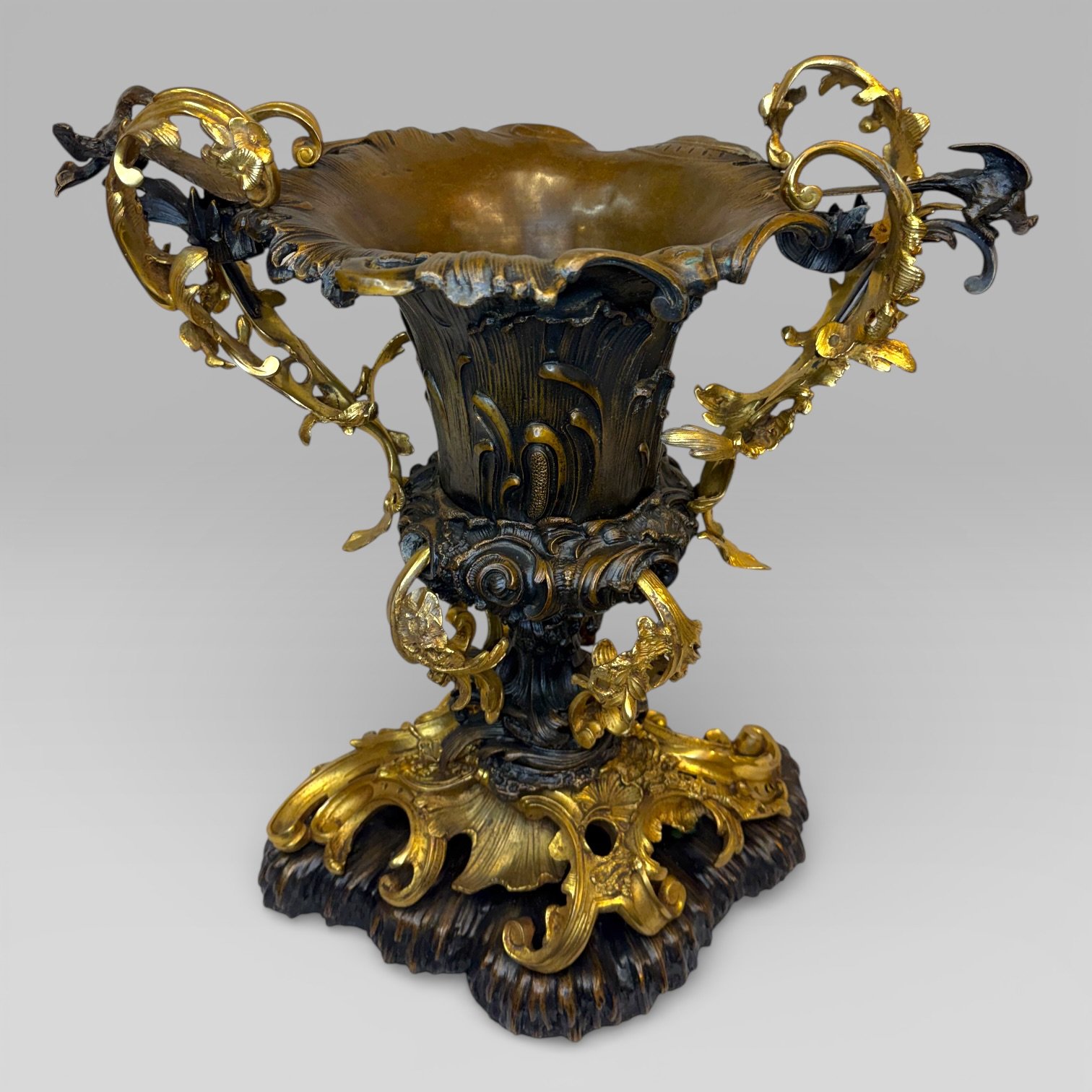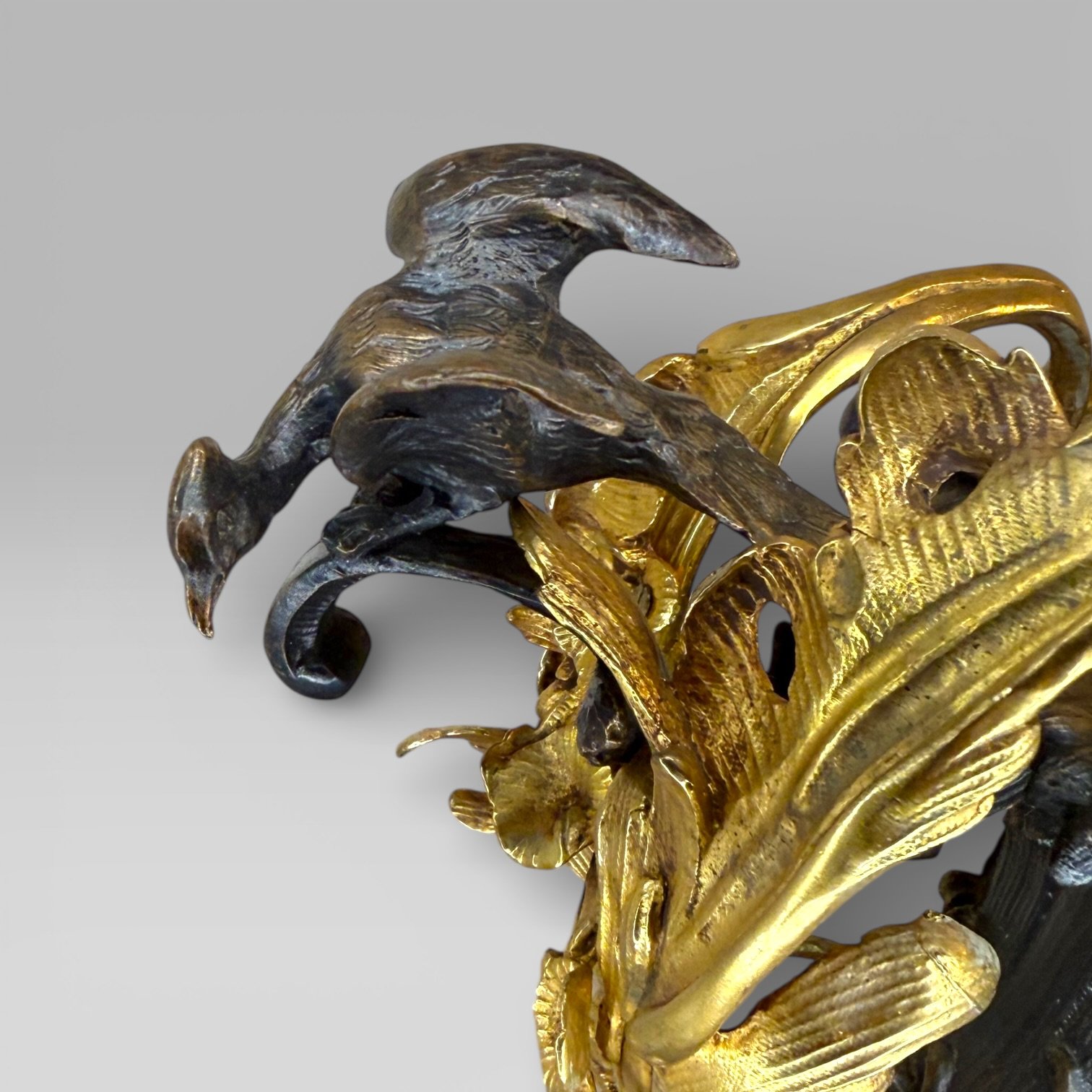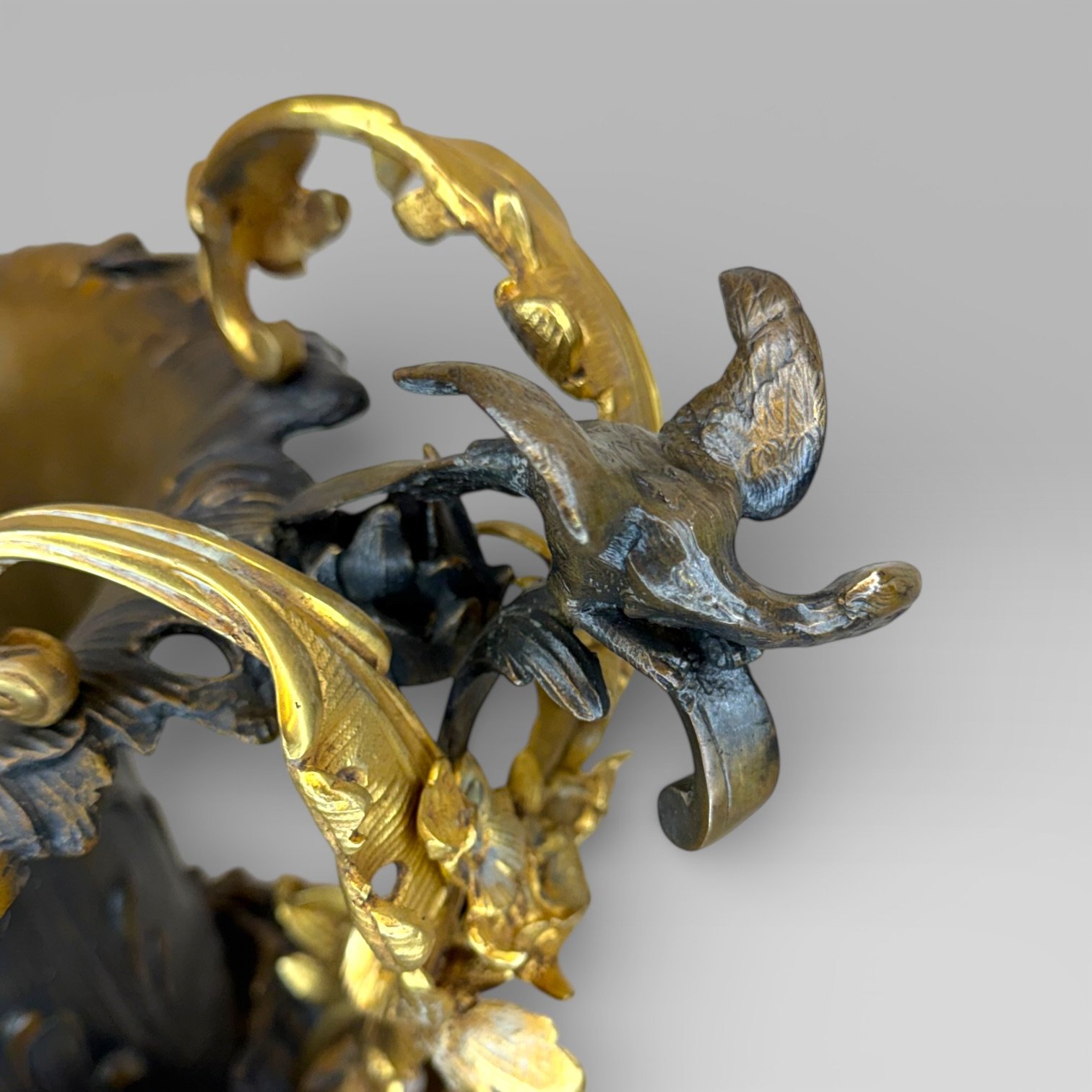 The piece features elaborate floral handles in the Art Nouveau taste, each surmounted by a ho-ho bird, with flowing naturalistic forms typical of decorative revival pieces inspired by 19th century French design. The scale and weight give it strong presence, making it suitable as a centrepiece or decorative focal object within a traditional or eclectic interior.