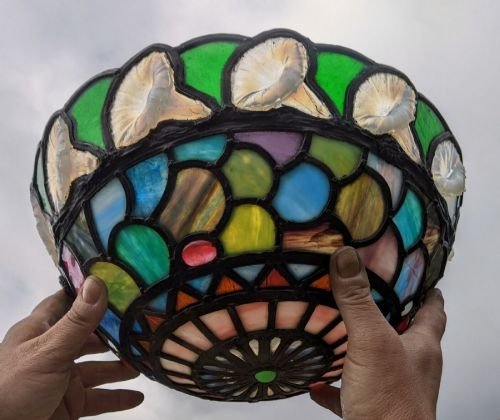 This is a beautiful early 20th century Tiffany style glass light shade with stunning leaded glass detailing. The shade dates from around 1900. Overall in very good condition with just a couple of coloured glass panes having minor cracks. This has very long hanging chains and brass ceiling rose.