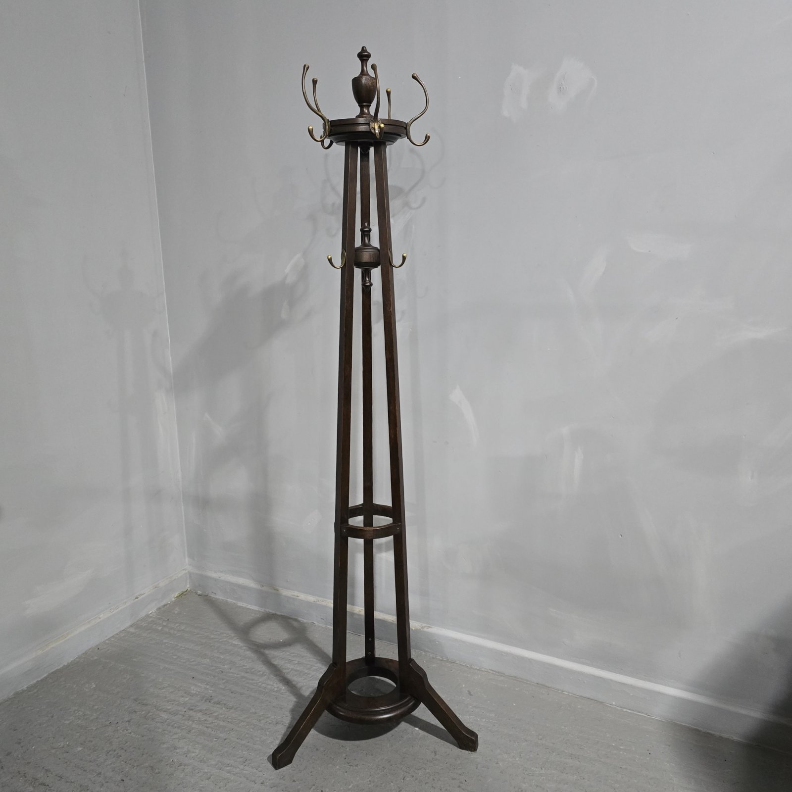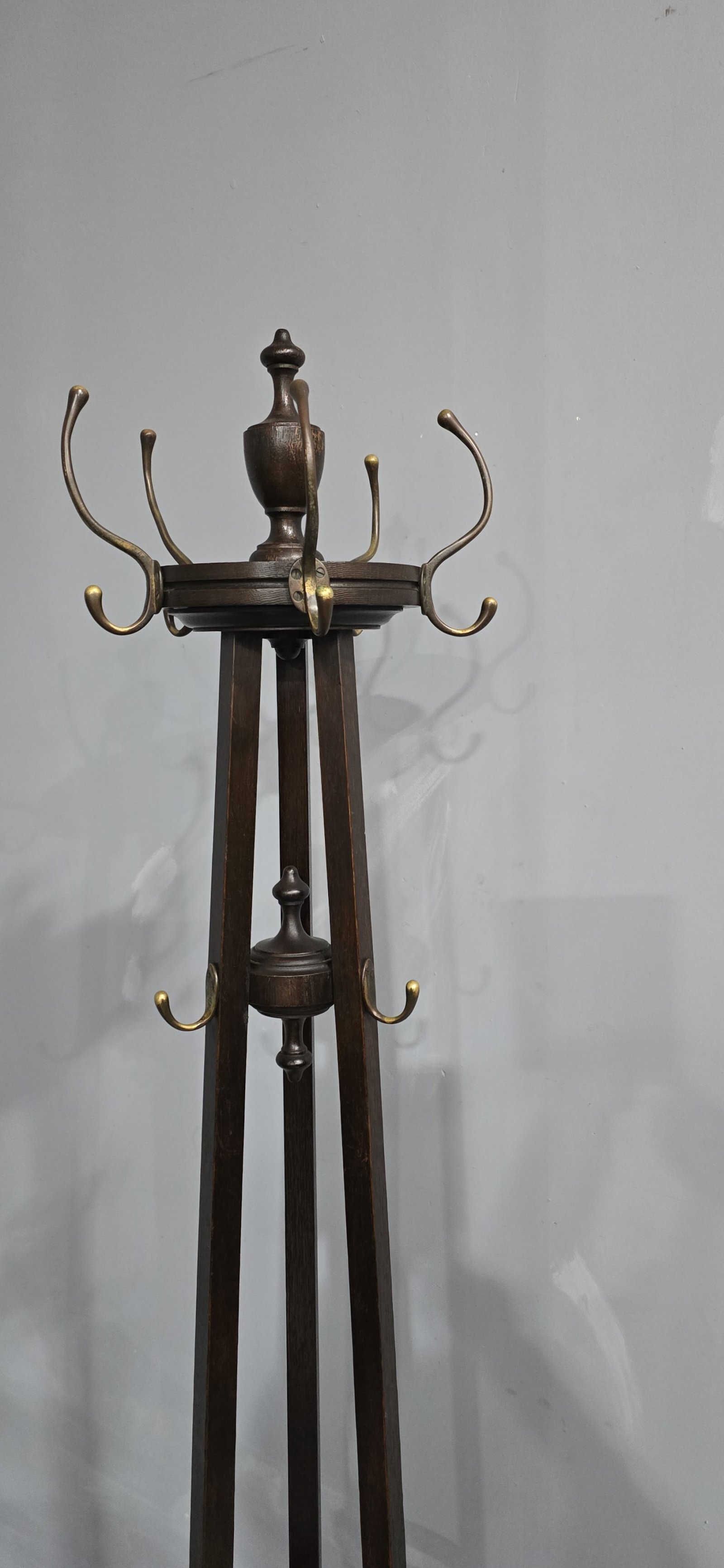 A very nice Arts and Crafts oak coat stand, with brass coat hooks, finial to the top, revolving top, in very good overall condition.