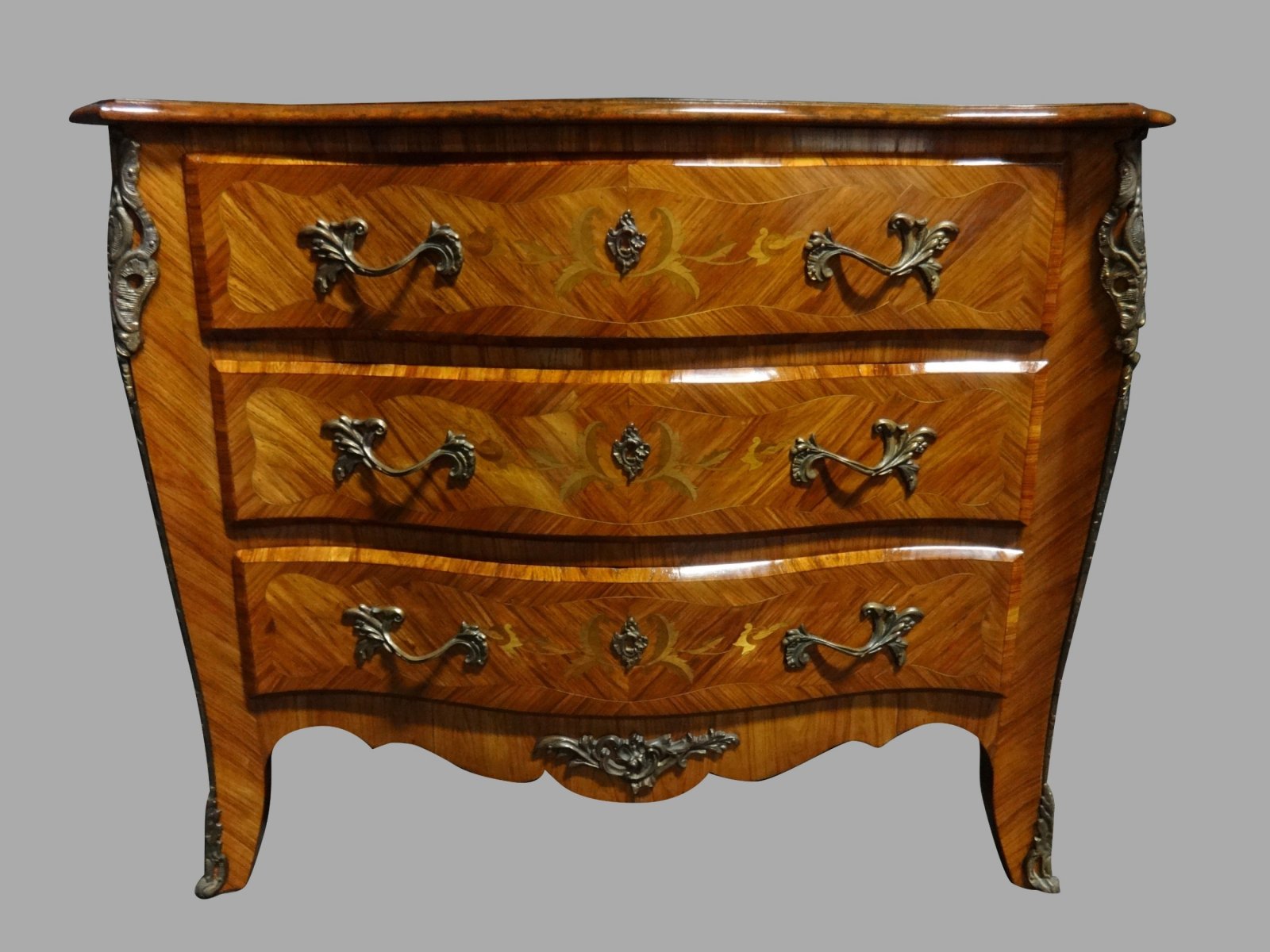 A good French Commode chest of drawers with bowed drawers, marquetry panels, brass handles and mounts, re polished to a very high standard.