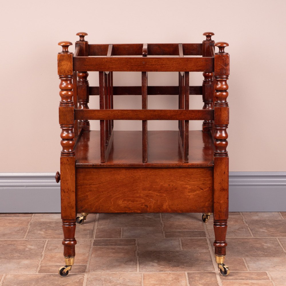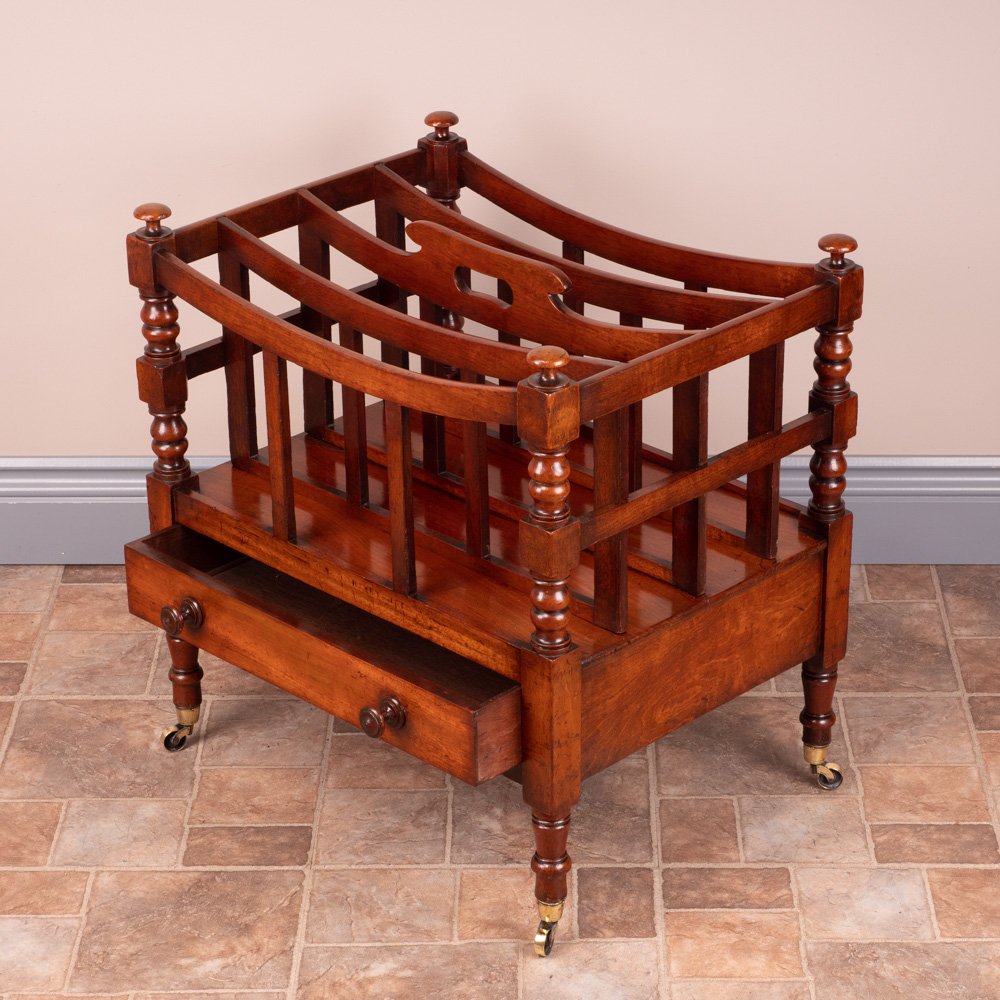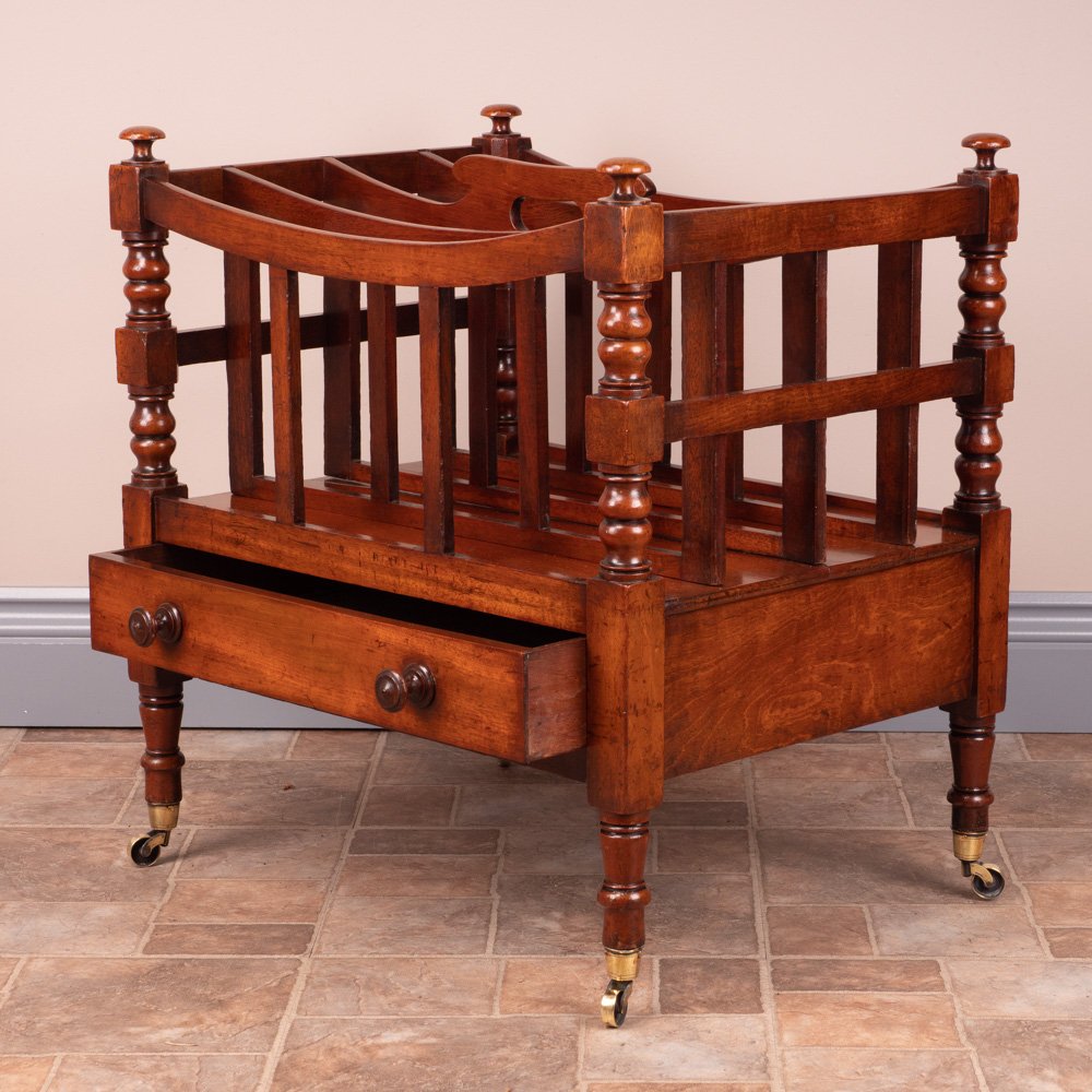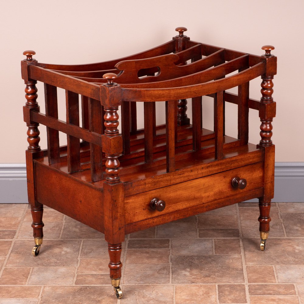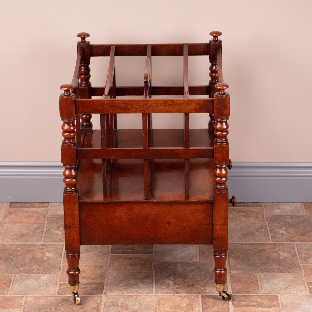 This good quality 19th Century Mahogany Canterbury, would be just the thing to tidy up all your loose magazines and papers laying around the house! With good size turned legs and frames, a sure sign of quality as dimensions of timber weren’t skimped when made. The legs show refined delicate turning, and fine finials to top off each leg.