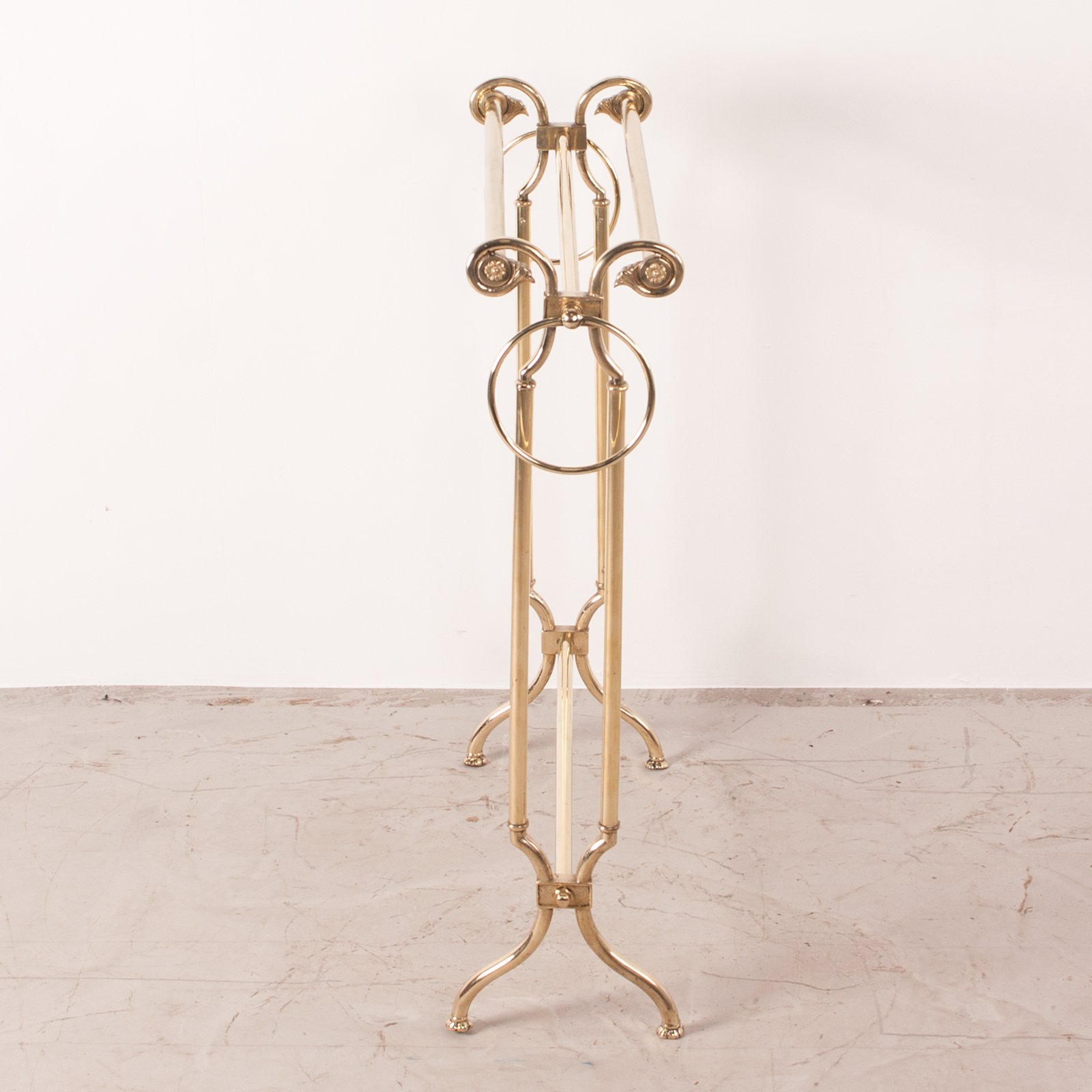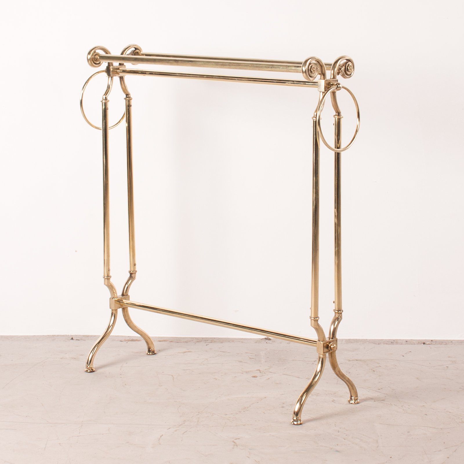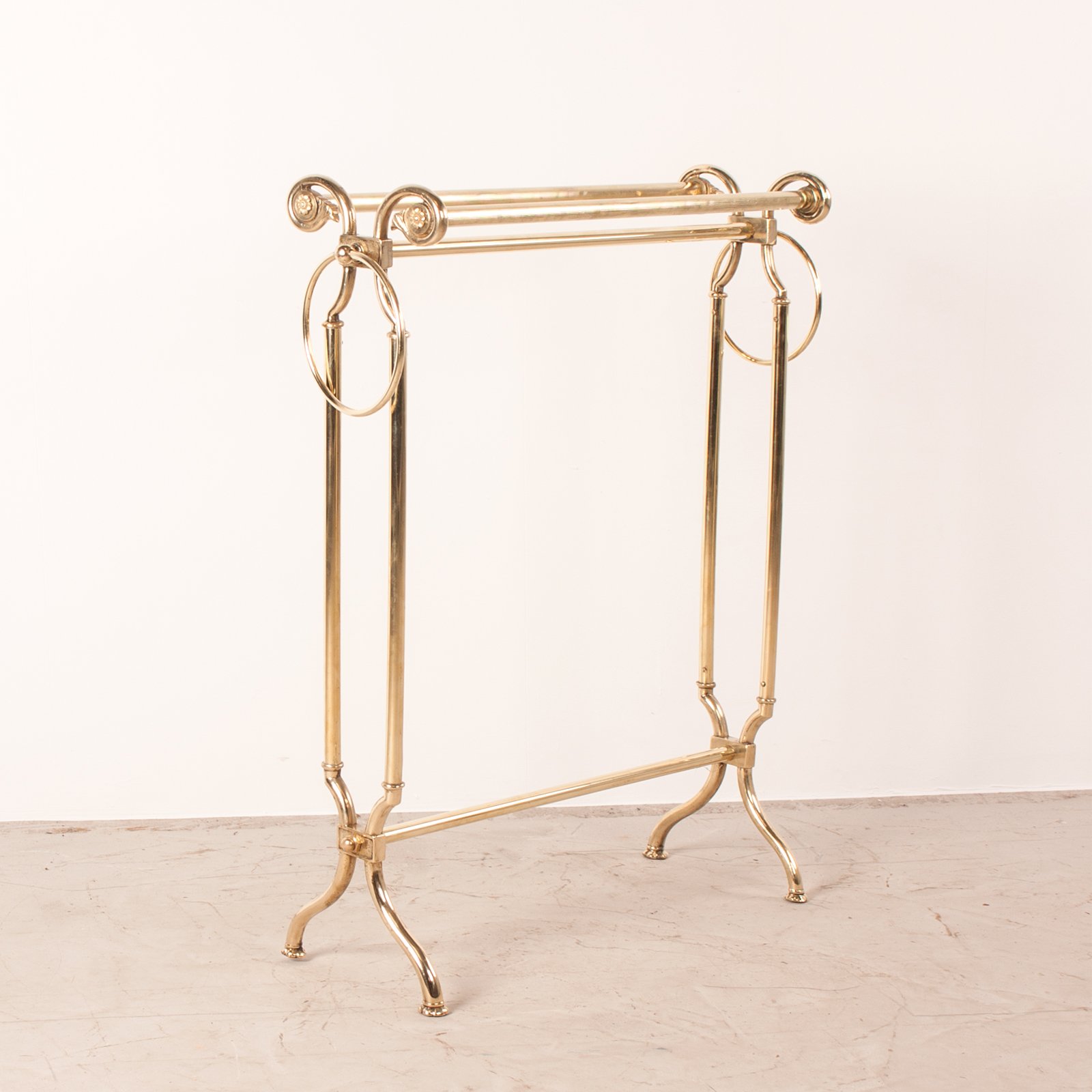 This Good Quality Continental Brass Towel Rail would make a stylish addition to any bathroom or bedroom it found itself in. The elegant swept feet then rise on round columns to the gracefully curved tops that are adorned with finely cast rosettes. The two top rails are of a fluted finish to stop the towels sliding off which is a lovely touch.