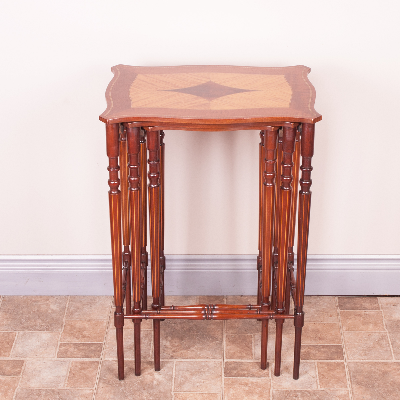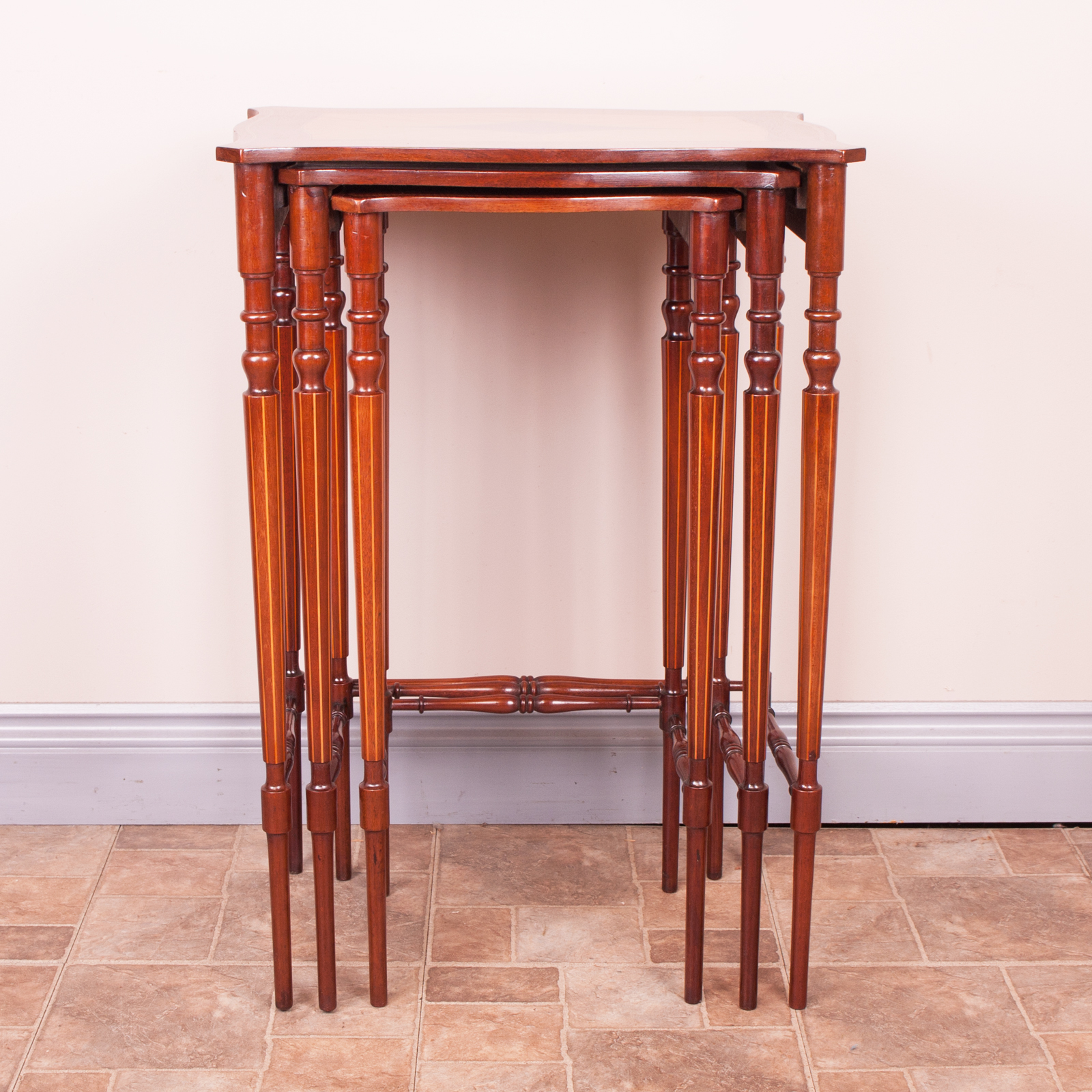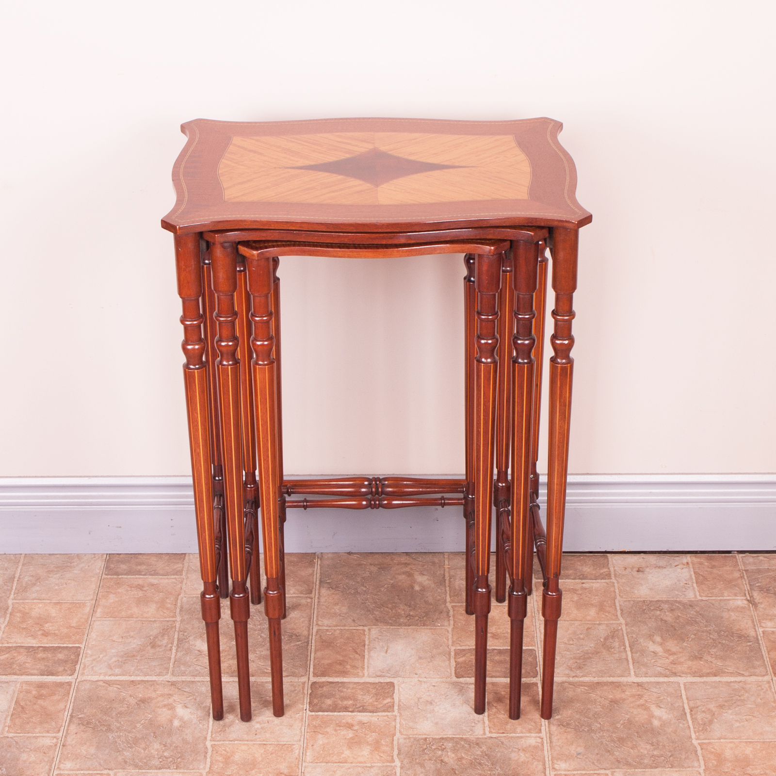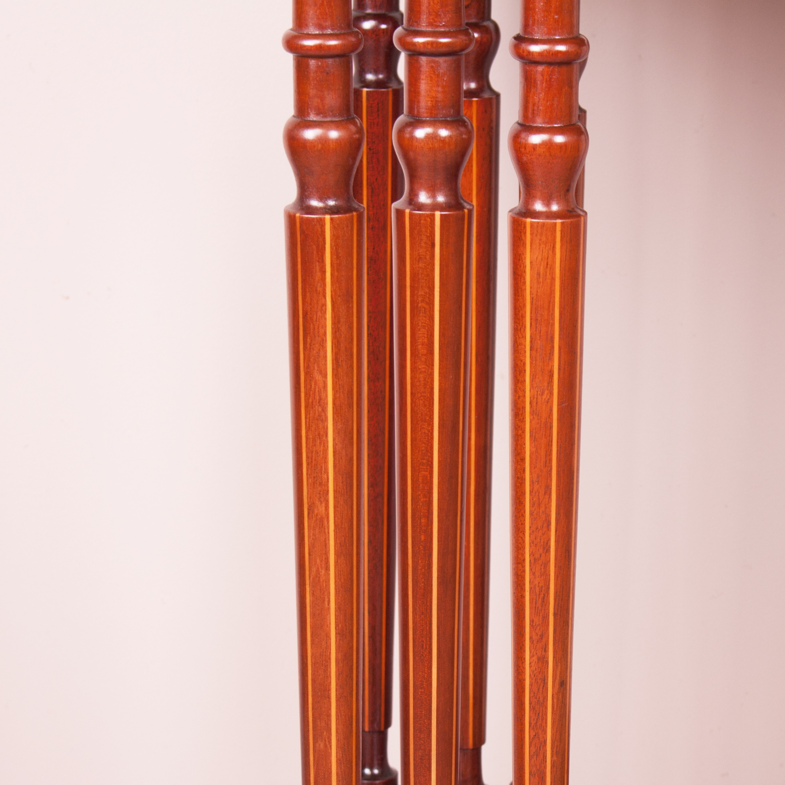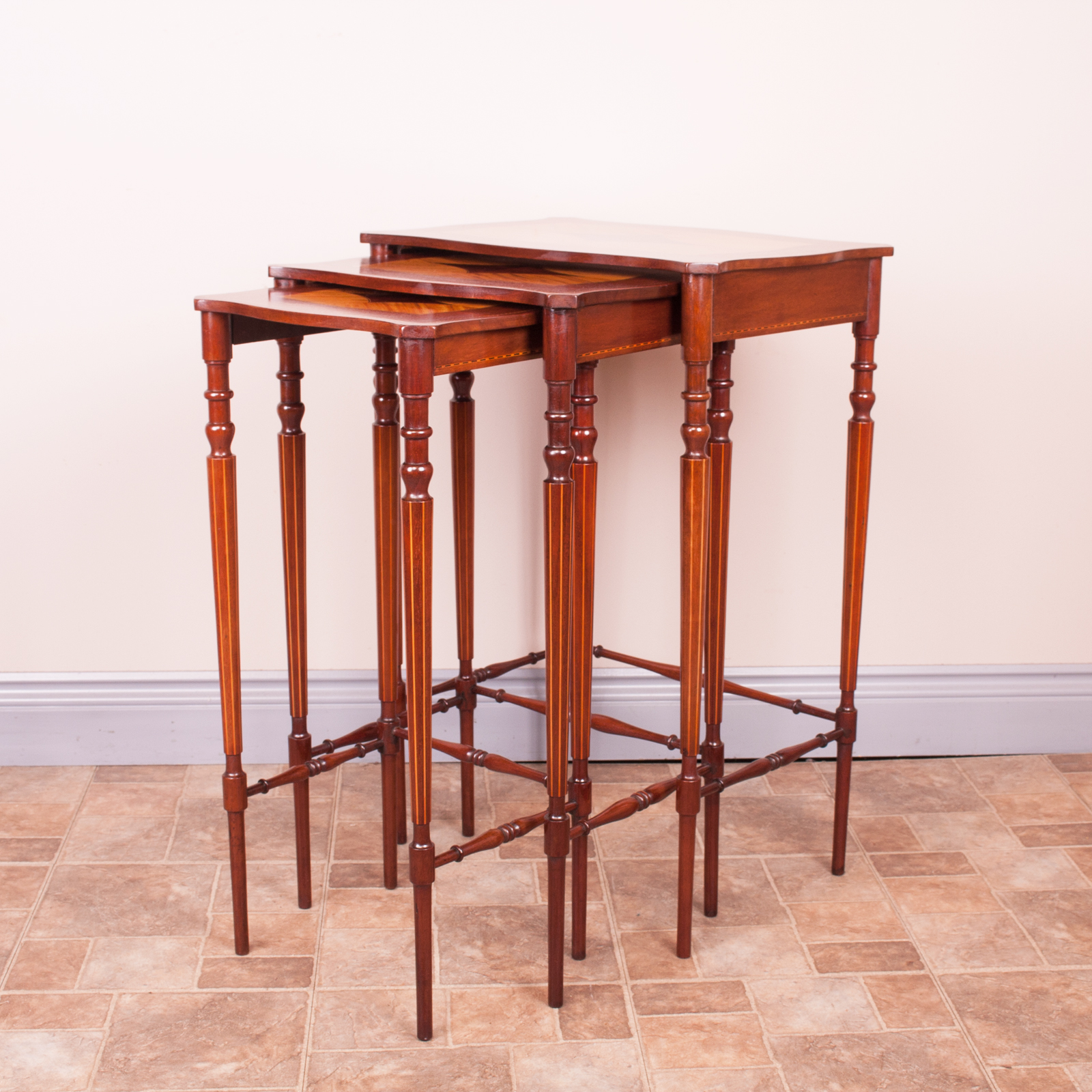This Good Quality Inlaid Mahogany Nest of Tables have plenty of design details to enjoy. Standing on very elegant turned legs that have decorative inlaid lines in them, with finely turned stretcher rails. The side rails are also inlaid with a decorative banding.