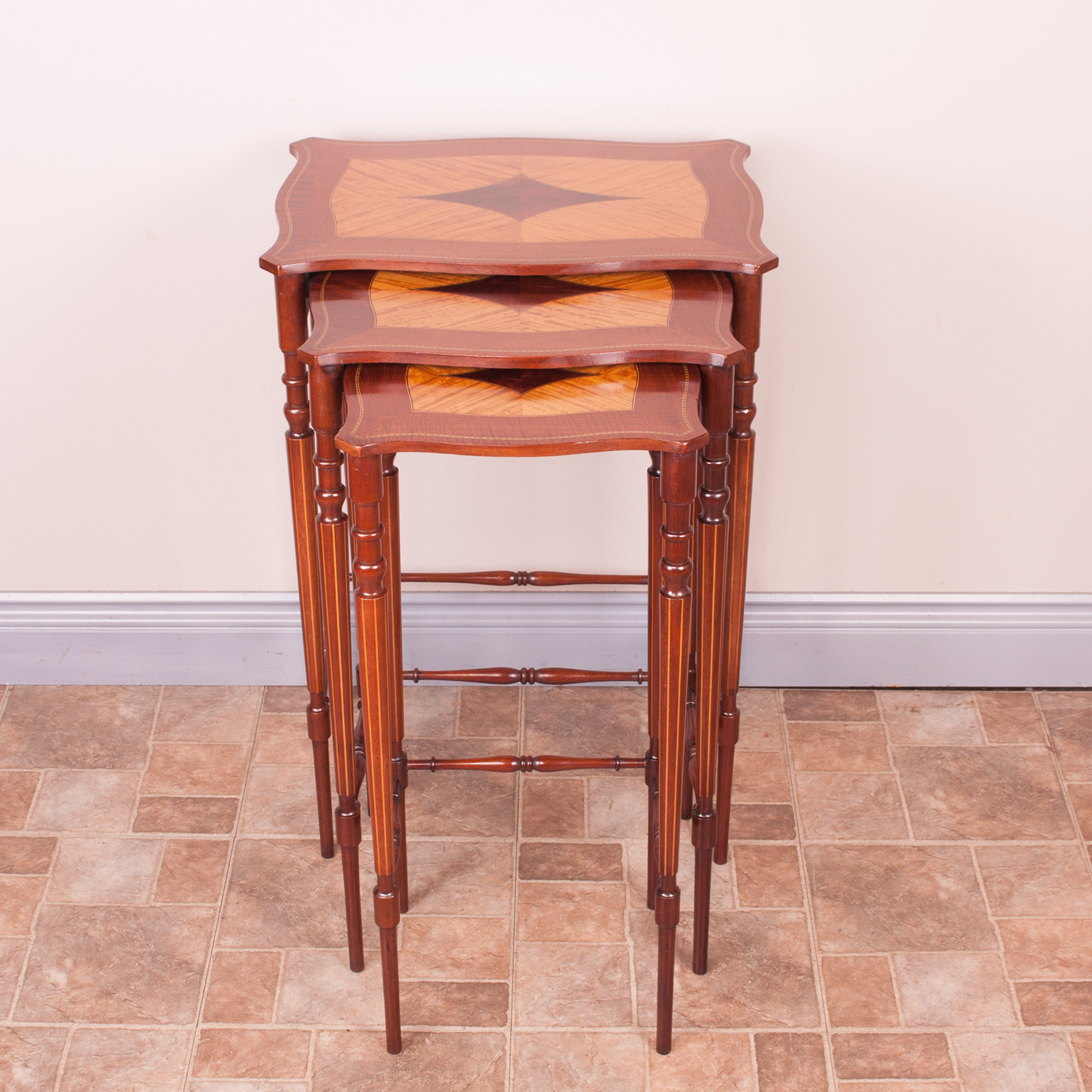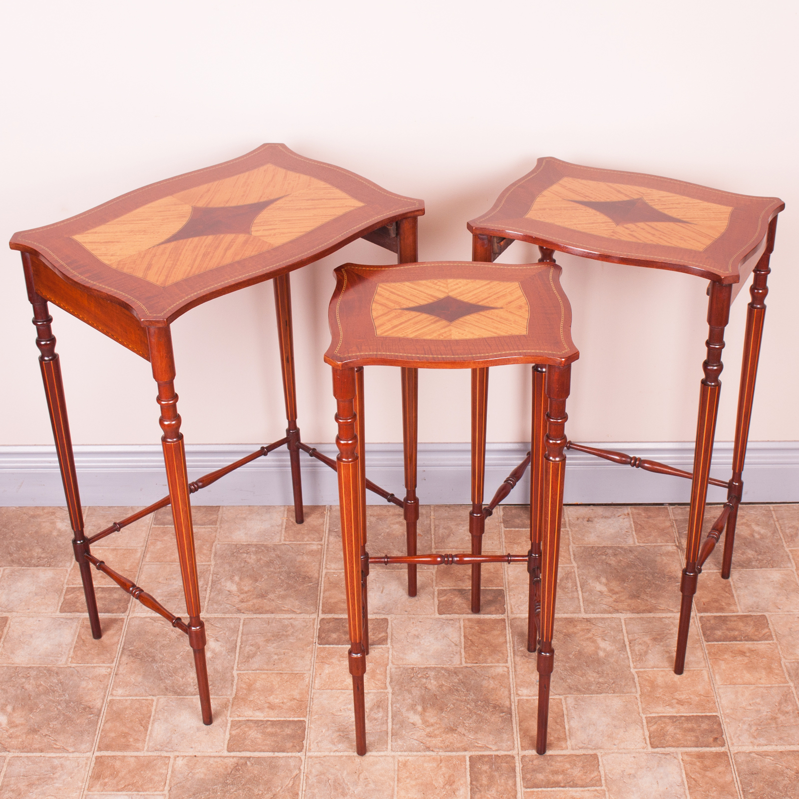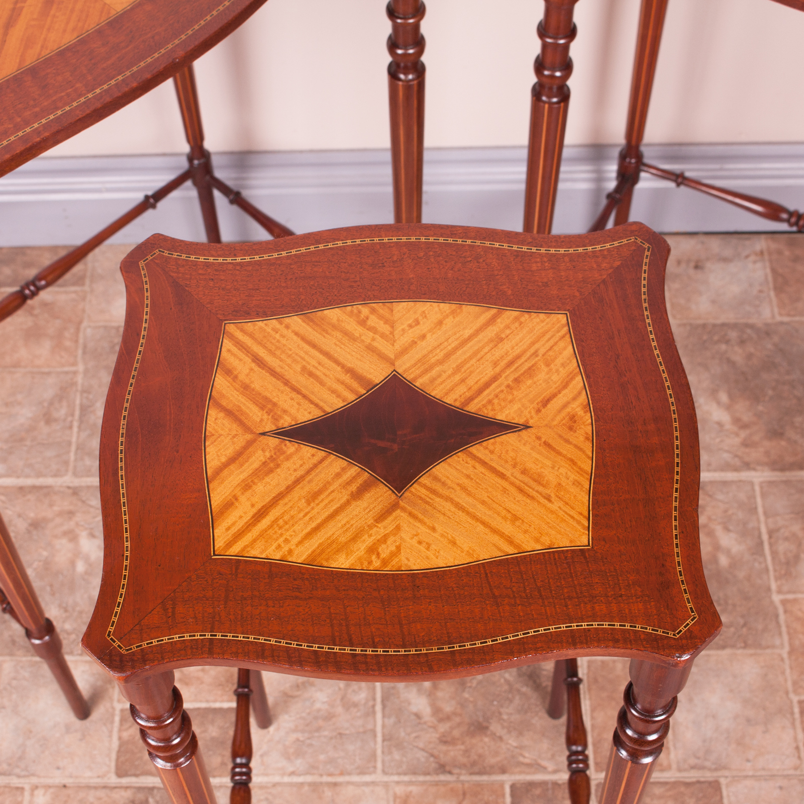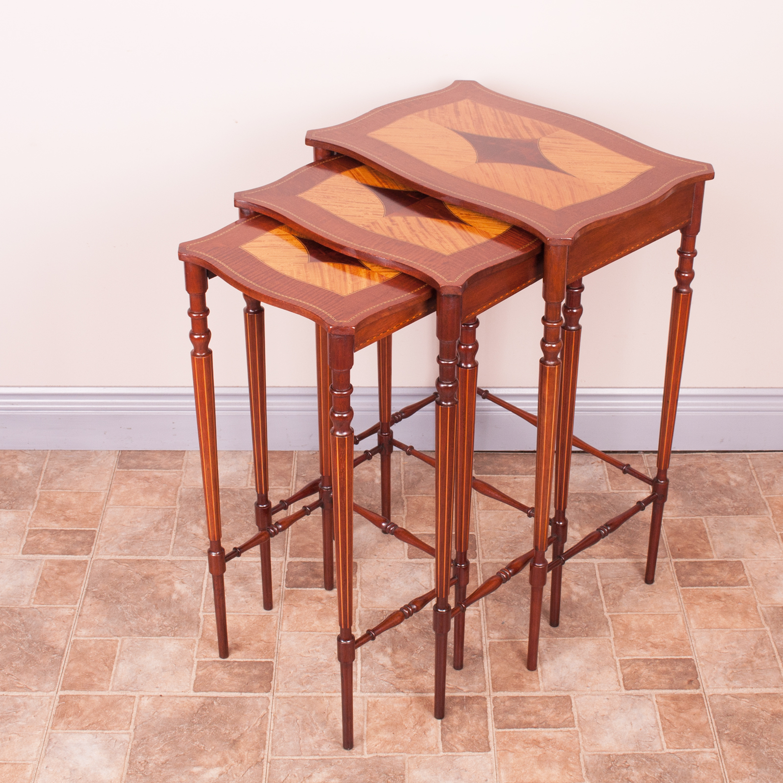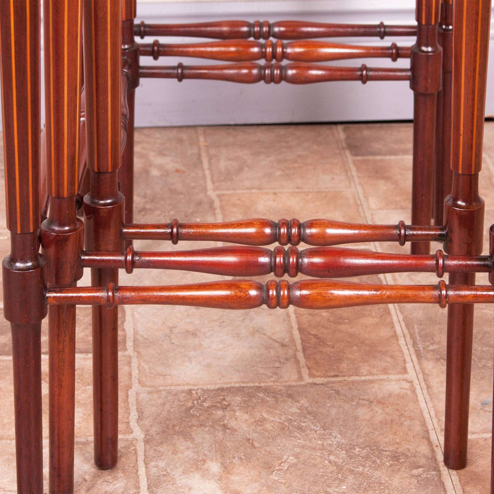 This Good Quality Inlaid Mahogany Nest of Tables have plenty of design details to enjoy. Standing on very elegant turned legs that have decorative inlaid lines in them, with finely turned stretcher rails. The side rails are also inlaid with a decorative banding.