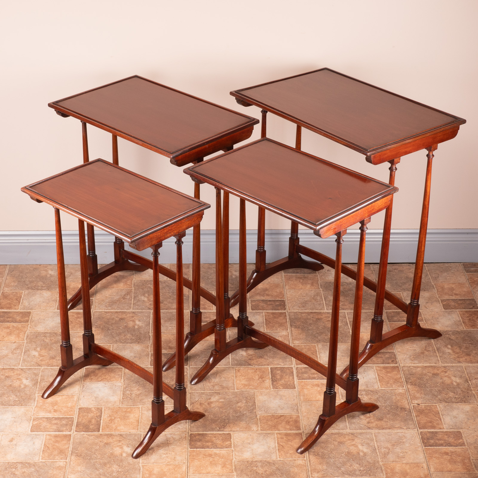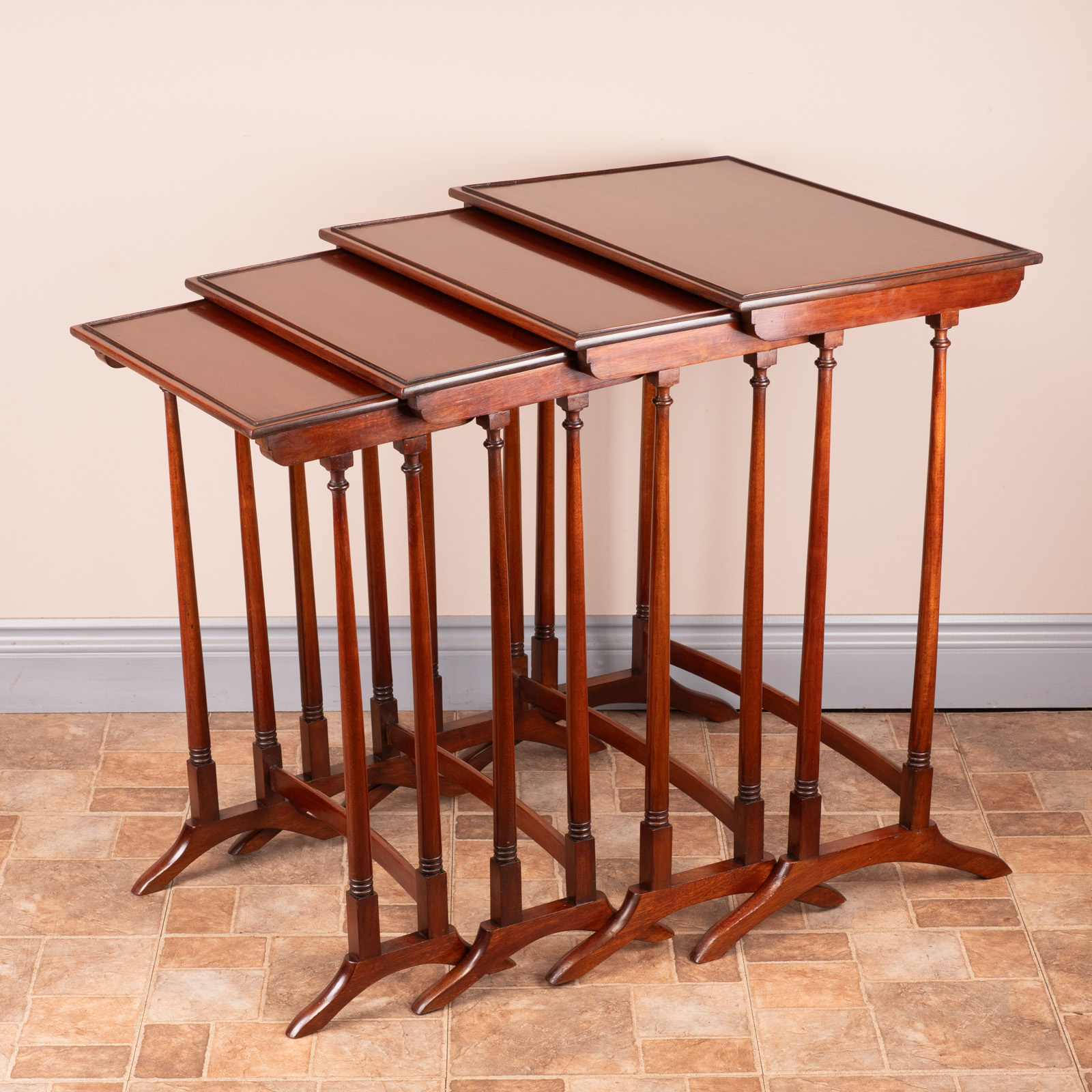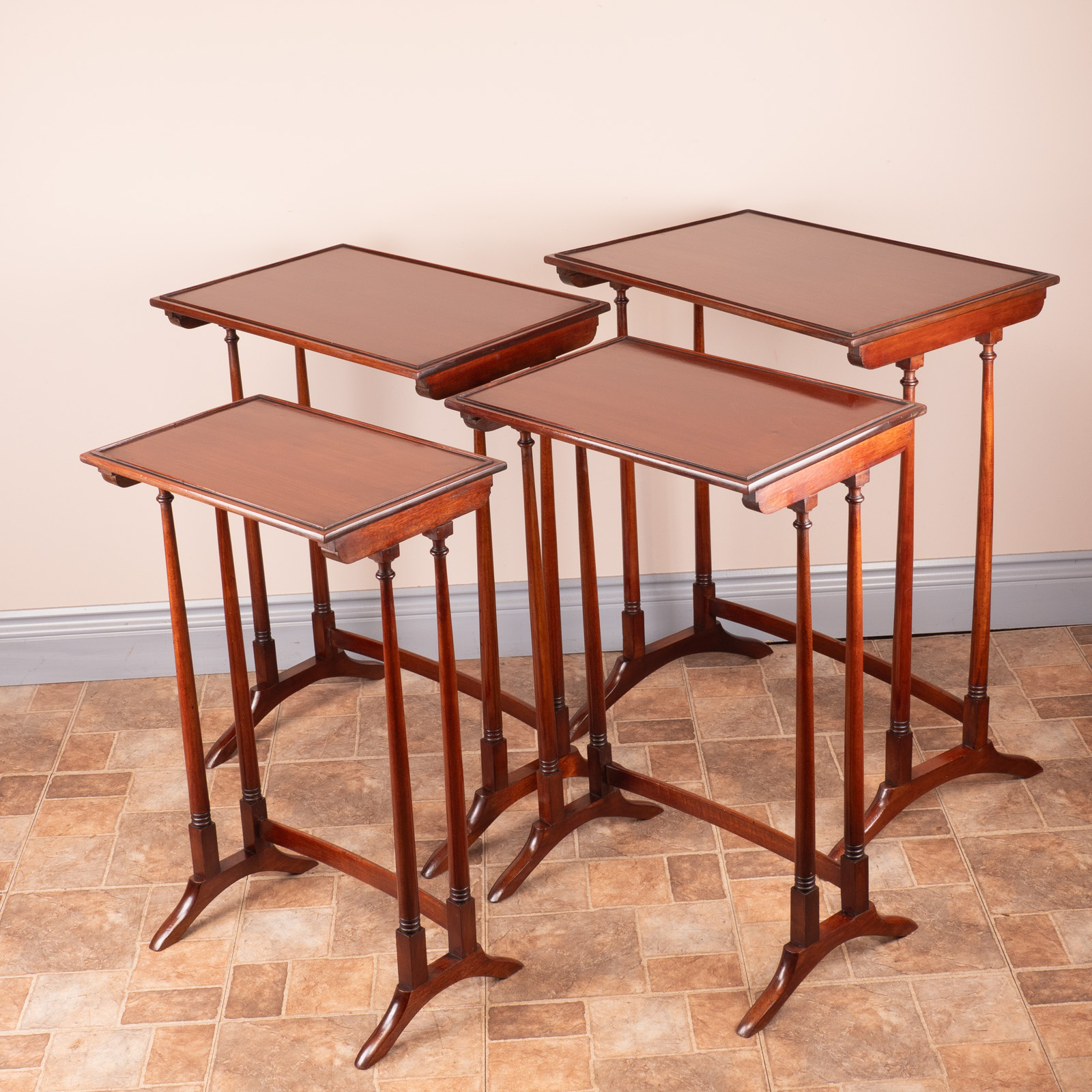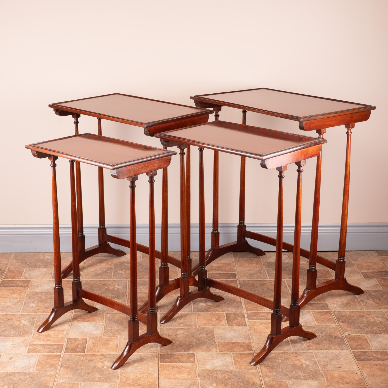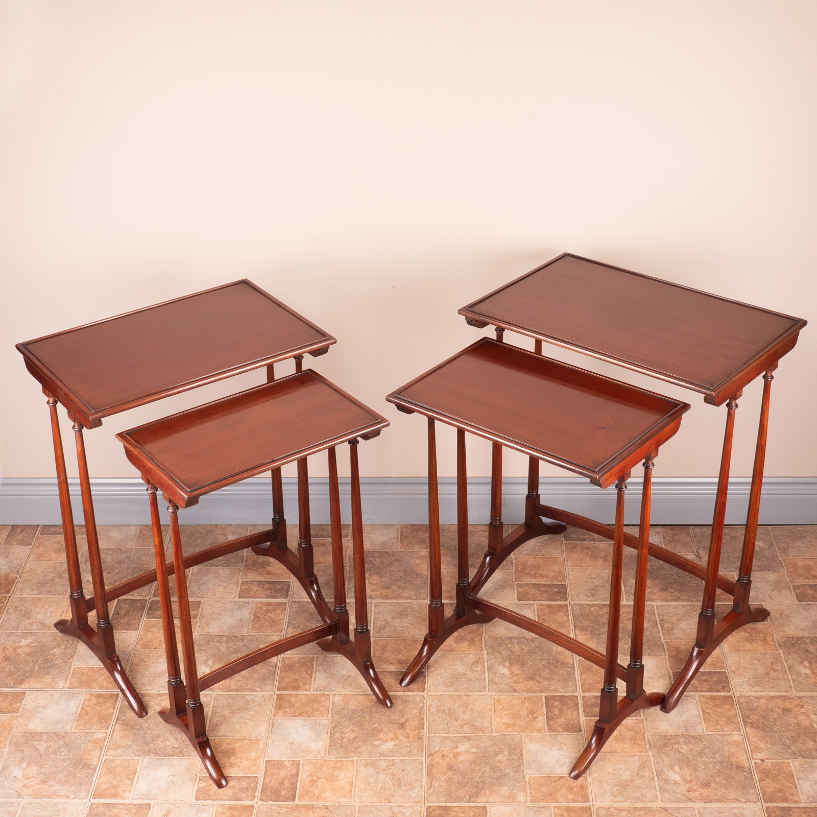 This Good Quality Mahogany Quartetto Nest Of Tables are very stylish, along with being extremely useful. Standing on elegant turned supports that lead down to a finely shaped foot. A curved stretcher rail keeps everything sturdy.