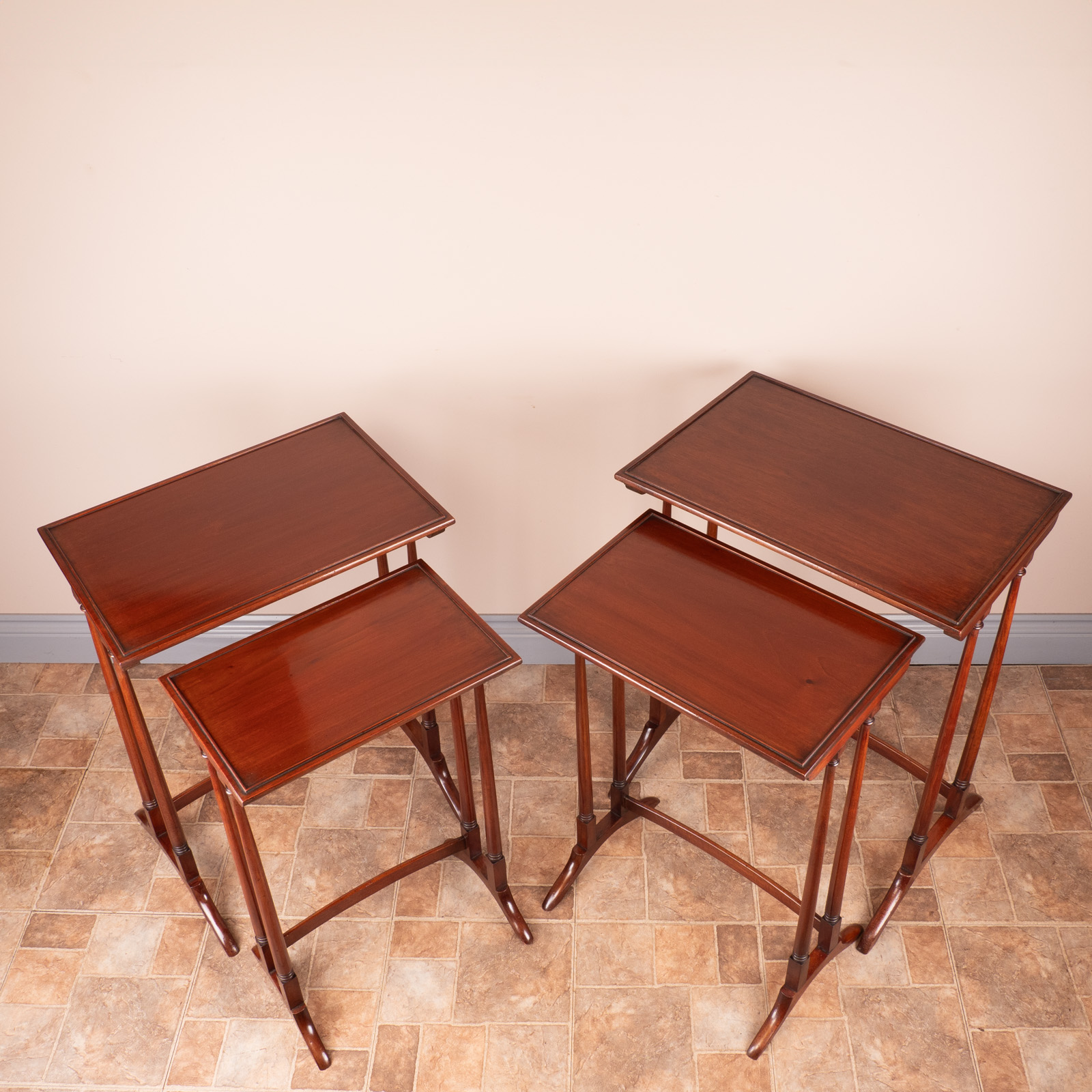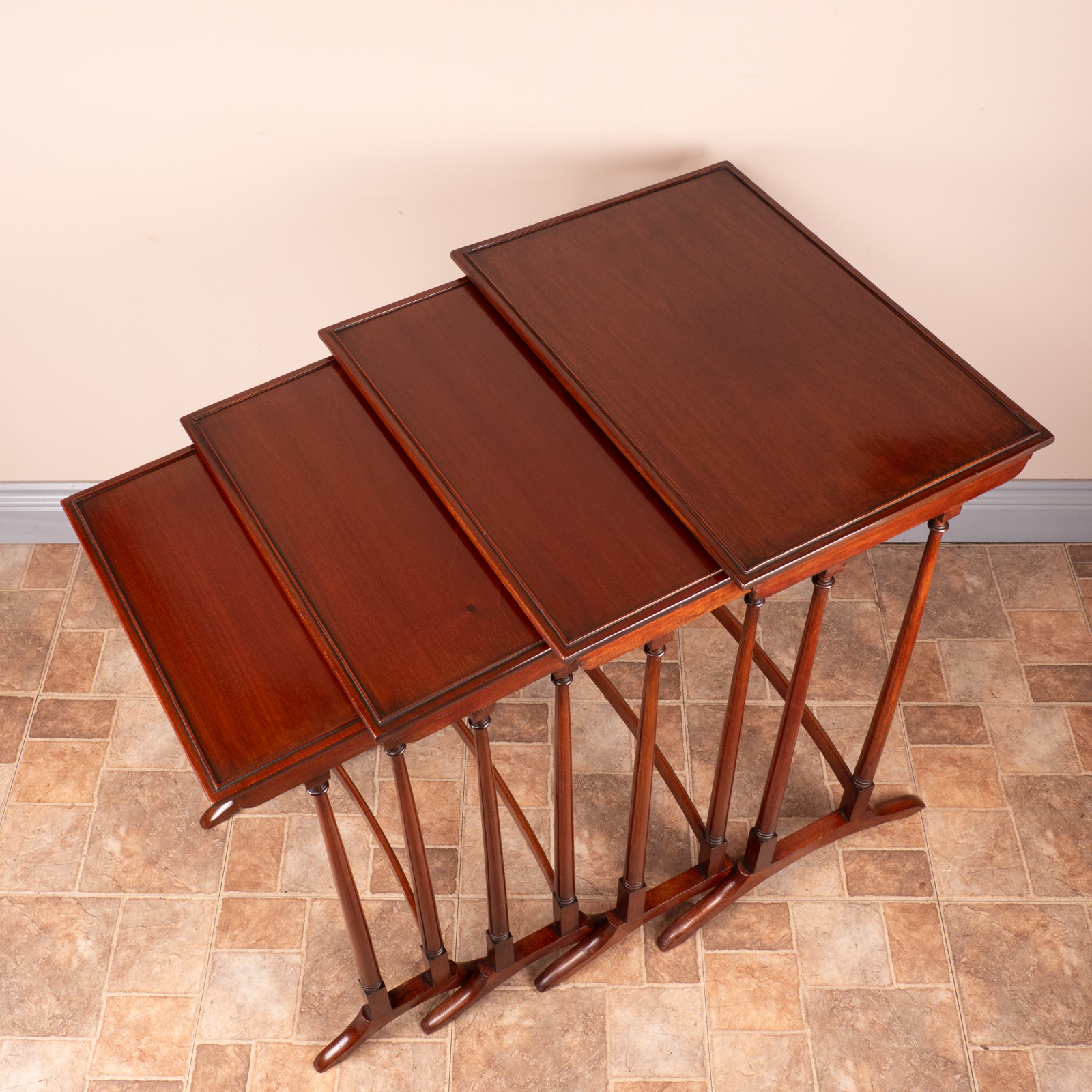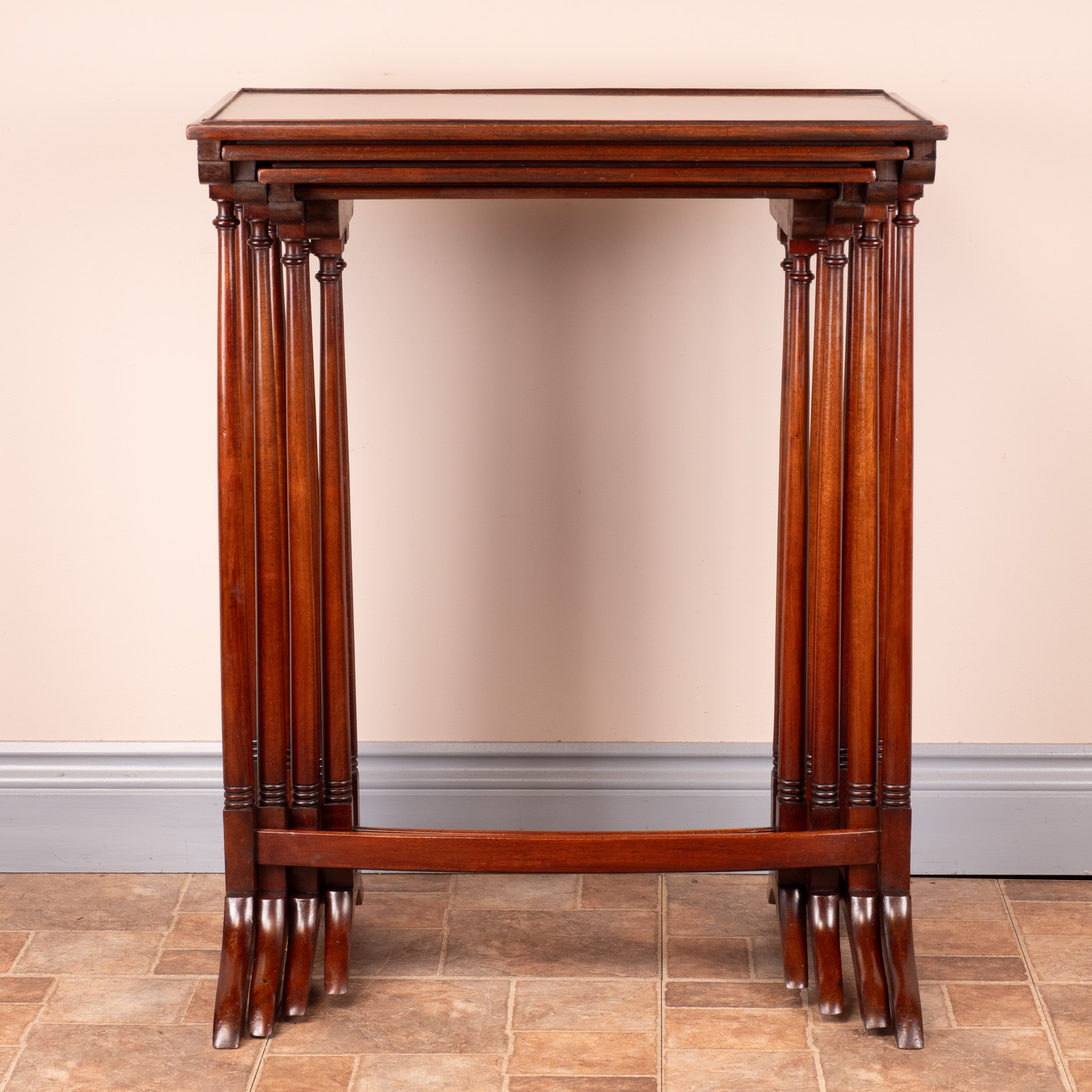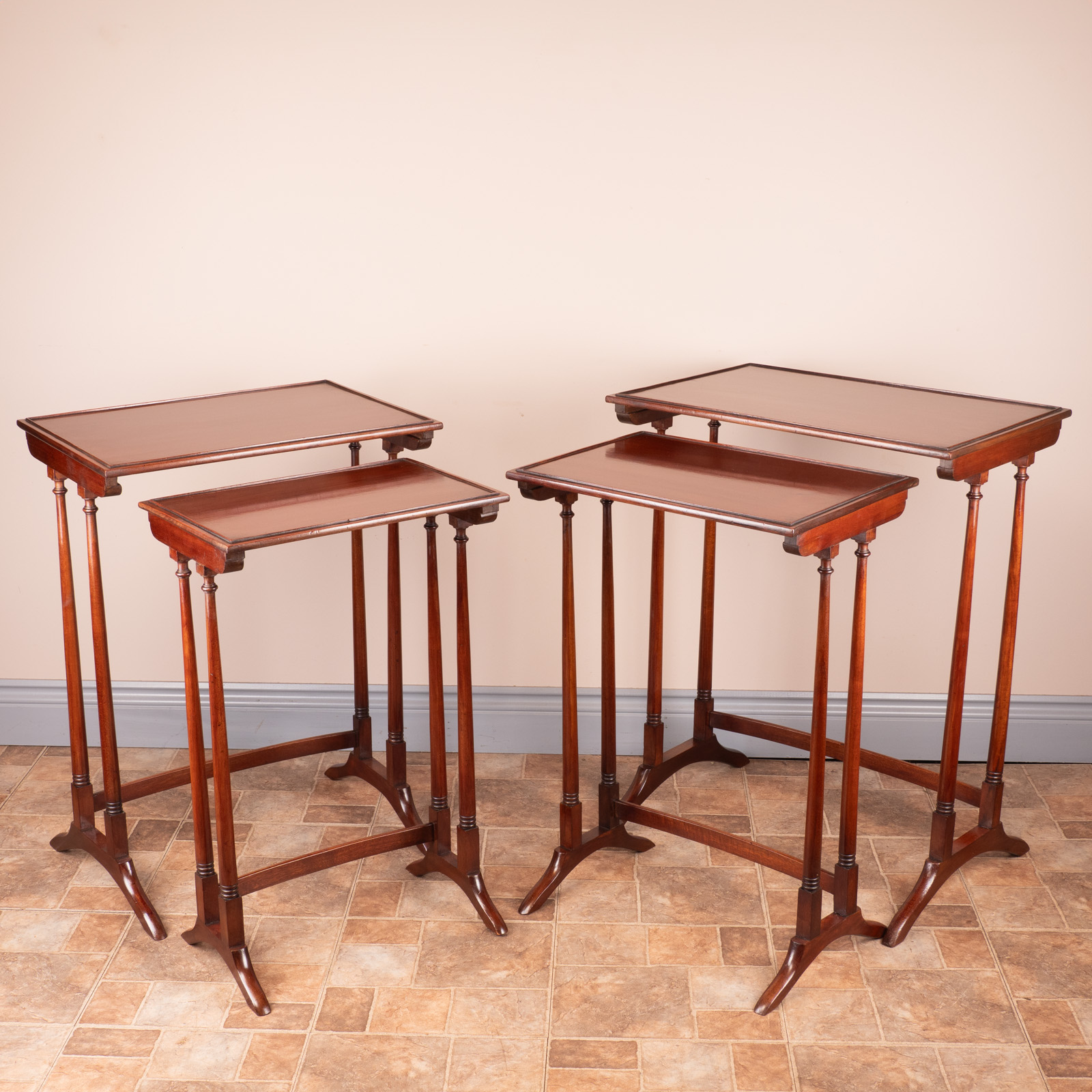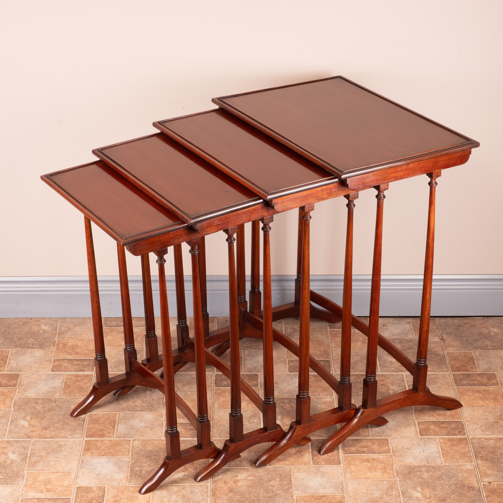 This Good Quality Mahogany Quartetto Nest Of Tables are very stylish, along with being extremely useful. Standing on elegant turned supports that lead down to a finely shaped foot. A curved stretcher rail keeps everything sturdy.
