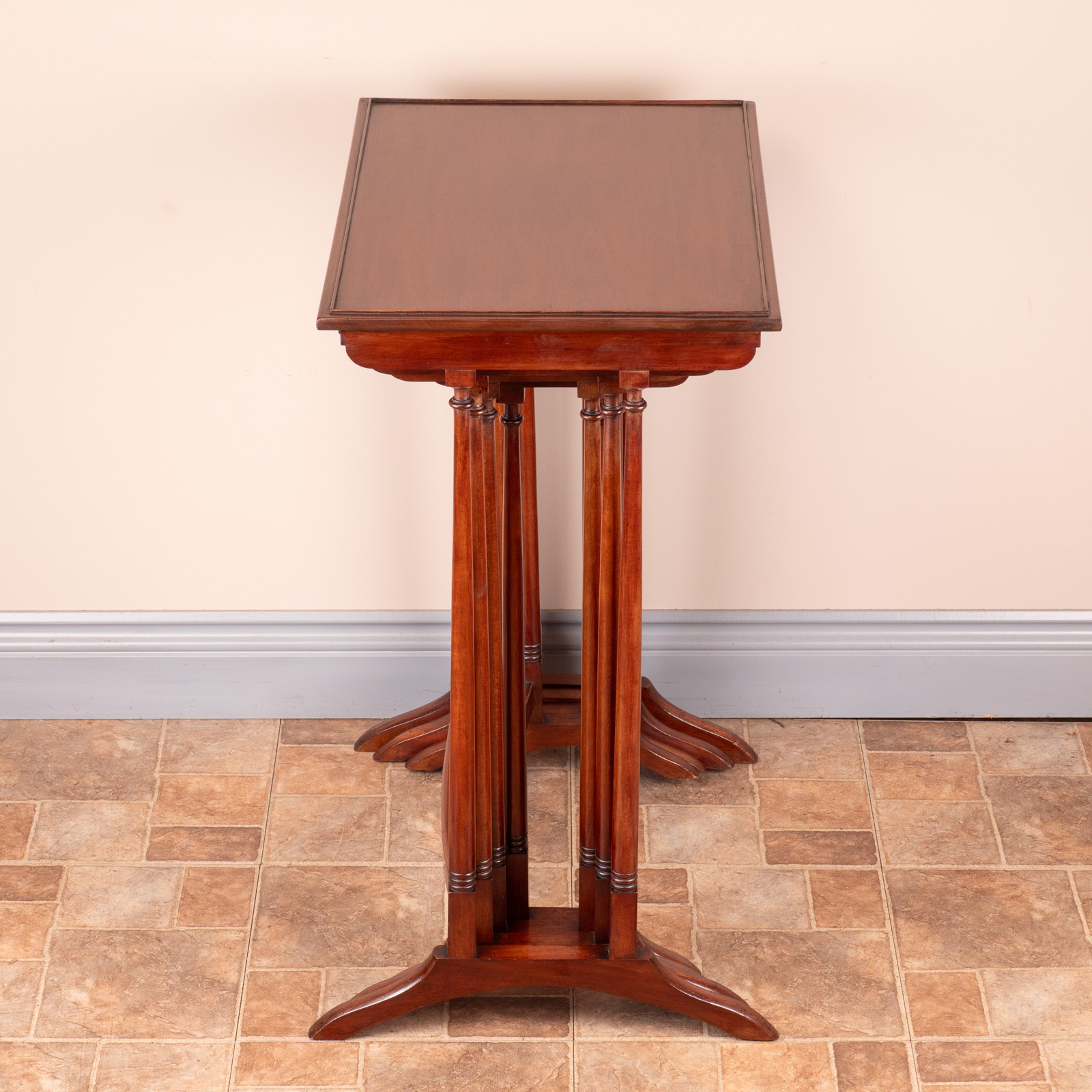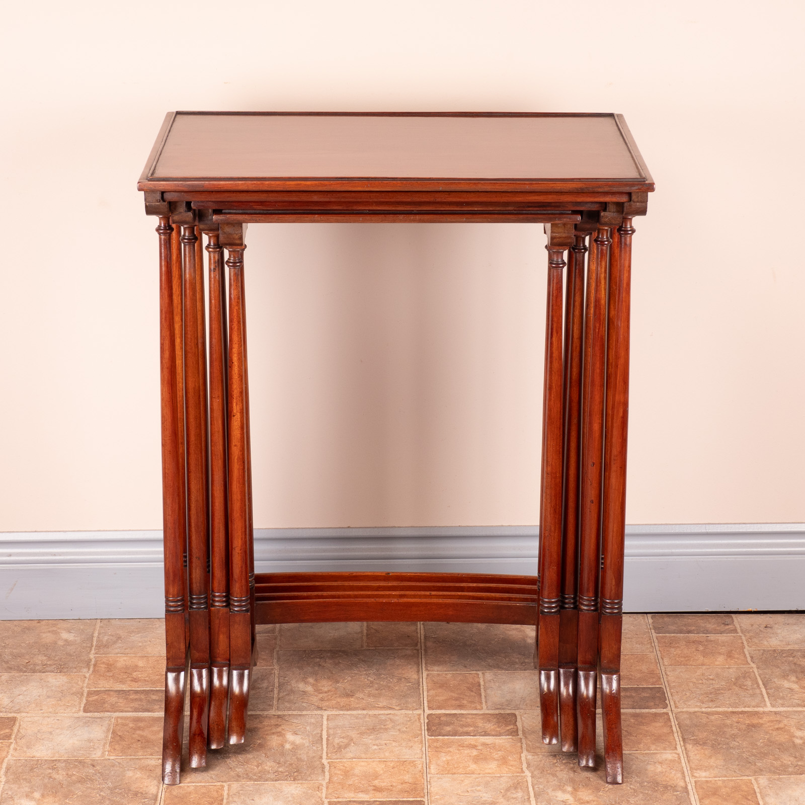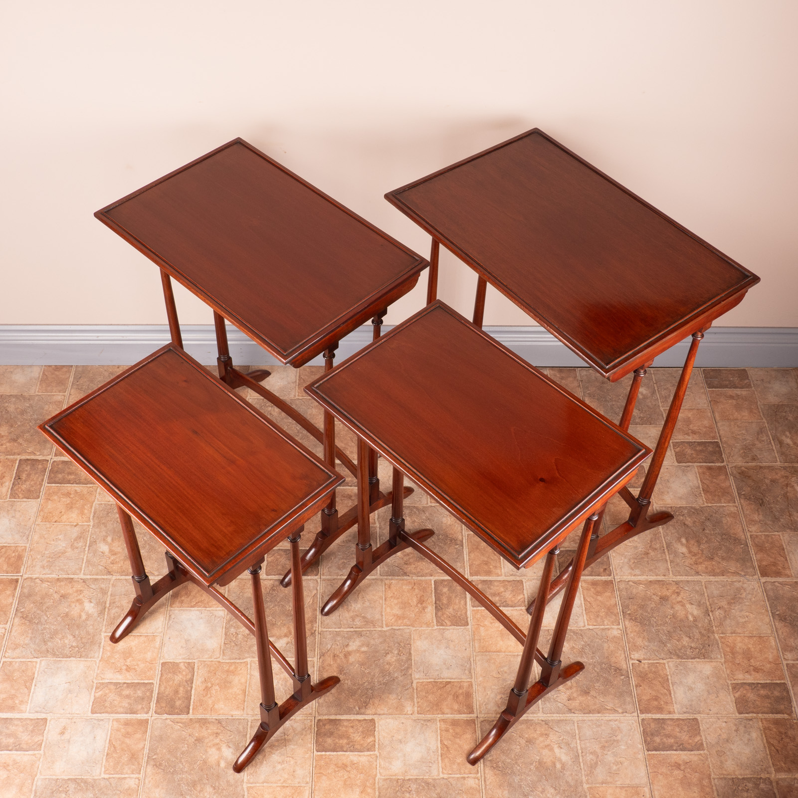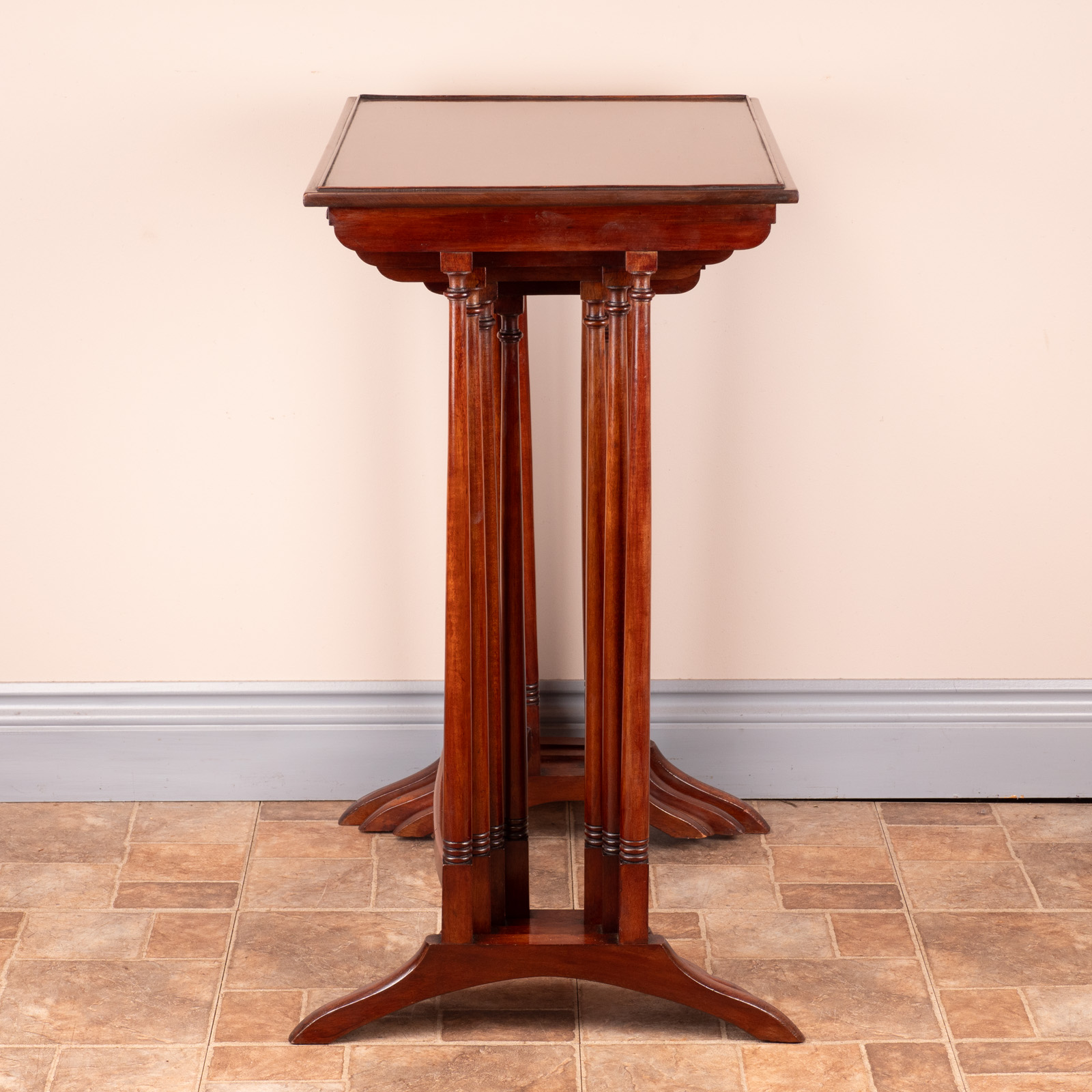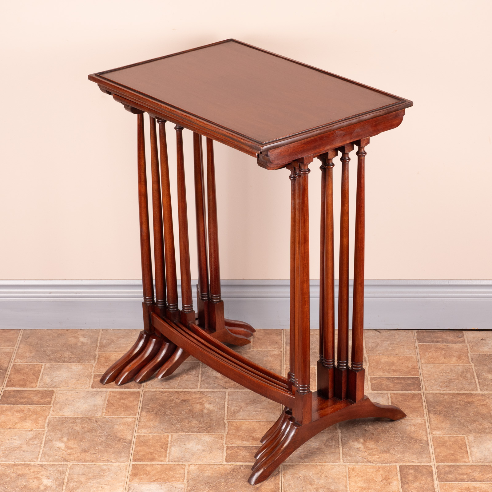 This Good Quality Mahogany Quartetto Nest Of Tables are very stylish, along with being extremely useful. Standing on elegant turned supports that lead down to a finely shaped foot. A curved stretcher rail keeps everything sturdy.