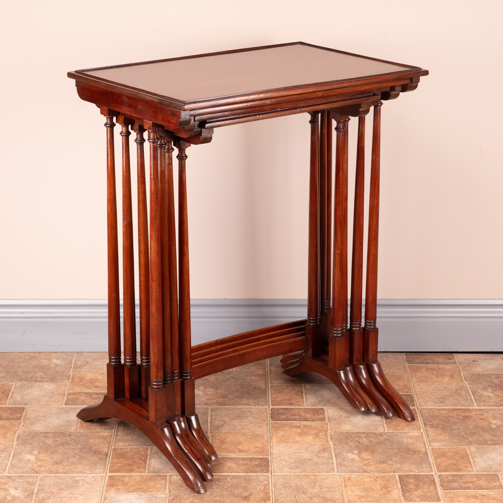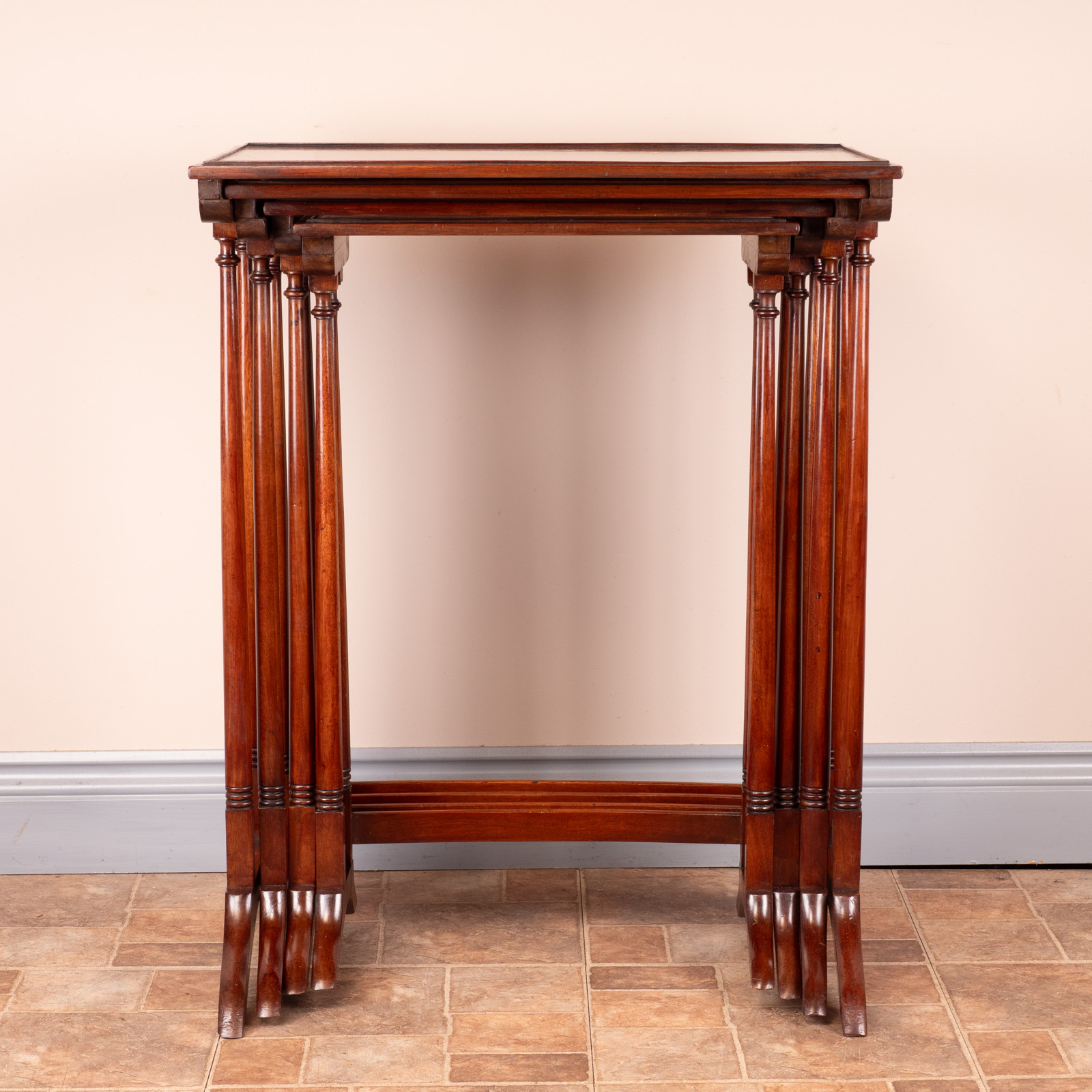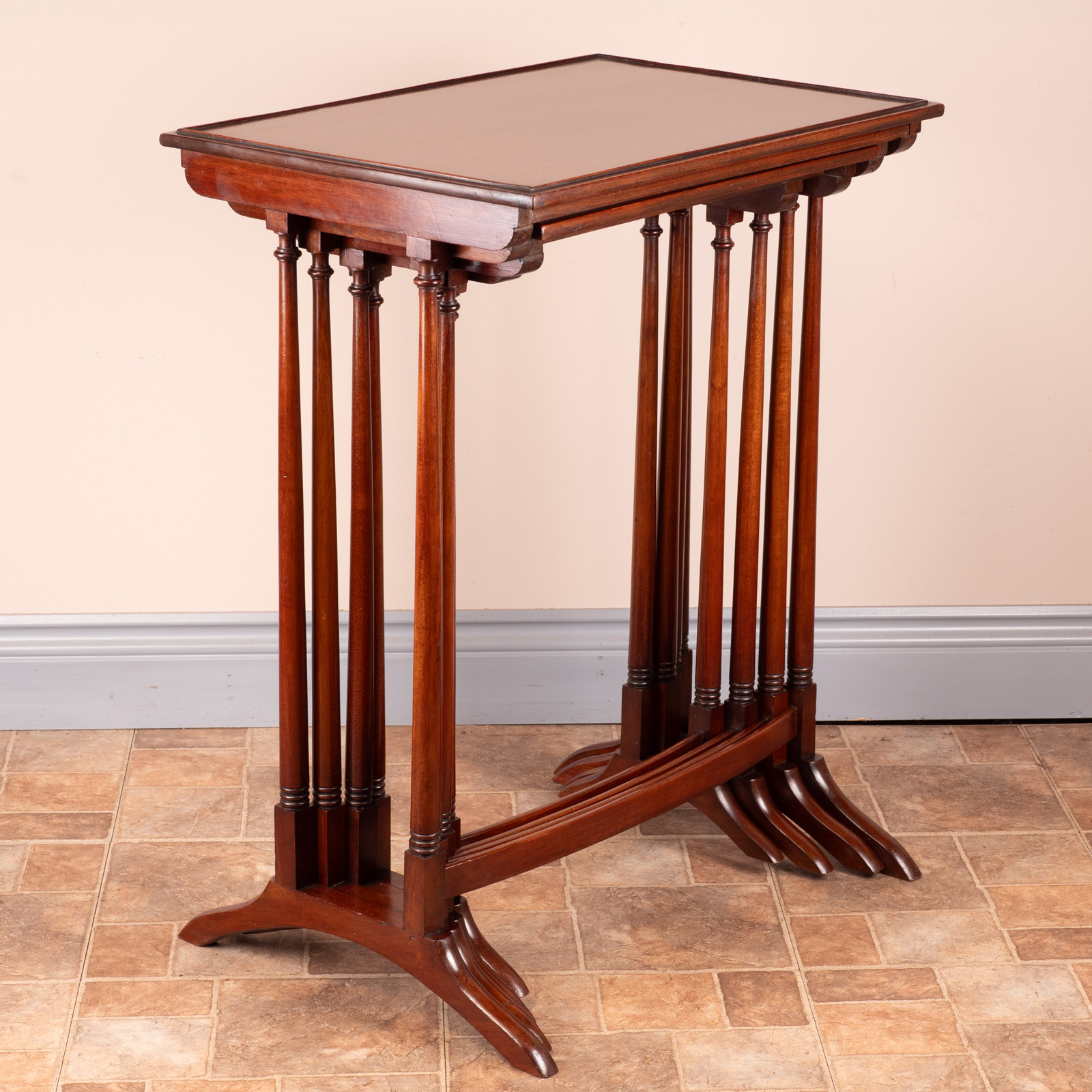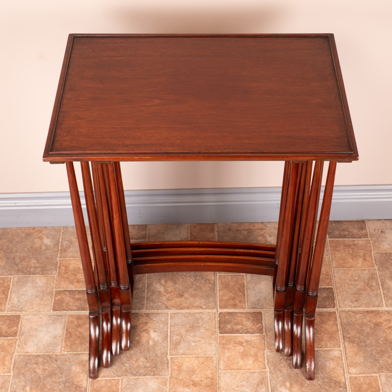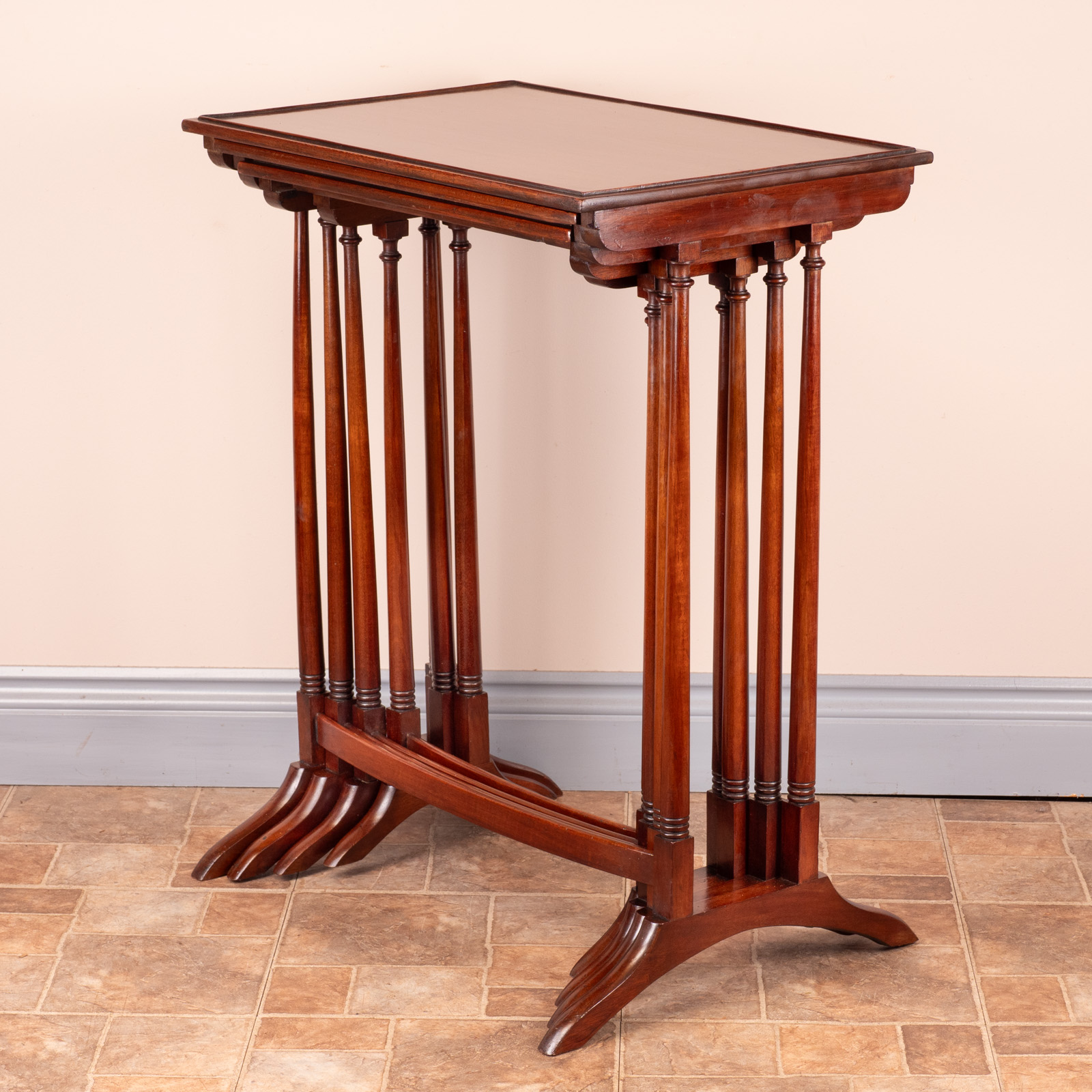This Good Quality Mahogany Quartetto Nest Of Tables are very stylish, along with being extremely useful. Standing on elegant turned supports that lead down to a finely shaped foot. A curved stretcher rail keeps everything sturdy.