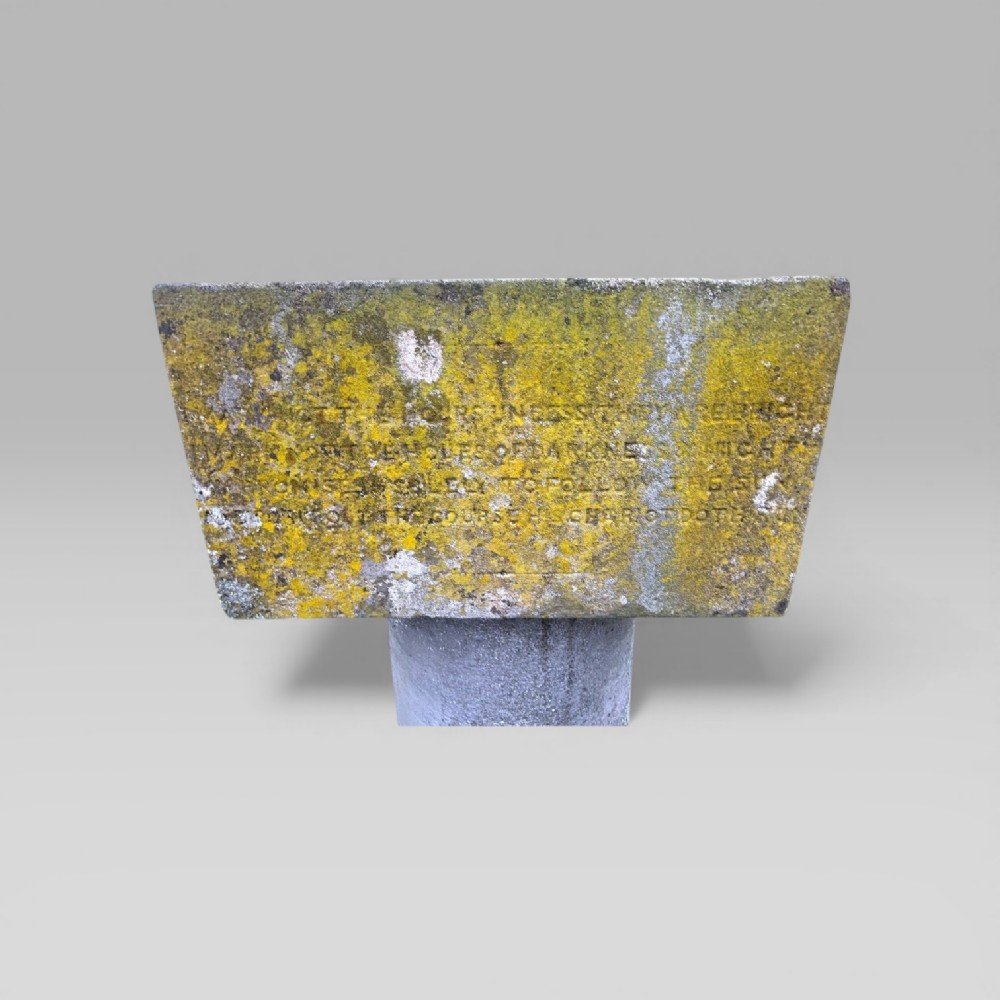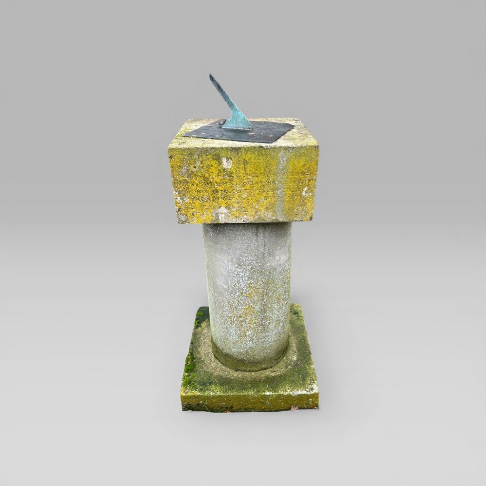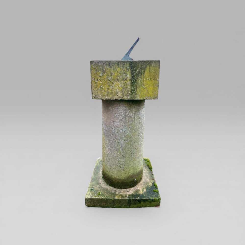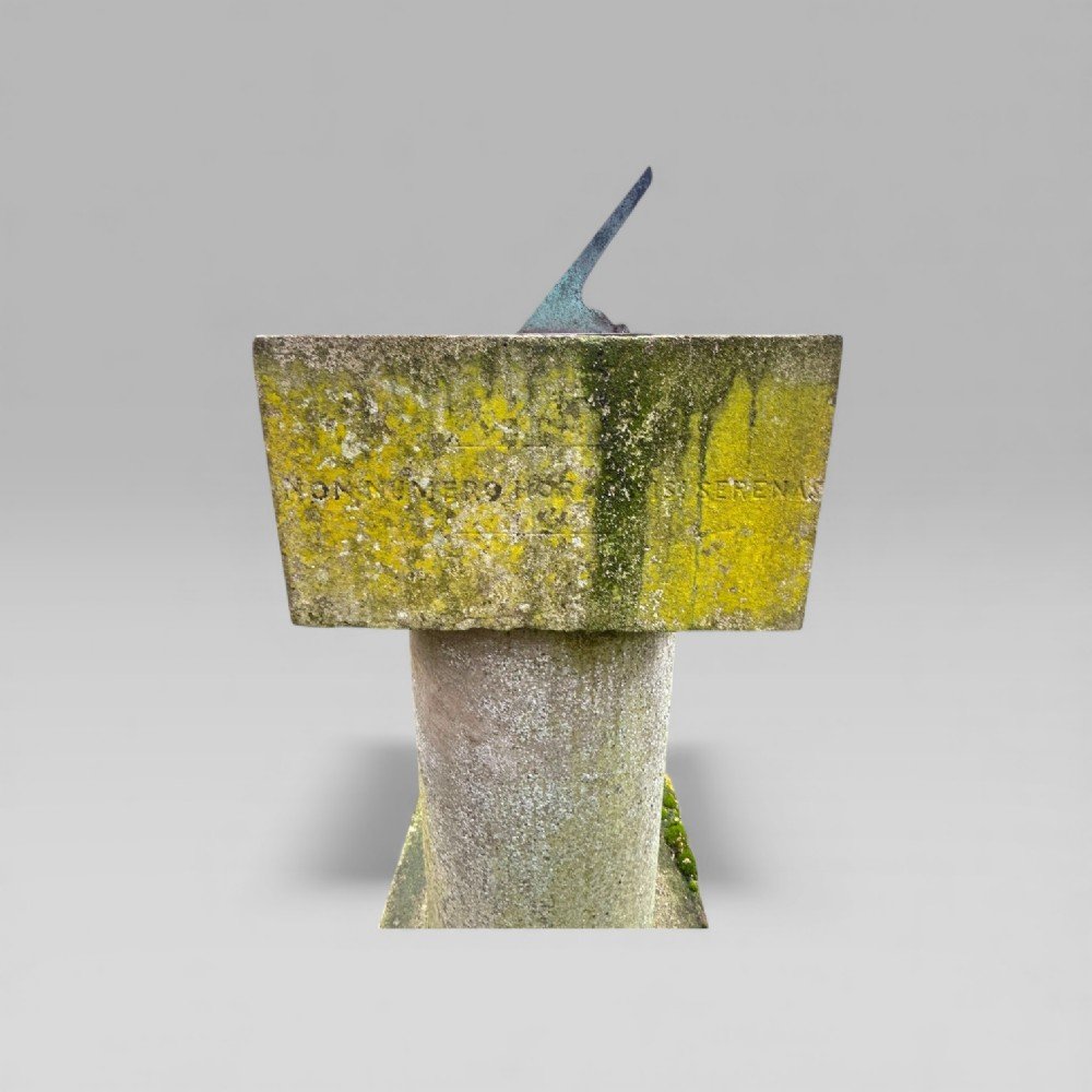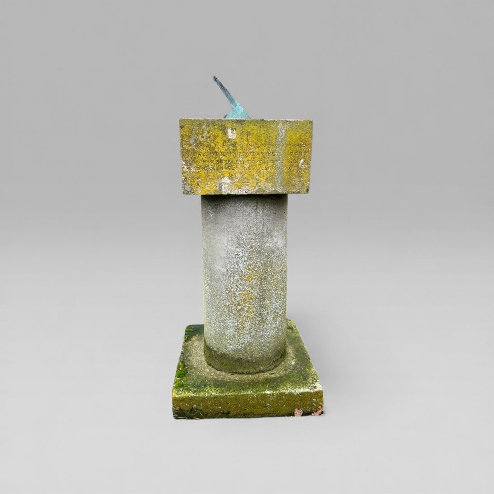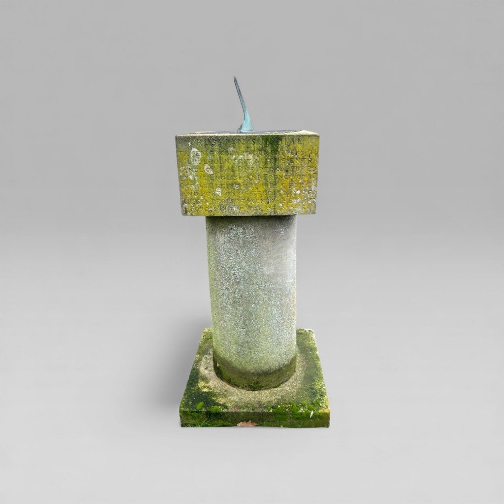 This sundial has been part of a private collection for over 50 years, the current owner acquired it at a house auction in the West Suffolk village of Brandon in the 1970s, in an overgrown garden. Mounted on a stone column, the sundial features two distinct inscriptions: