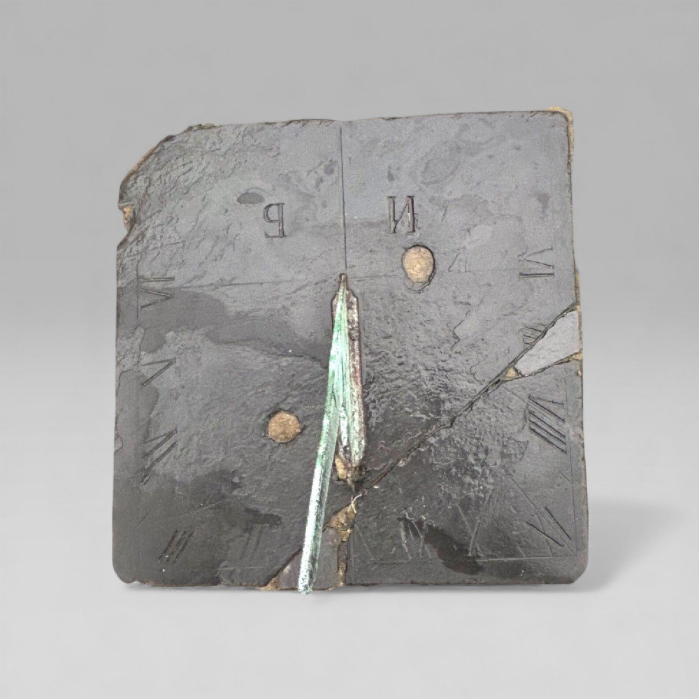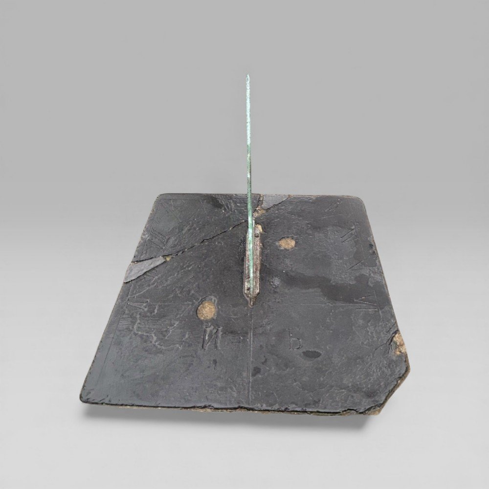 A horizontal sundial, with roman numerals from 6 am to 6 pm, made from slate. With two Cyrillic inscriptions, ? – ‘I’ and ? - ‘be’, are believed to be the inscriptions of a maker.