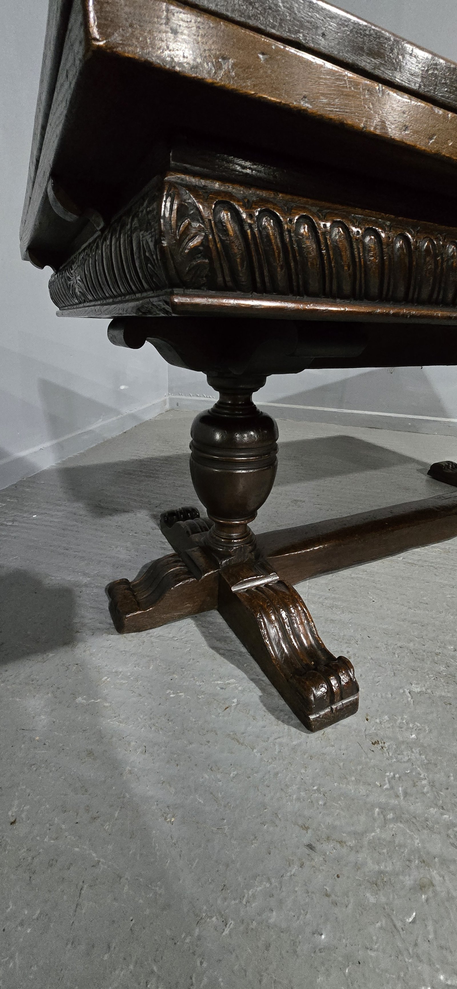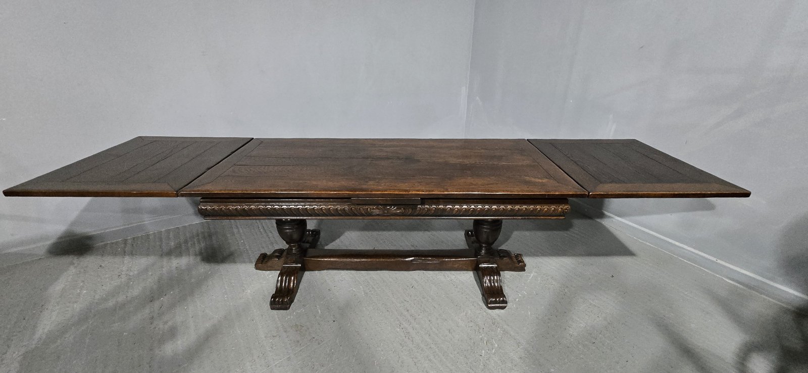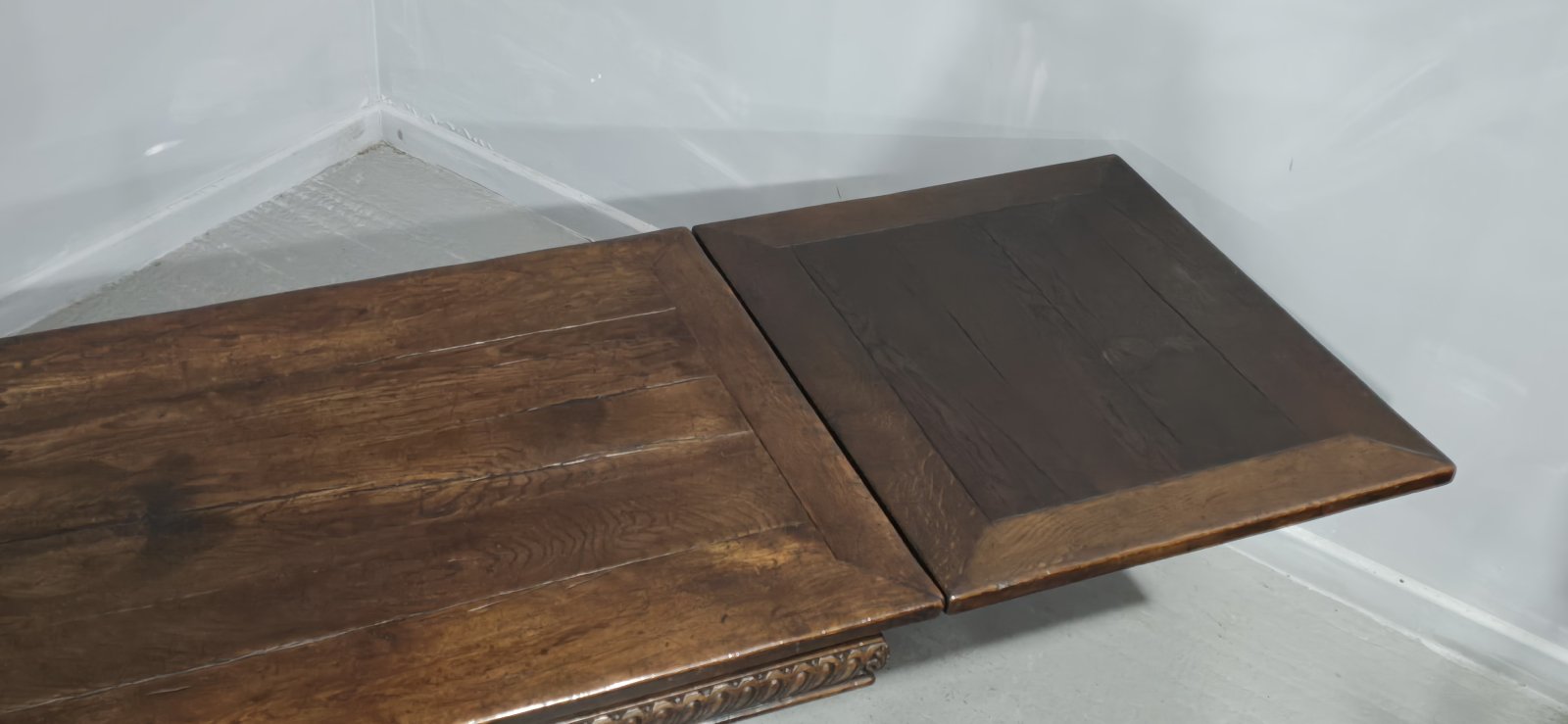 A superb huge Elizabethan style extending draw leaf double pedestal oak dining table, 2 inch thick top, peg jointed throughout, carved freize, lovely home ready condition.