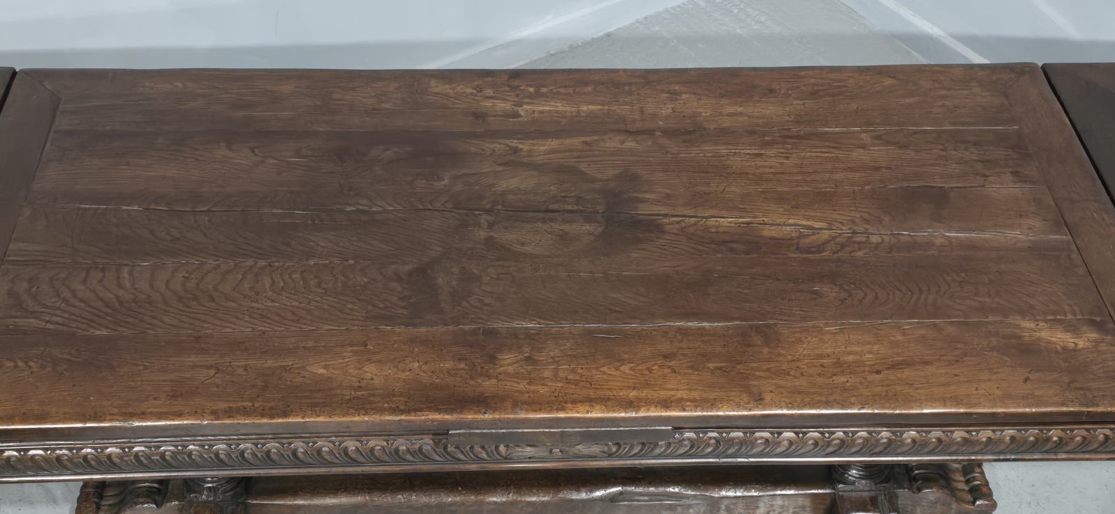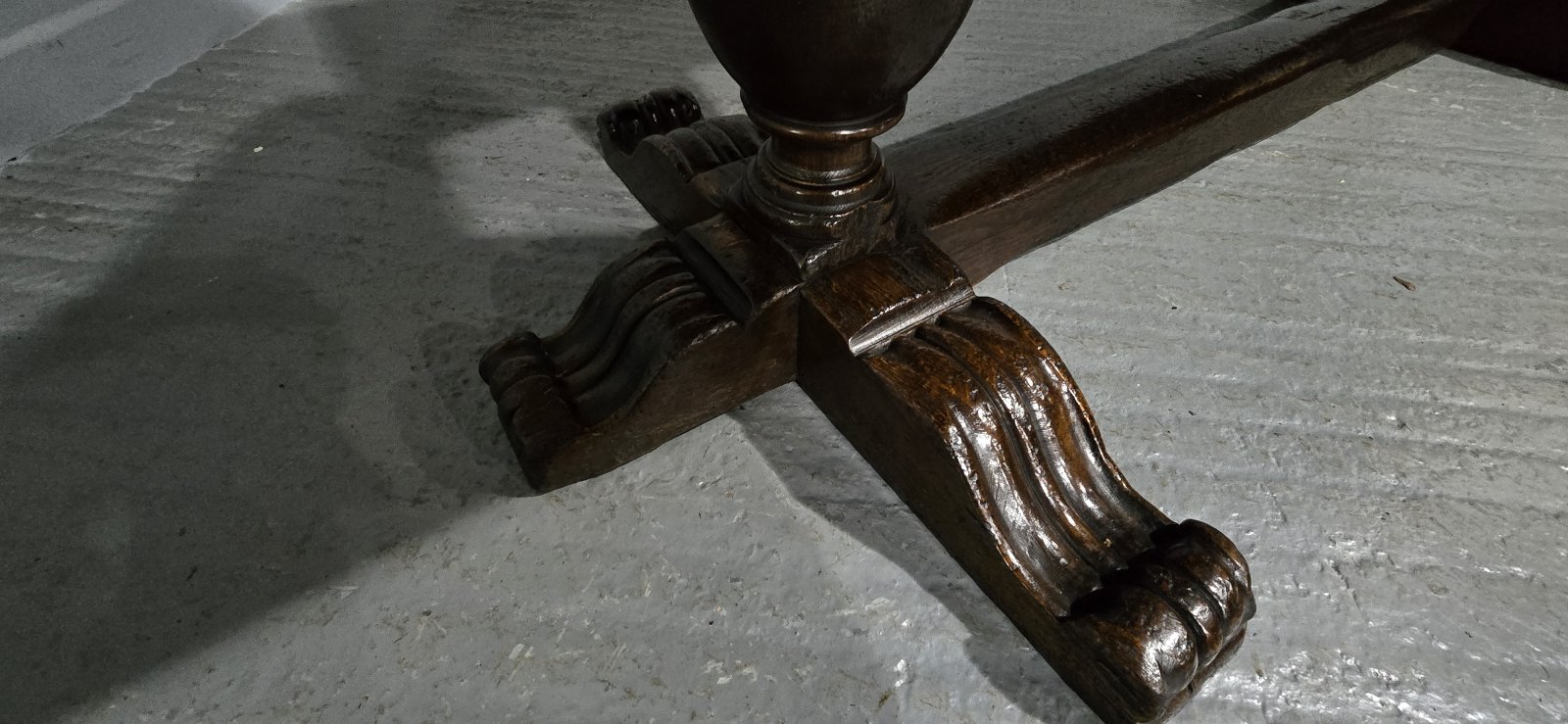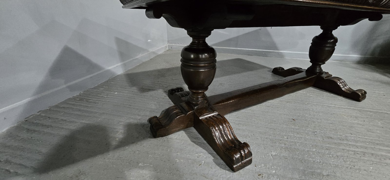 A superb huge Elizabethan style extending draw leaf double pedestal oak dining table, 2 inch thick top, peg jointed throughout, carved freize, lovely home ready condition.
