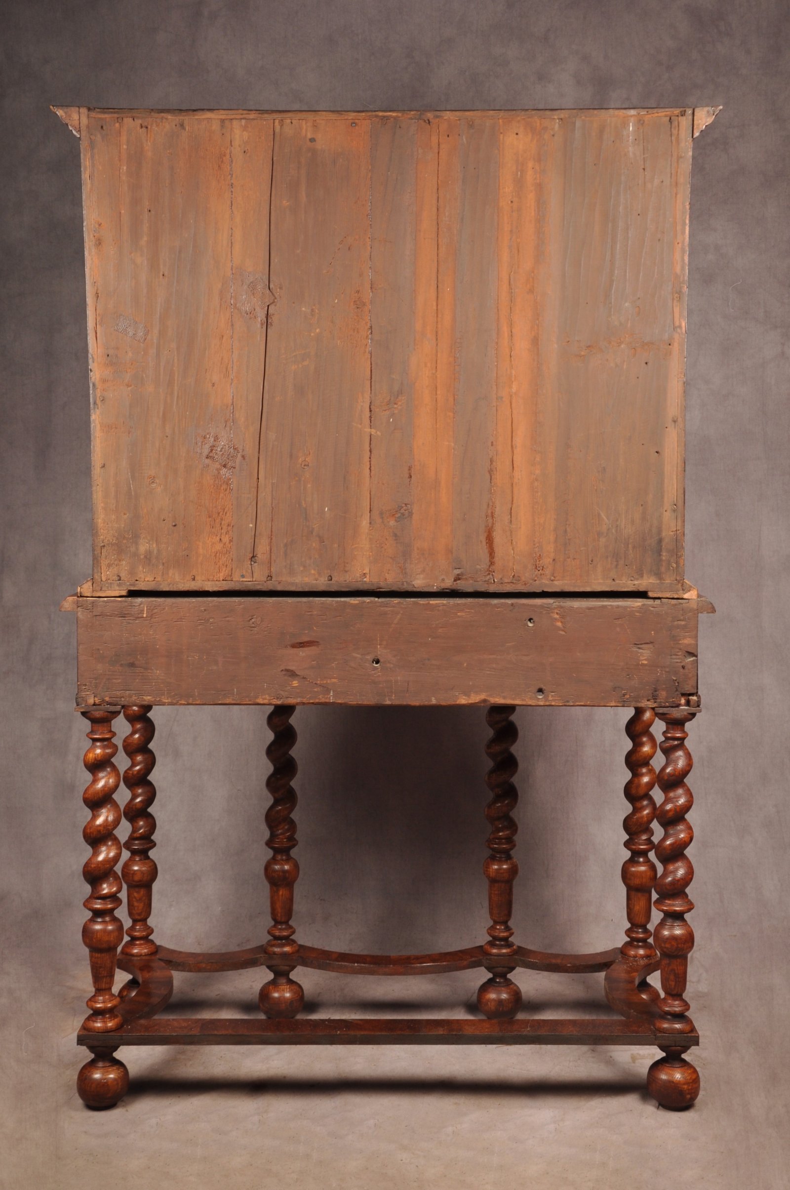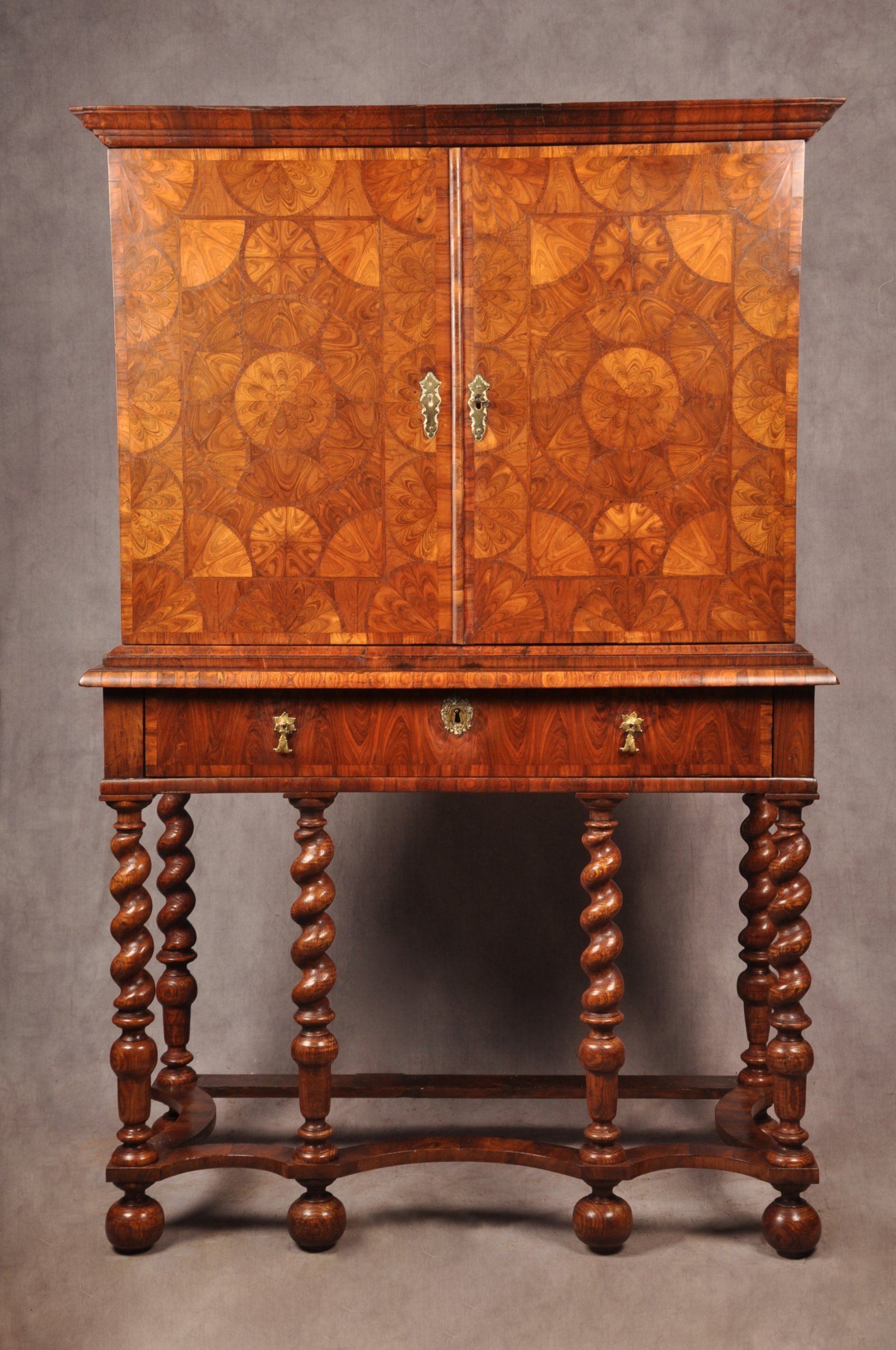 An extremely rare and exceptional 17th Century William & Mary Kingwood oyster veneered Cabinet On Stand probably by Thomas Pistor. Having stunning geometric oyster patterns throughout with fine cross banded borders standing on replacement fiddleback Ash twist legs made to the exact proportion and design of the period. The interior doors fitted with original lock and fastenings open to reveal an outstanding interior that is an explosion of contrasting light and dark cuts of kingwood oysters. The use of rosewood that forms the cross banding to the edge of the doors and interior of the central door can also be seen on the ends of the piece. The work is consistent with other known examples of this type that in all likelihood originated in the workshop of Thomas Pistor.