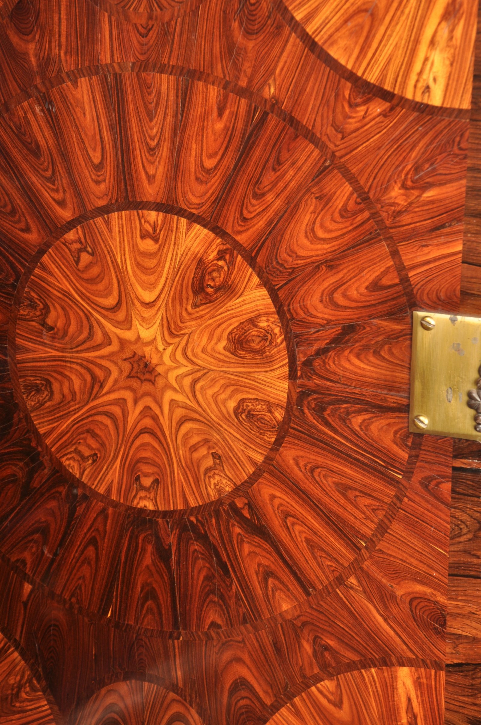 It is interesting to note that the section veneered in rosewood behind the interior door is almost identical to a kingwood Escritoire sold by W R Harvey Antiques, the pierced flower shaped brass hinges to the interior door are also a feature on both pieces.