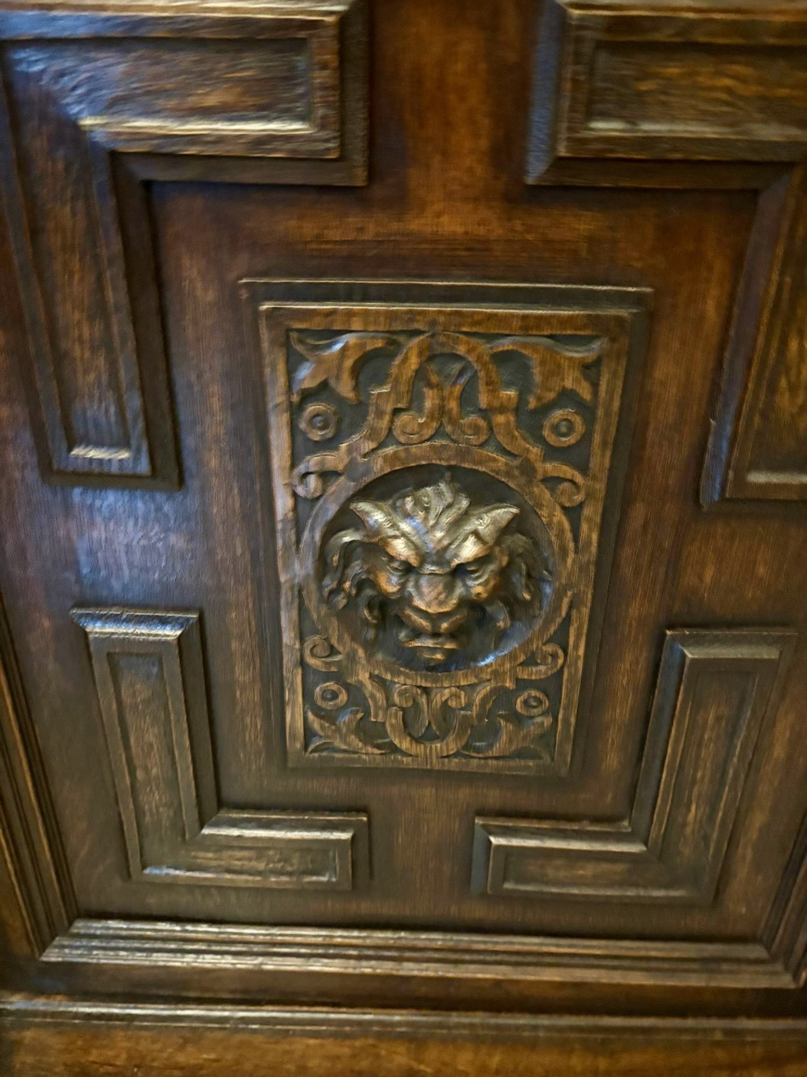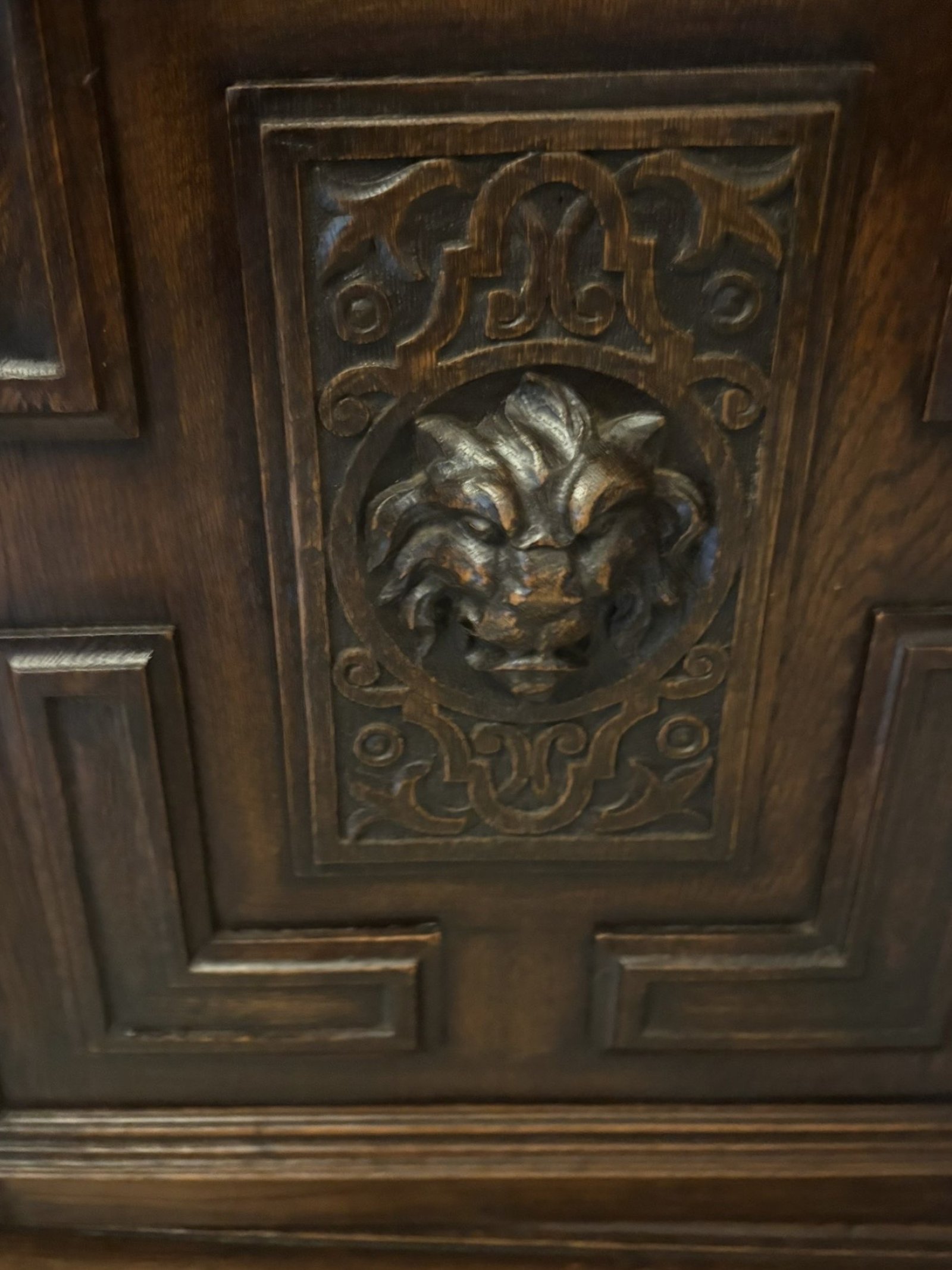 The antique carved oak sideboard is in very good condition for its age retaining a rich, warm patina with minor surface marks and wear consistent with use. The carving remains crisp and well defined, the structure is solid and stable and the doors and drawers function smoothly. The original drop handles and escutcheon are present and the interior is clean and sound, with no evidence of woodworm.