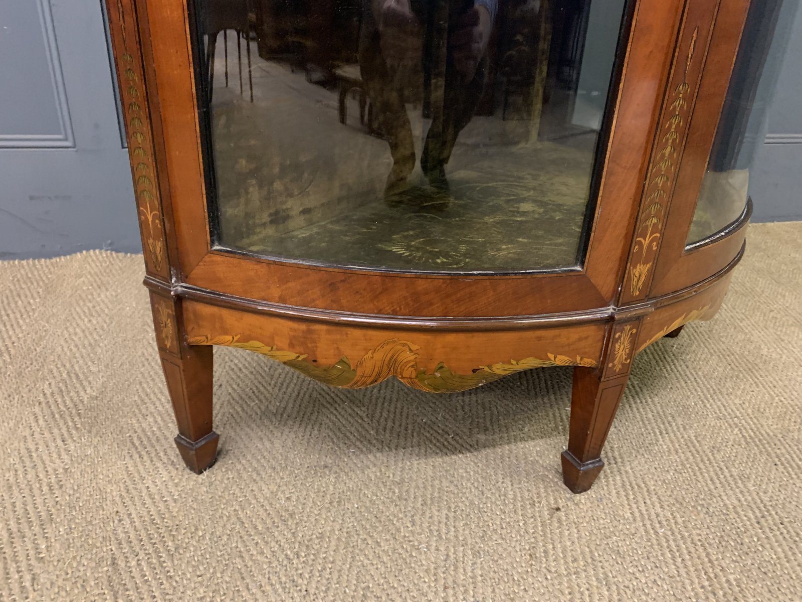 A very pretty late Victorian period inlaid display cabinet. Of bow fronted form and constructed in mahogany and satinwood. The top inlaid with satinwood and flame mahogany panels in a fan shape pattern. With inlaid panels of cherubs to the freeze. Further inlaid detailing throughout. With a single glazed door (lockable, key supplied) which opens to access a shelved and lined interior. All standing on short square tapering legs which terminate in spade feet. Offered for sale in very good original condition.