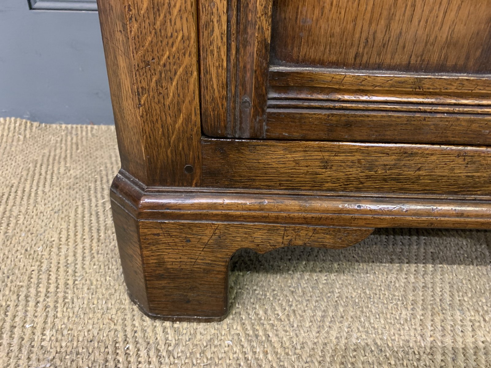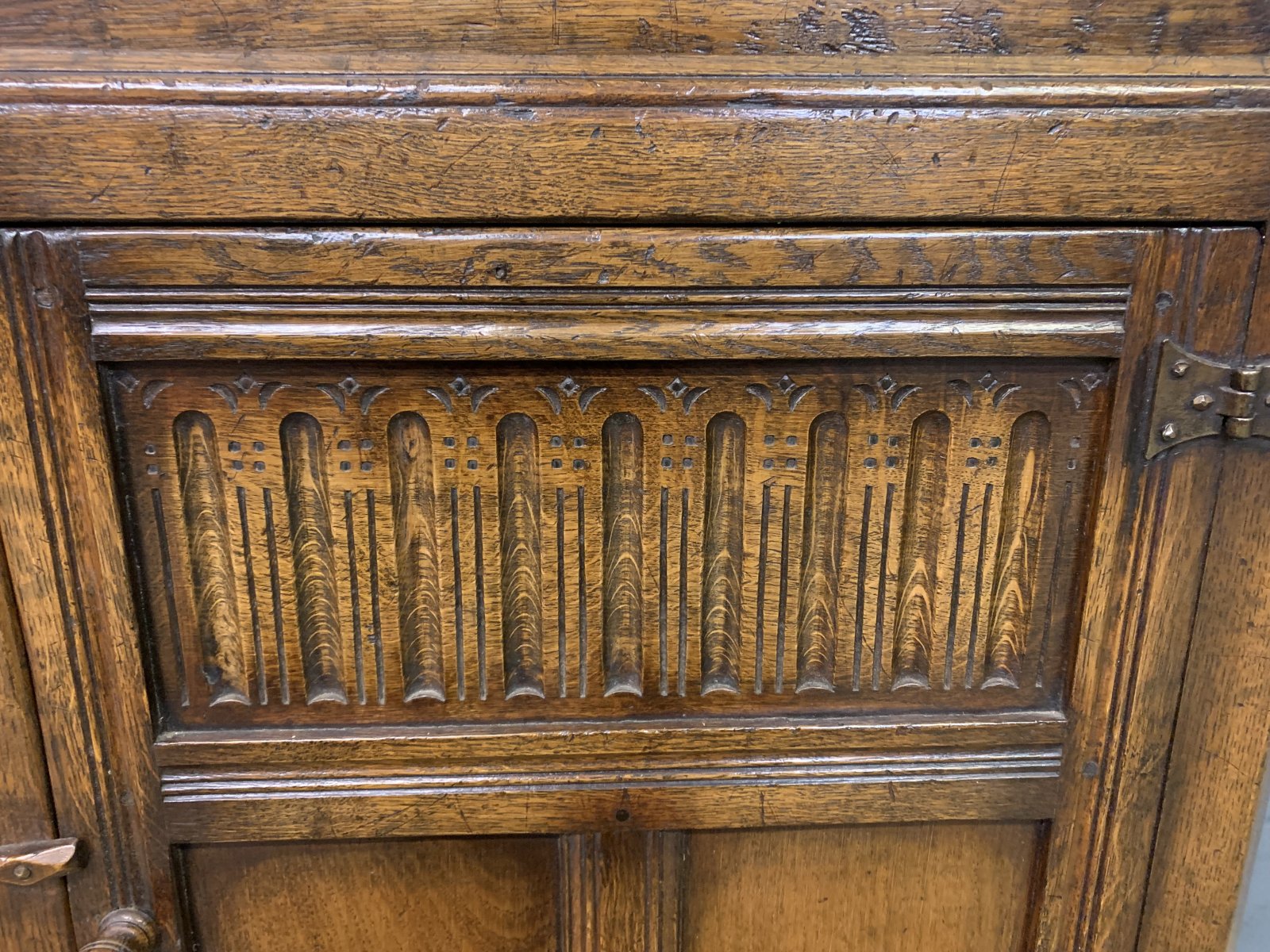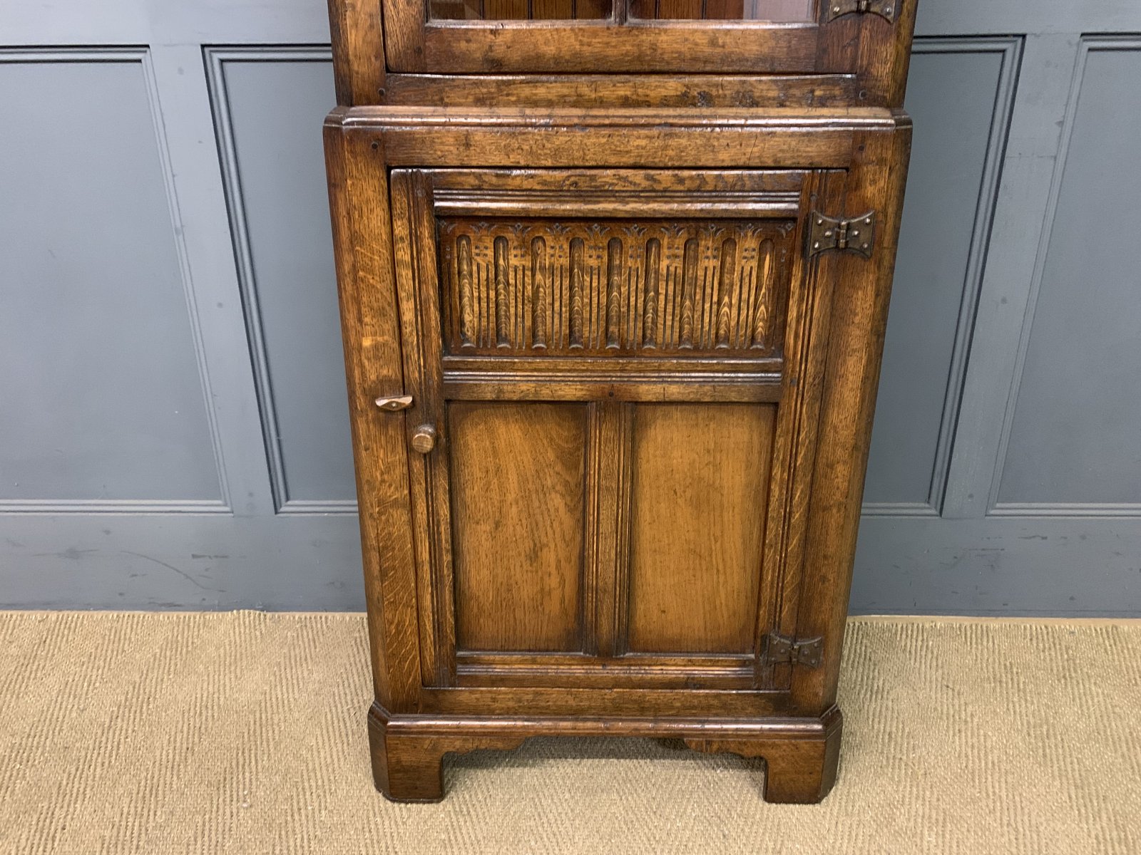 A good quality Ipswich Oak corner cabinet, or cupboard. Very well made from solid English oak, now with a lovely mellow colour and patina. There is a single glazed door to the top which opens to access a shelved interior. To the bottom there is a single cupboard door which opens to reveal further shelved storage space. The cabinet is decorated with carved detailing and is offered for sale in excellent original condition, ready to go straight into the home.