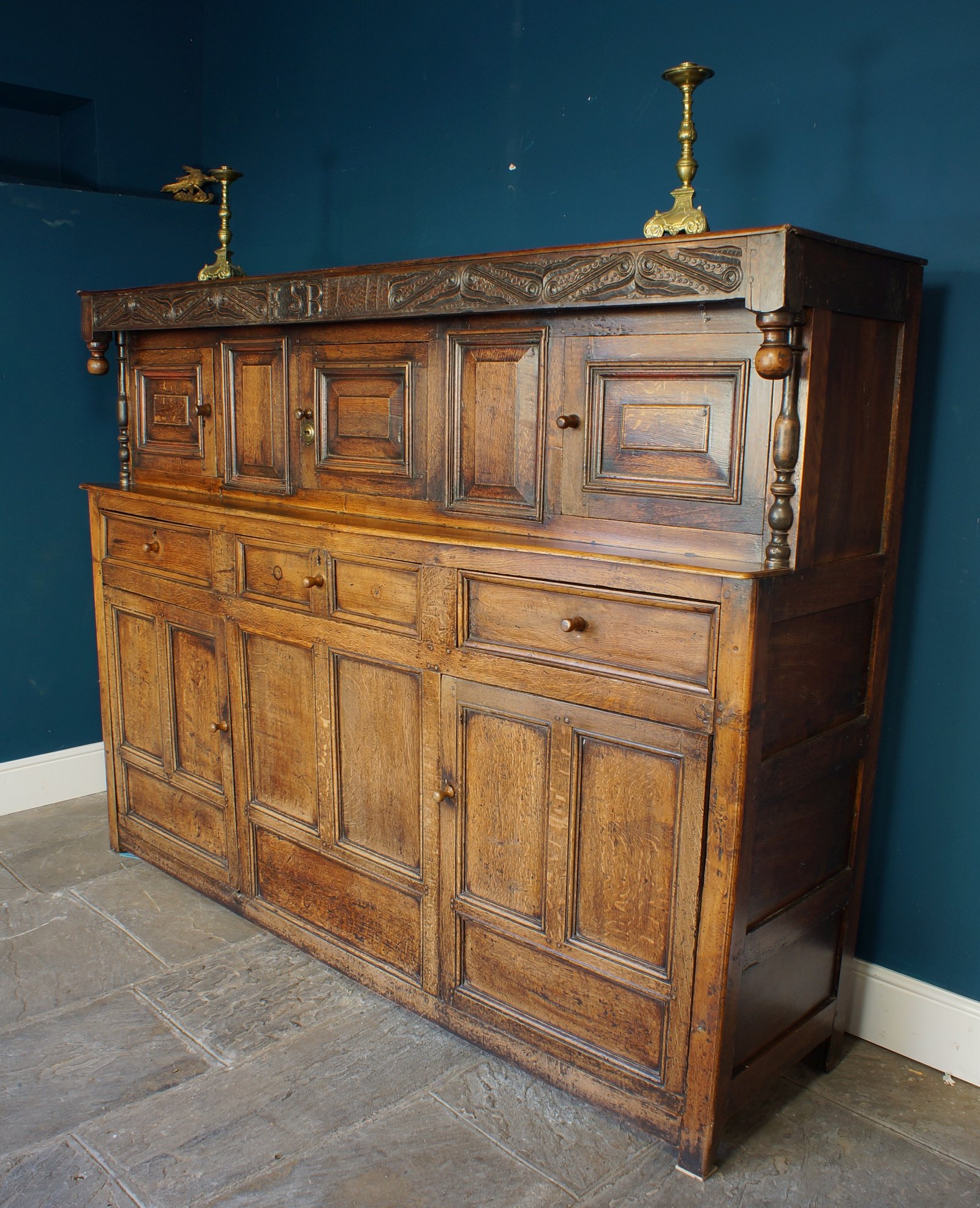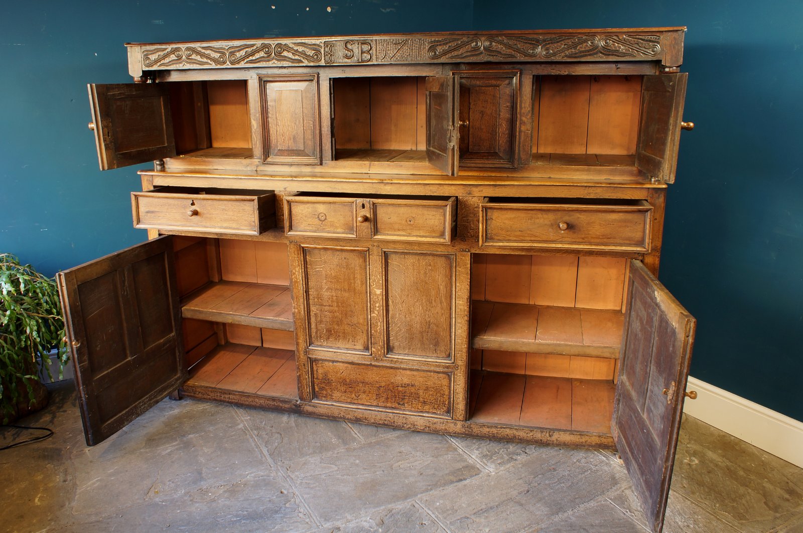 With a carved top rail initialed I/J S B and dated 1711. The upper section having three doors with raised fielded panels and two blind panels, above three moulded drawers and two panelled doors.