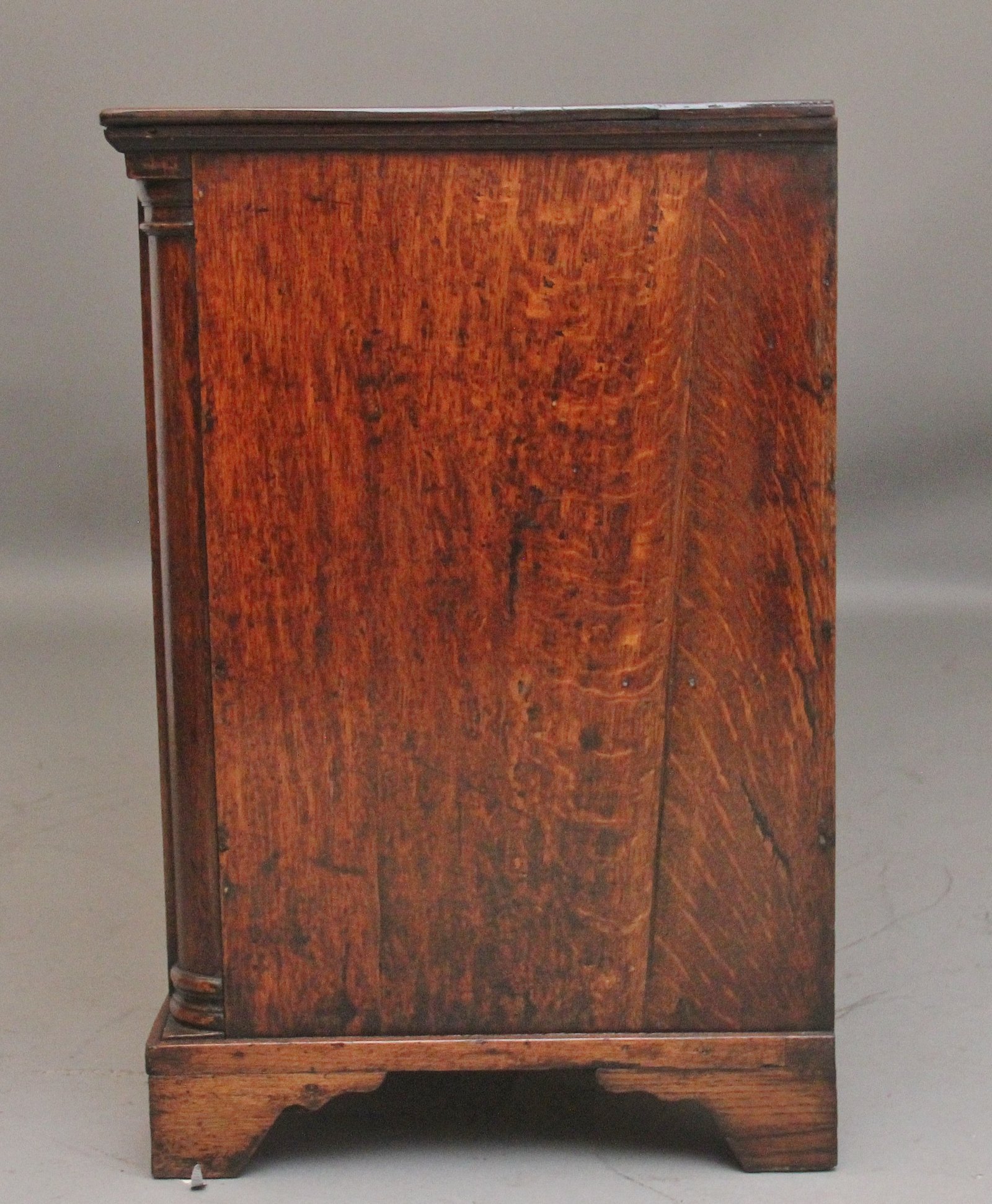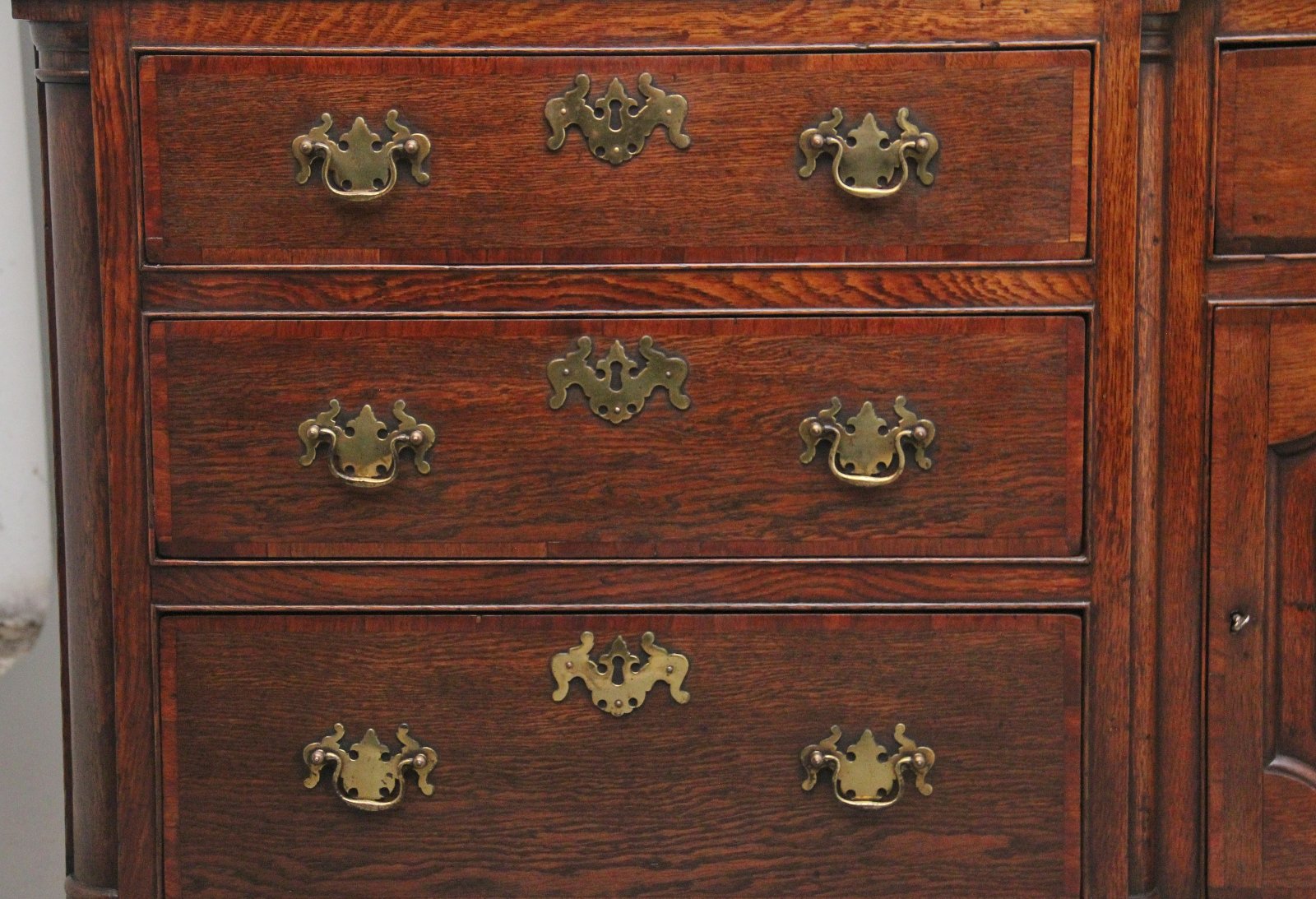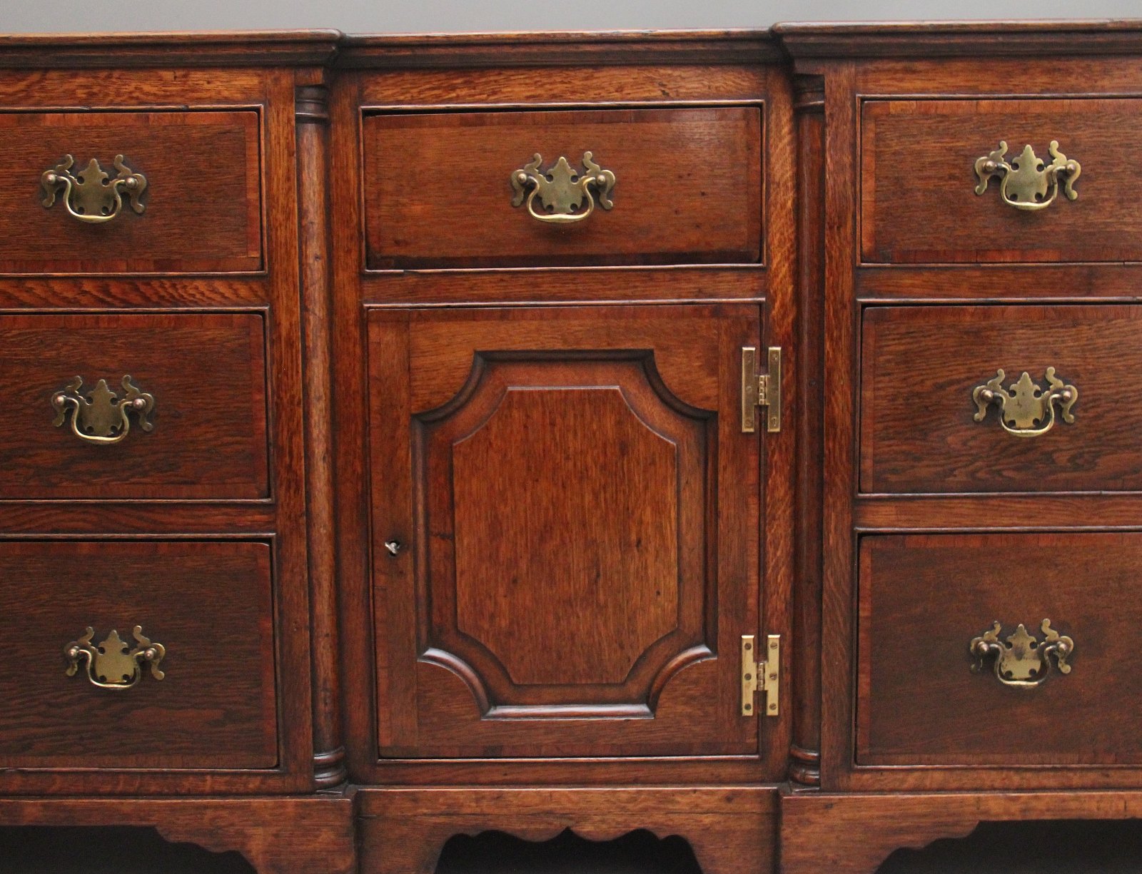 A large 18th Century oak dresser having a nice figured top above a combination of six large graduated drawers with crossbanding on the drawer fronts, three either side, with brass plate handles and escutcheons, a central cupboard door with a fielded panel opening to reveal a large compartment space, the door having a workable lock, with a single drawer above with an oval brass plate handle, four decorative quarter columns located at either sides of the drawers, raised on bracket feet. Circa 1810.