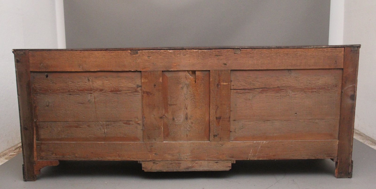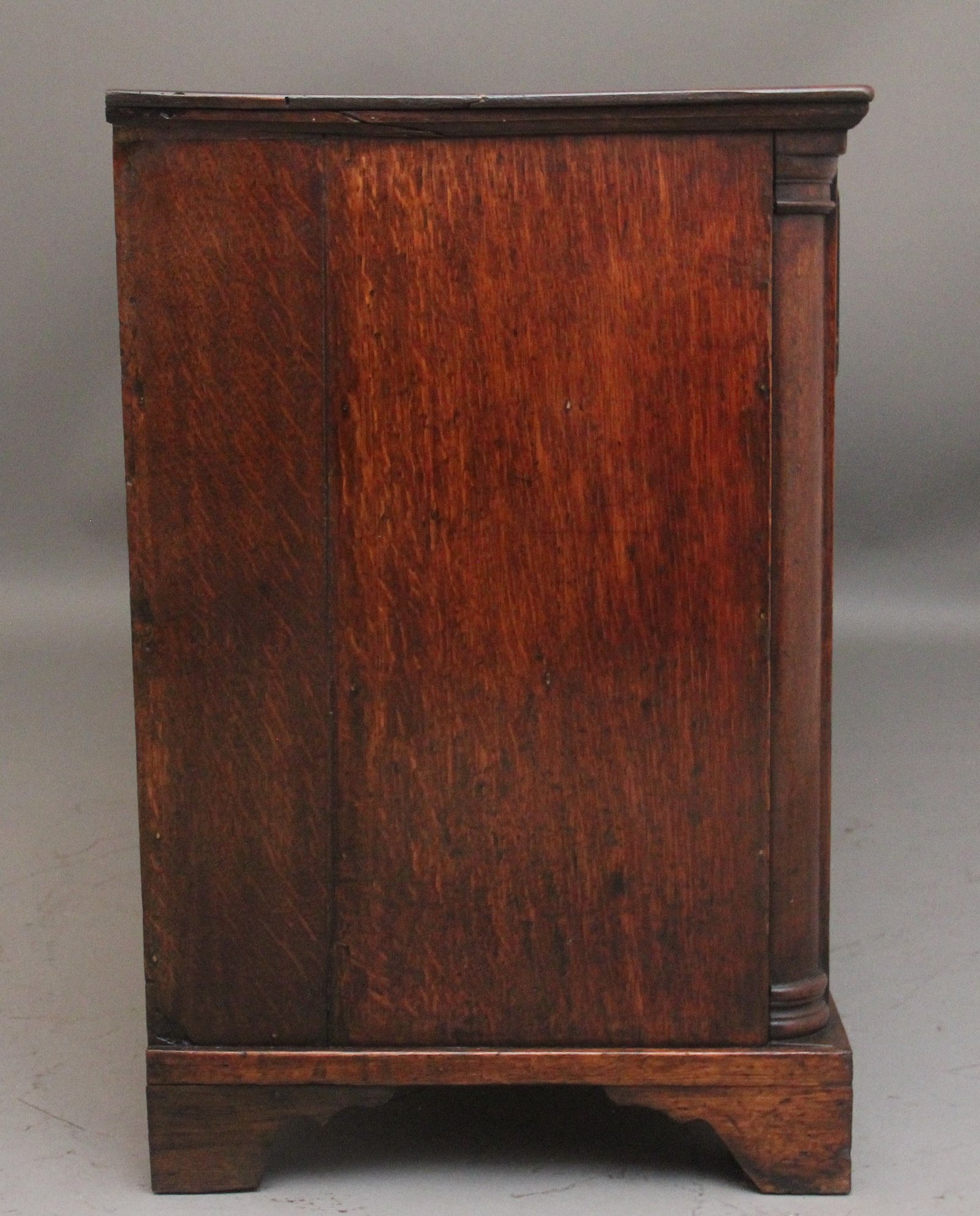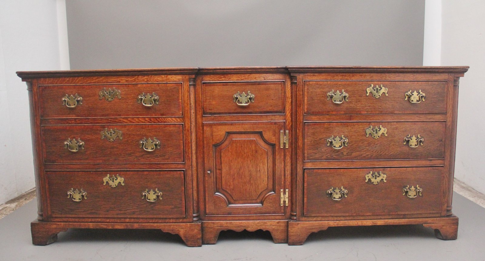 A large 18th Century oak dresser having a nice figured top above a combination of six large graduated drawers with crossbanding on the drawer fronts, three either side, with brass plate handles and escutcheons, a central cupboard door with a fielded panel opening to reveal a large compartment space, the door having a workable lock, with a single drawer above with an oval brass plate handle, four decorative quarter columns located at either sides of the drawers, raised on bracket feet. Circa 1810.