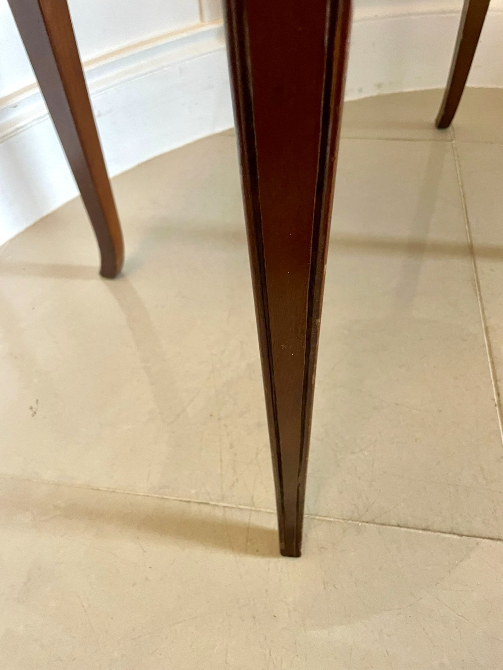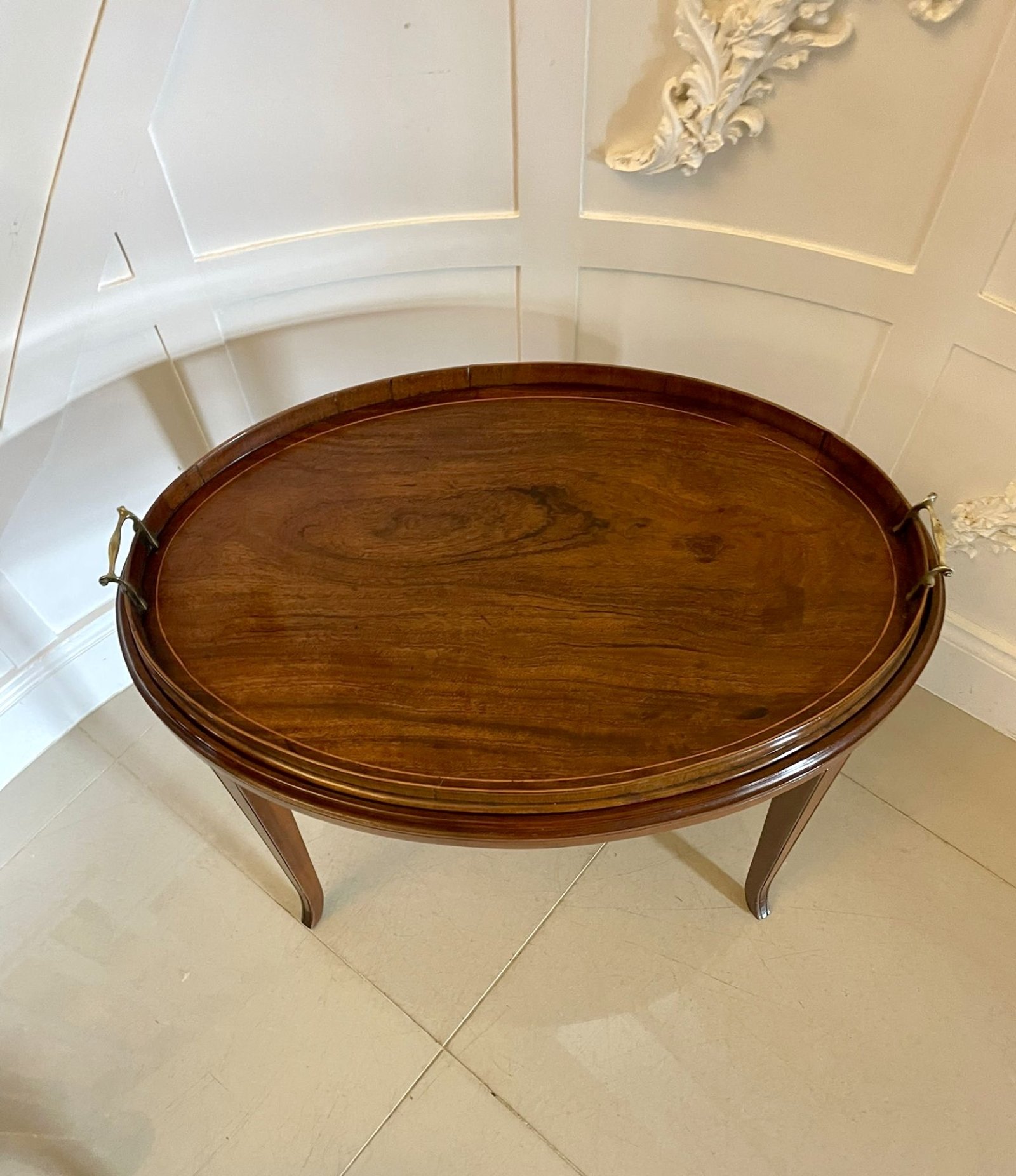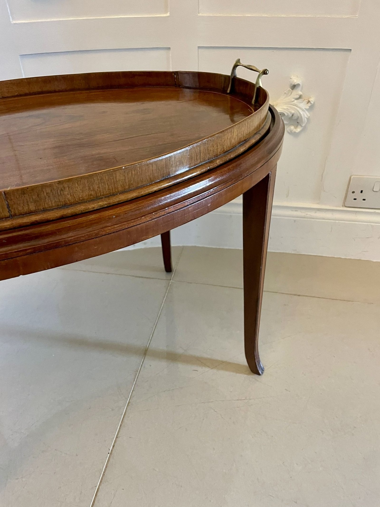 Large Antique Edwardian oval quality figured mahogany tea tray on stand having a removable quality figured mahogany oval tea tray with brass carrying handles and satinwood inlay on an oval mahogany stand with a moulded edge standing on four square tapering legs