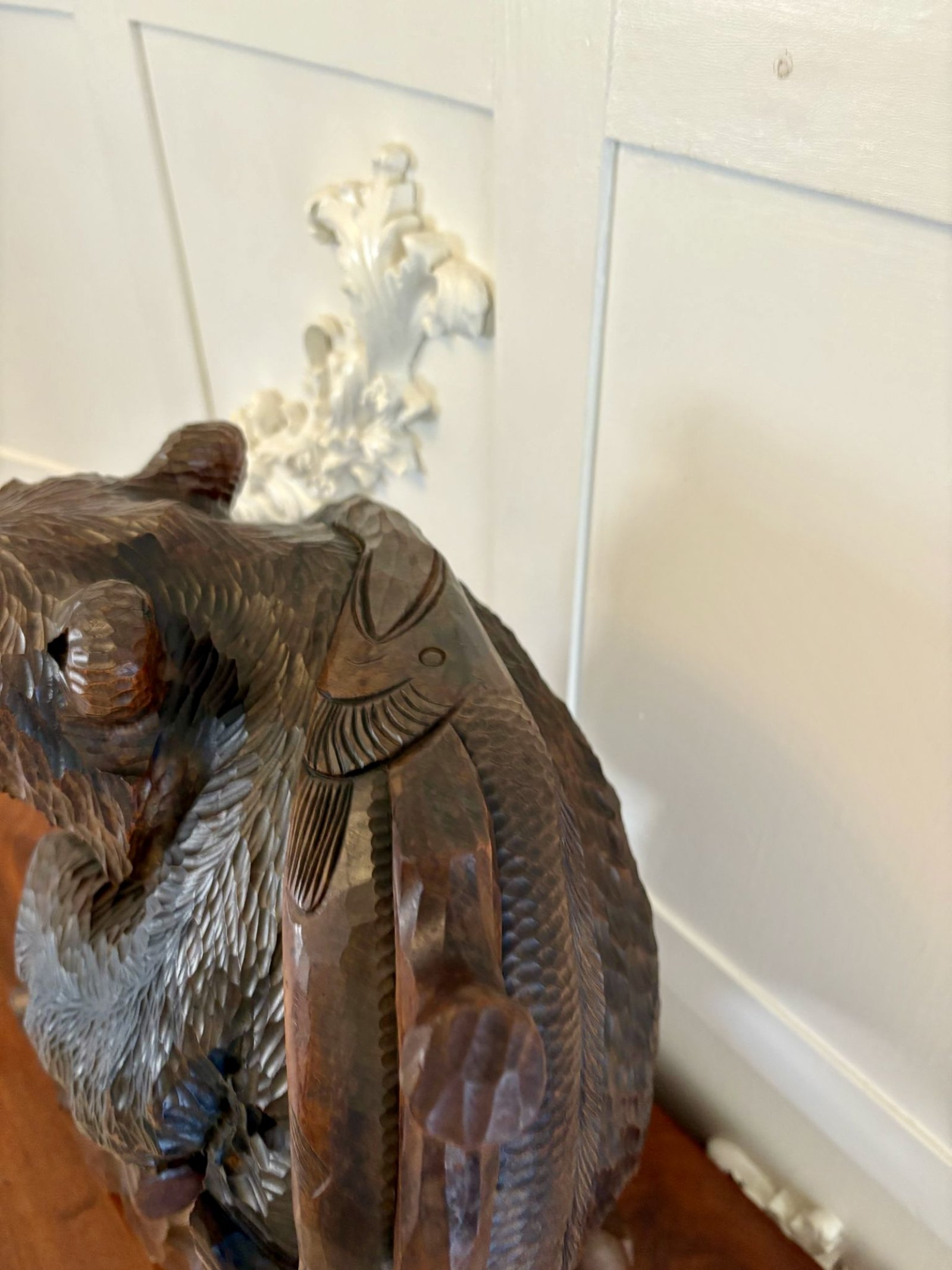 Large Antique Edwardian Quality Carved Linden Wood Japanese Bear Carrying a Fish