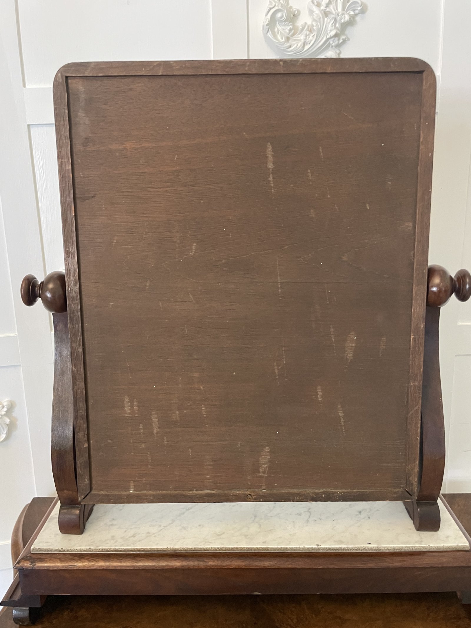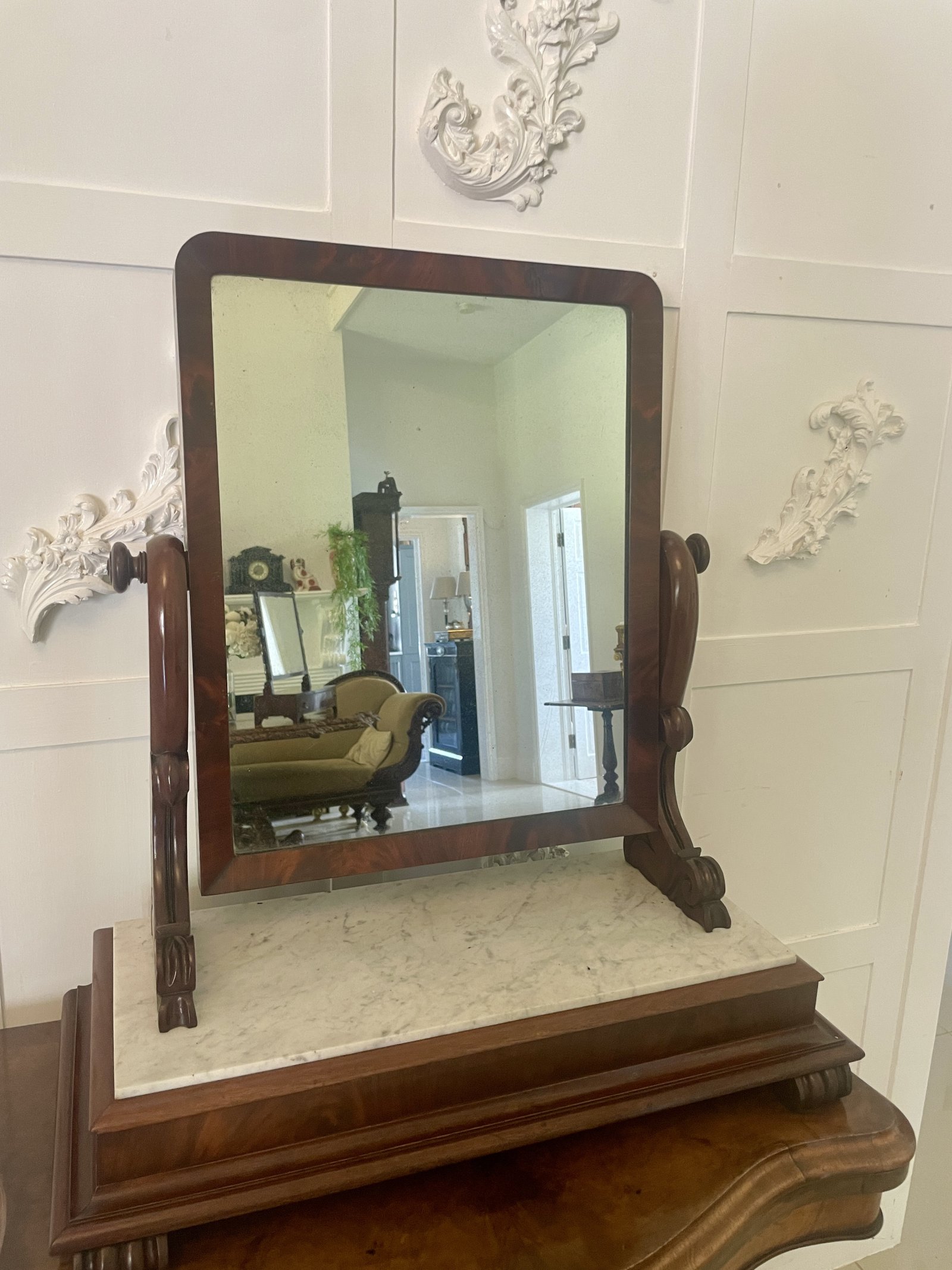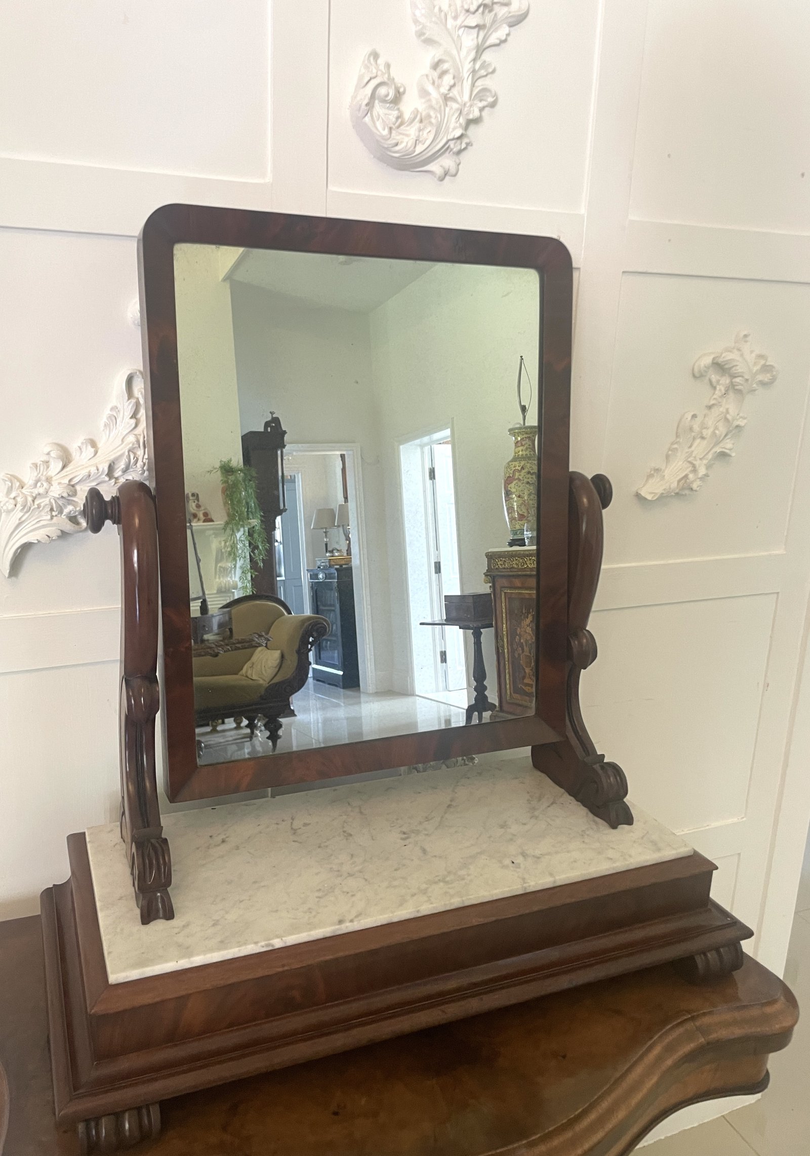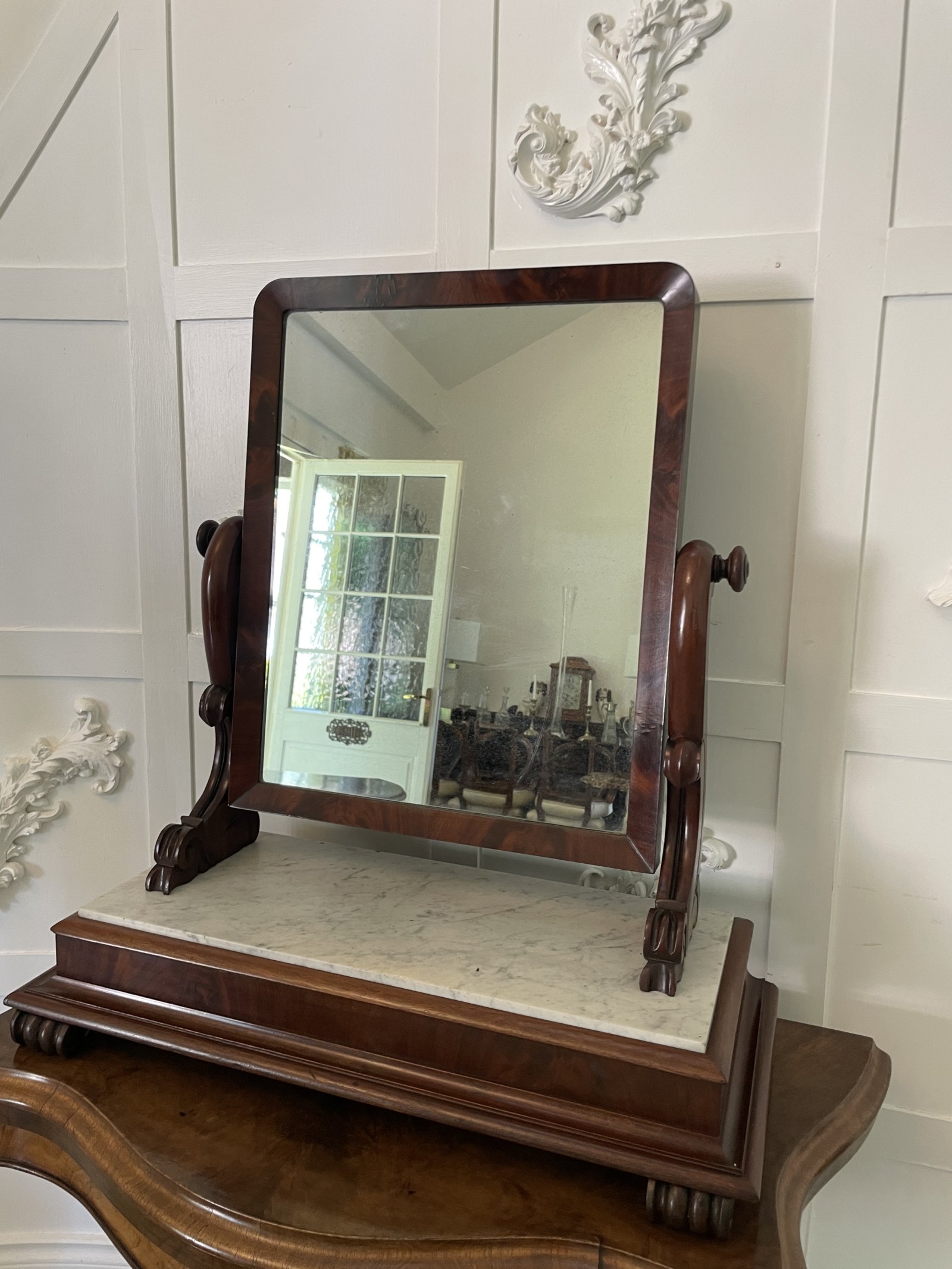 Large antique Victorian mahogany and marble topped toilet swing mirror having a lovely white marble topped, mahogany plinth base with carved scrolled feet, the original mirror is supported by beautifully carved scrolled supports and to each side turned knobs to hold the mirror at the desired angle.