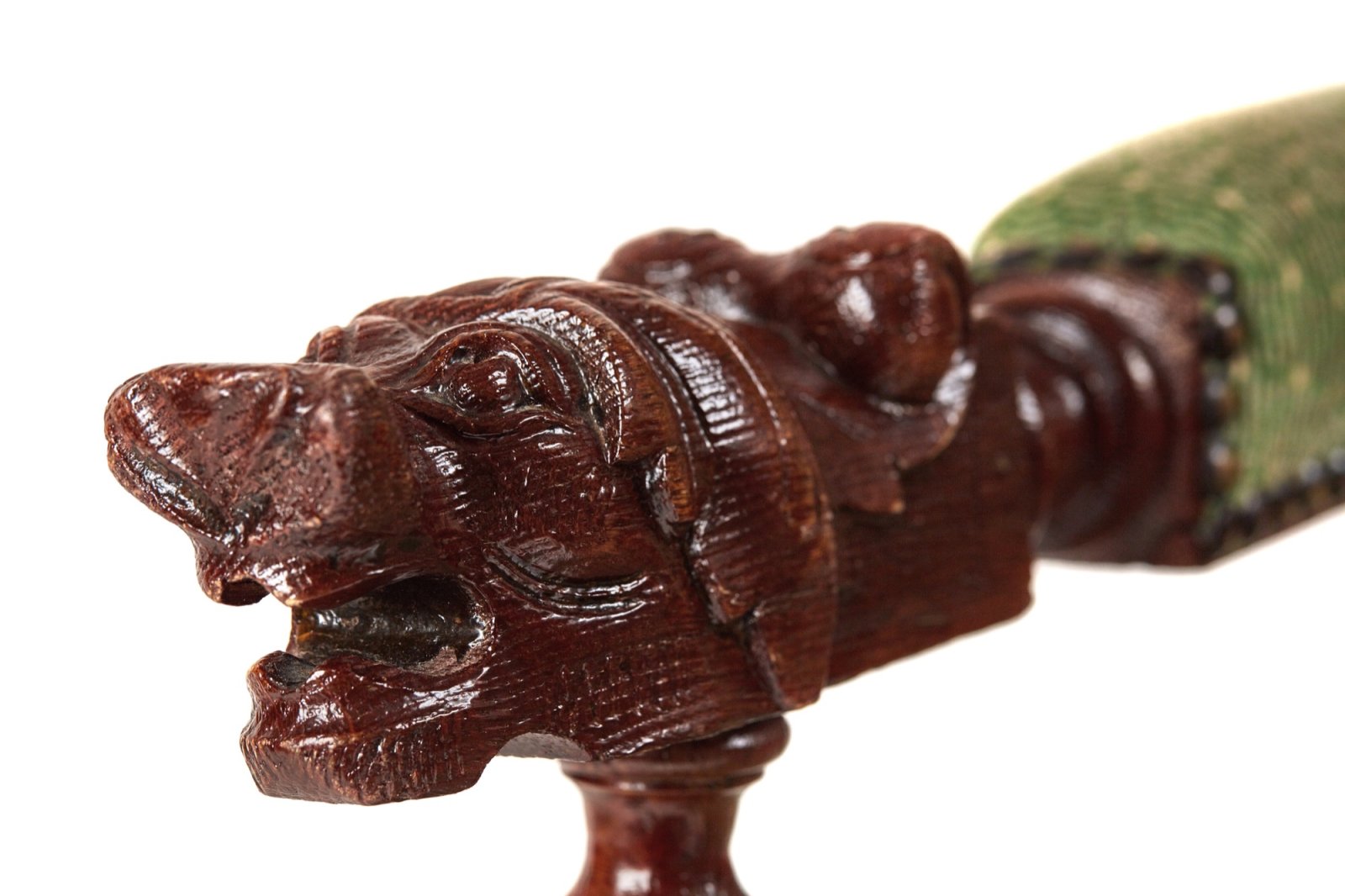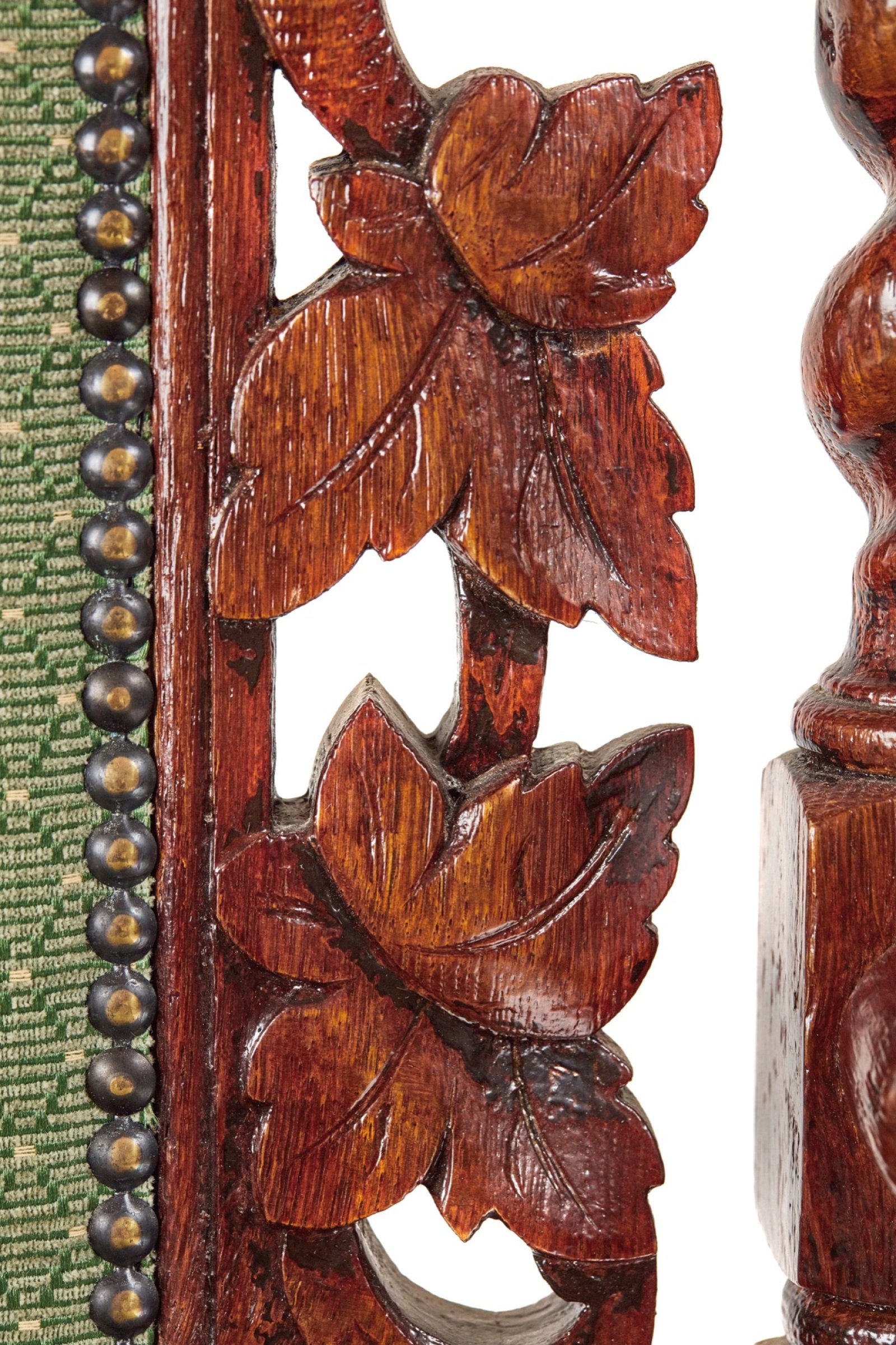 Large antique Victorian quality carved oak throne armchair having a quality carved oak back with super barley twist supports, open arms with quality carved dogs heads and barley twist supports standing on turned and carved legs to the front and barley twist legs to the back united by barley twist stretchers