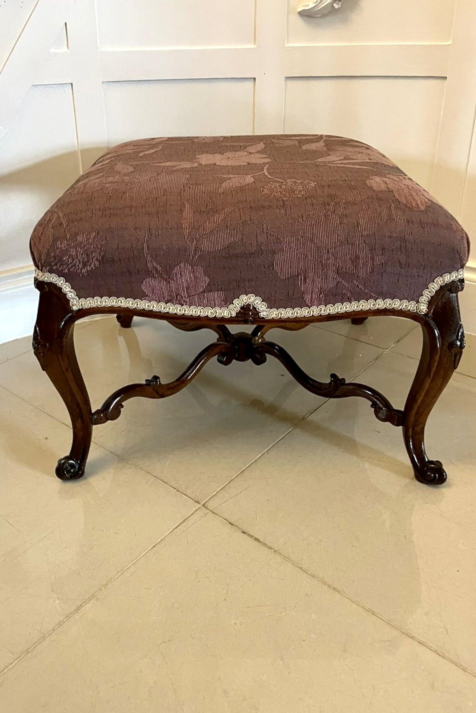 Large antique Victorian quality carved rosewood stool having a newly reupholstered seat in a quality lavender colour stylish fabric, carved rosewood frieze, standing on shaped carved rosewood cabriole legs with scroll feet united by a shaped carved rosewood cross stretcher