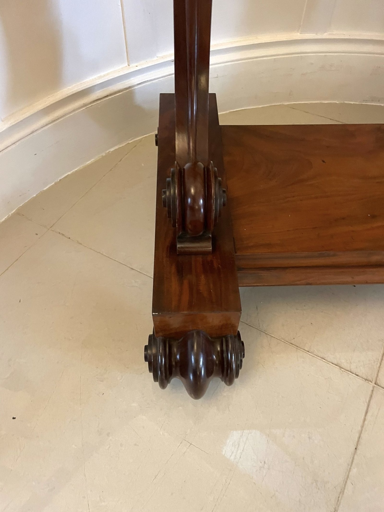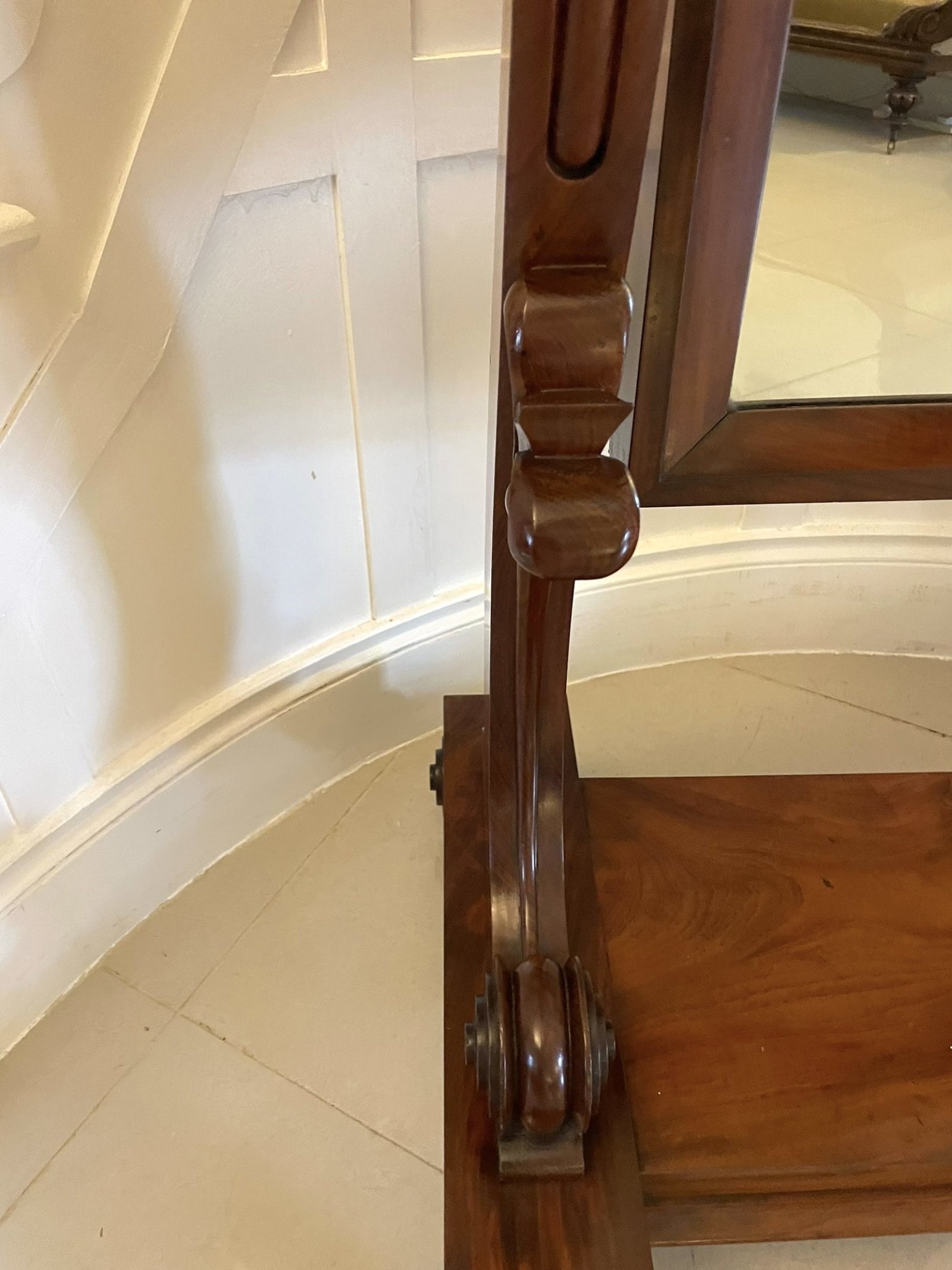 Large antique Victorian quality mahogany cheval mirror having the original adjustable mirror in a quality figured mahogany frame supported by large shaped supports with elegant carved open tulips and scrolls standing on scroll shaped feet with original castors united by a figured mahogany stretcher with a moulded edge