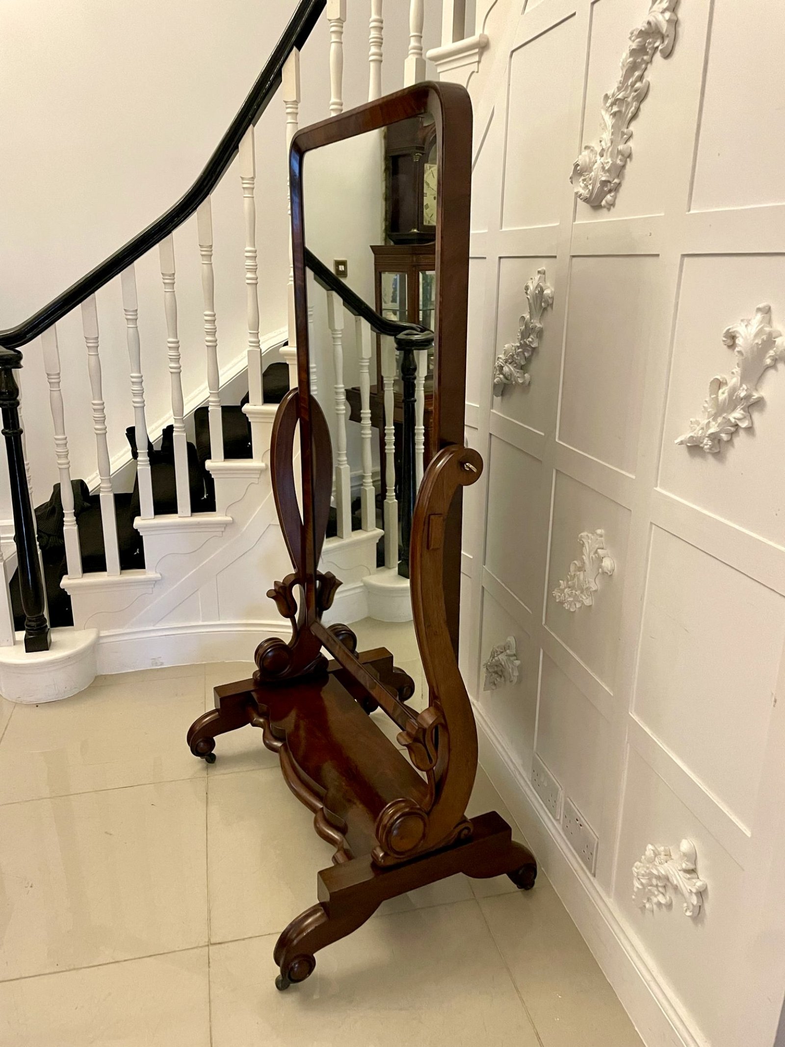 Large antique Victorian quality mahogany cheval mirror having the original adjustable mirror in a quality figured mahogany frame supported by large scroll shaped supports with elegant carved tulips standing on scroll shaped feet with original castors united by a figured mahogany serpentine shaped stretcher with a moulded edge