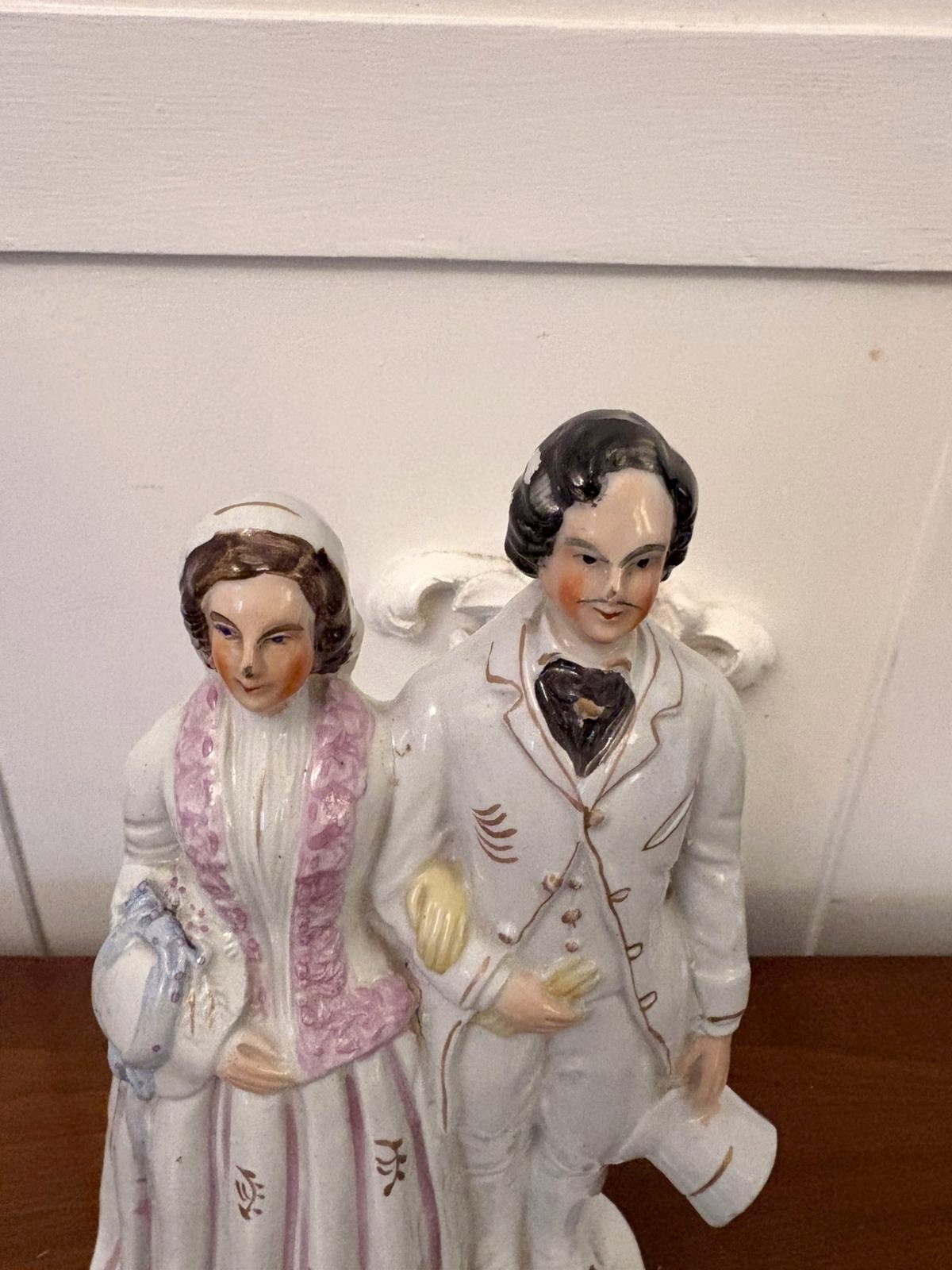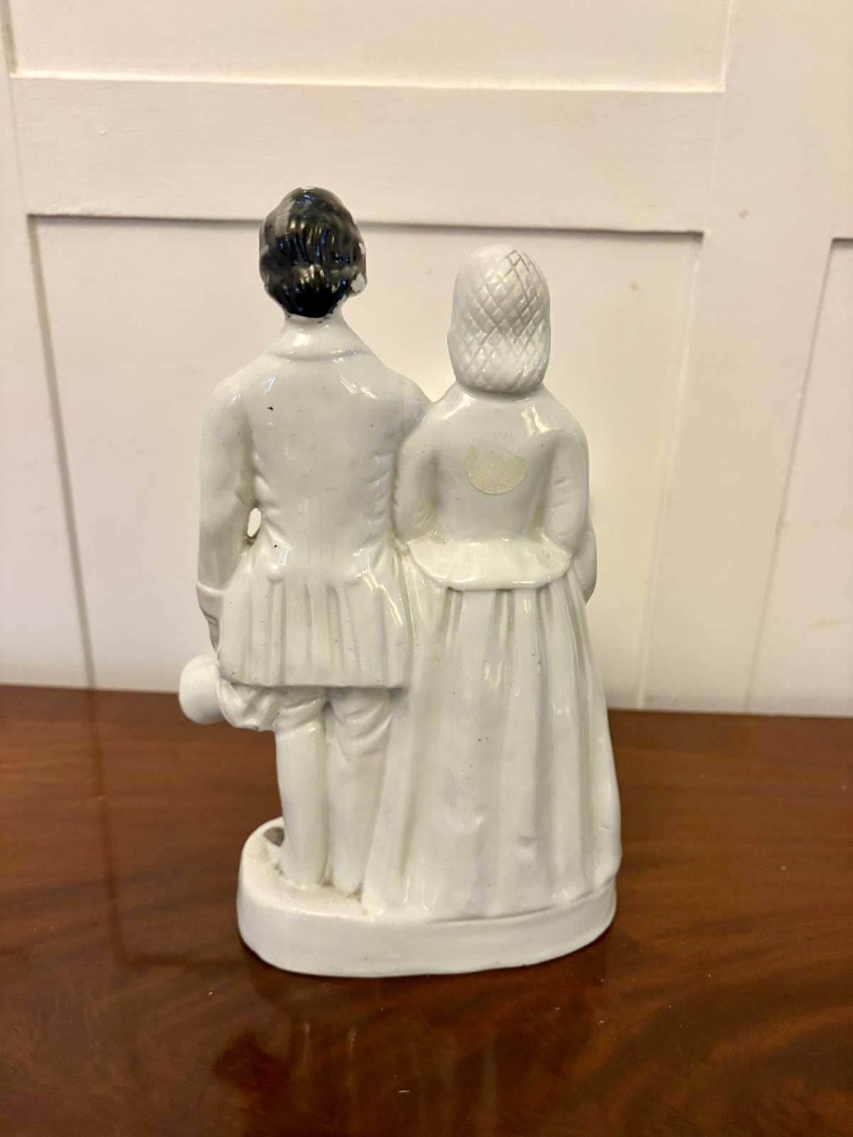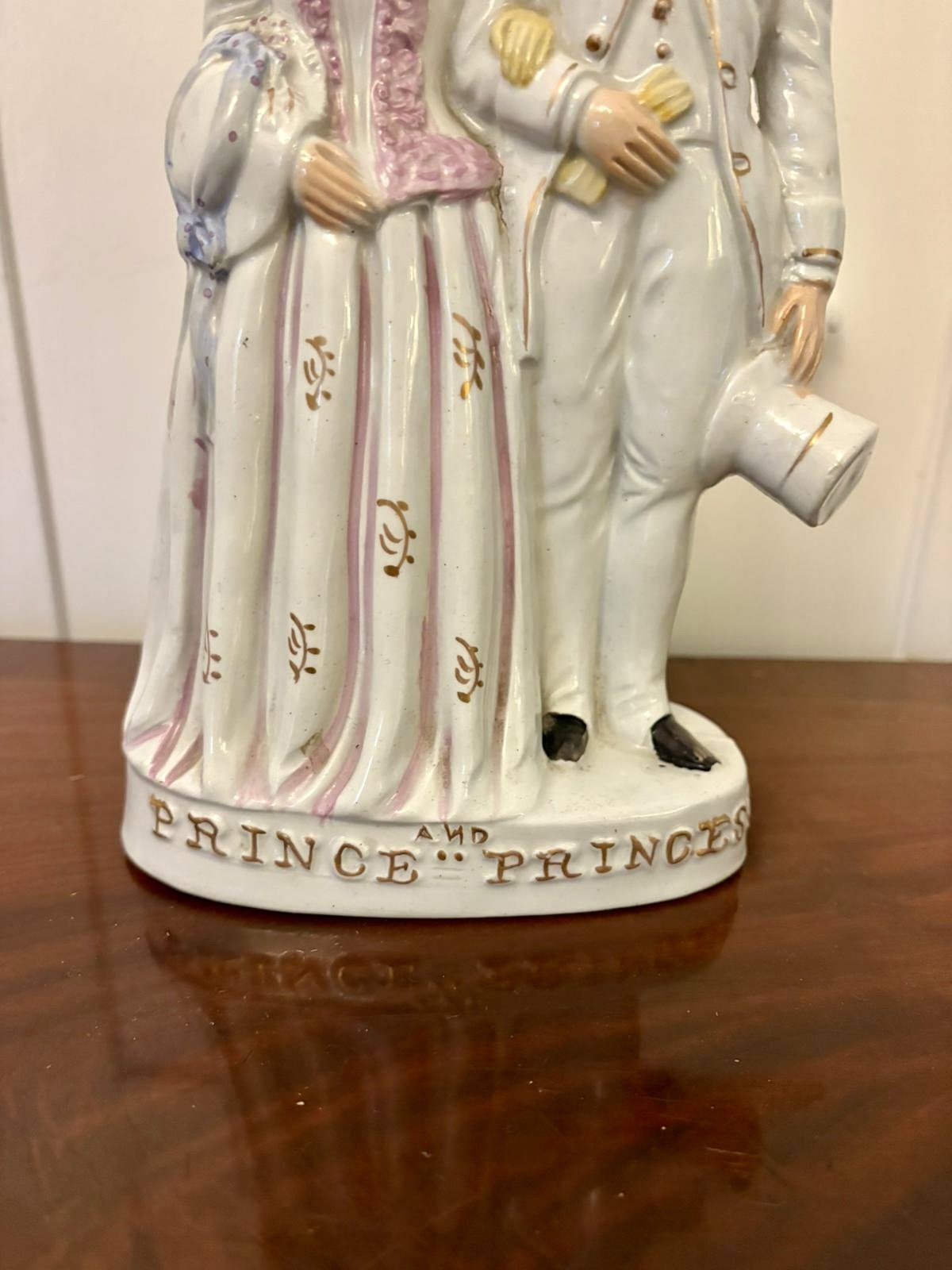 Large antique Victorian Staffordshire Royal portrait figure depicting Princess Alexandra of Denmark and the Prince of Wales standing on a titled base with gilt raised capitals. This was issued to celebrate the engagement of the Royal couple which took place in September 1862.