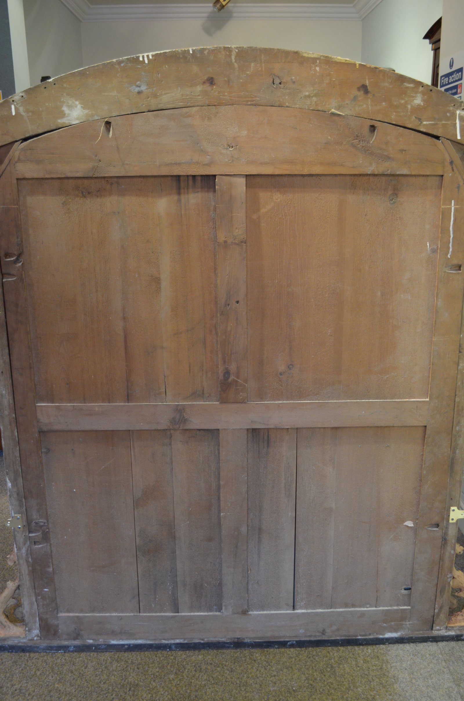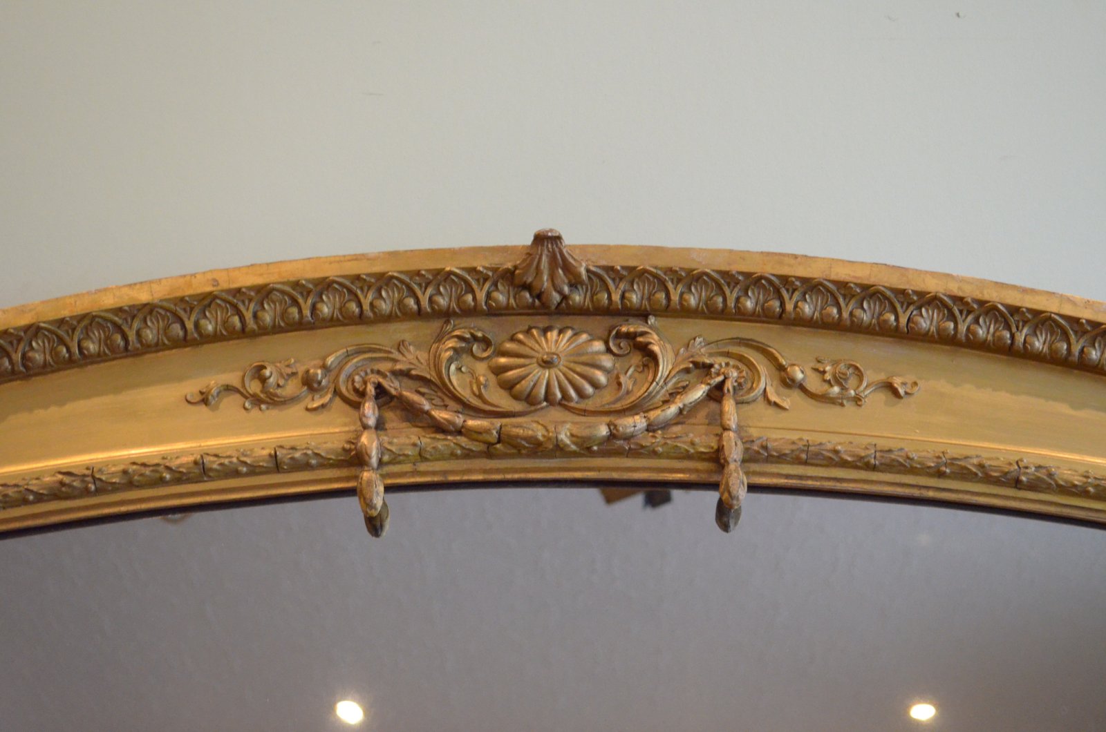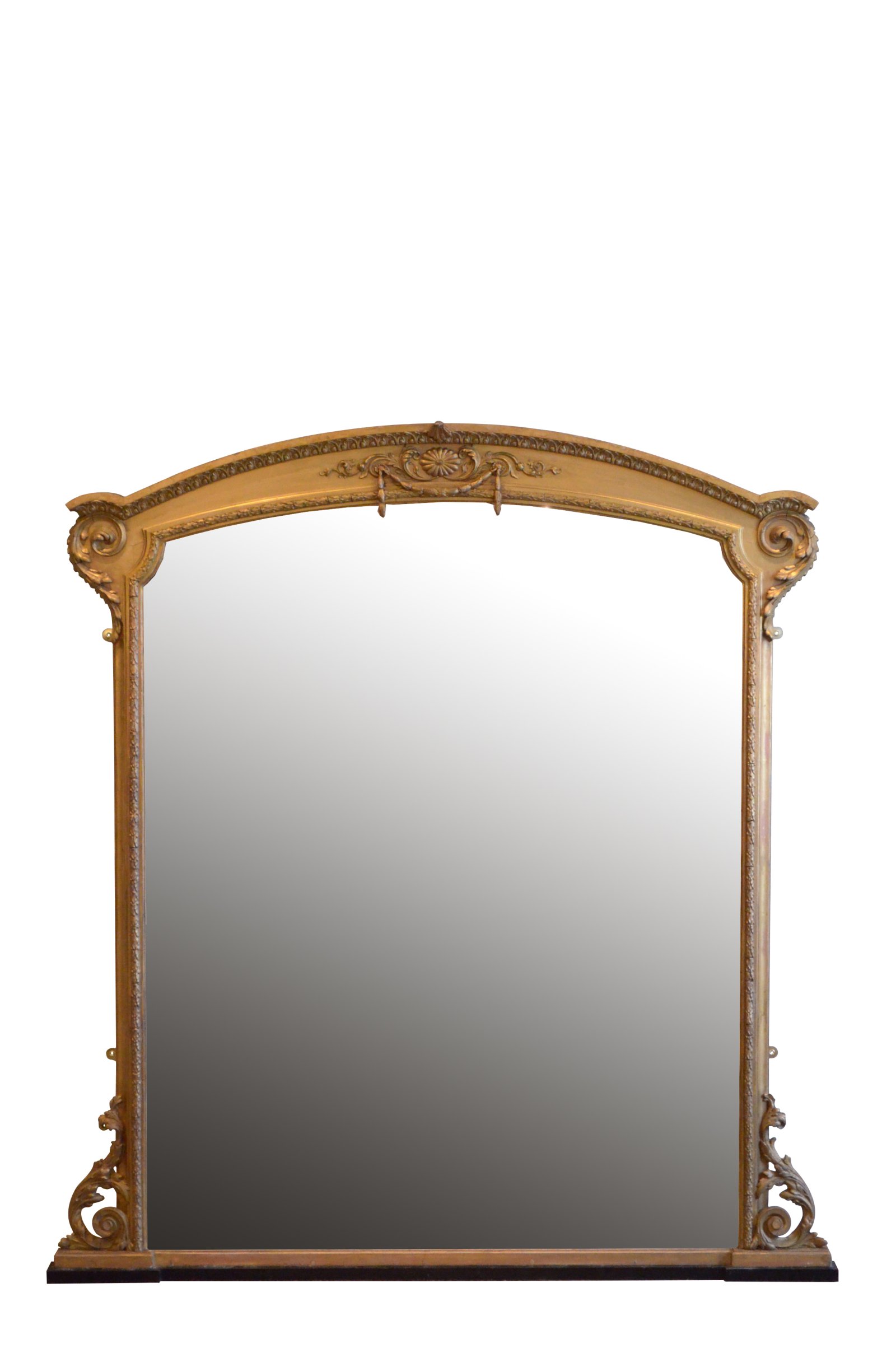 k0618 A Large Victorian Overmantel giltwood mirror or arched form, having original mercury glass with some foxing and desirable sparkle in gilded frame with moulded can finely carved cornice above floral frieze, decorative laurel leaf carving throughout and leaf scrolls to the base. This antique mirror retains its original glass, original gilt with some toughing up over the years and original panelled backboards with four wall bracket, all ready to place at home. The mirror is woodworm free, all decoration is present, no loose elements. A true statement which would grace any interior. c1850