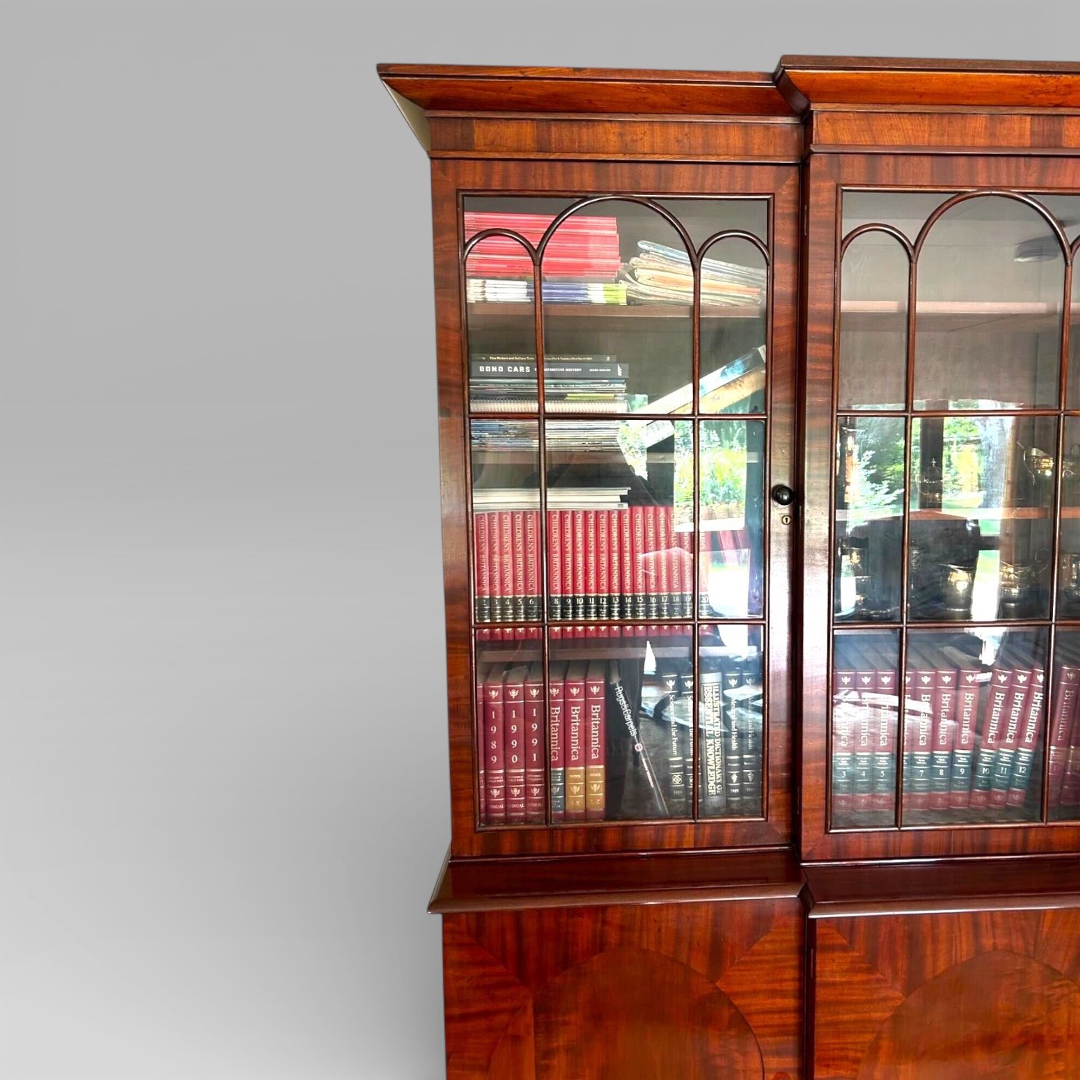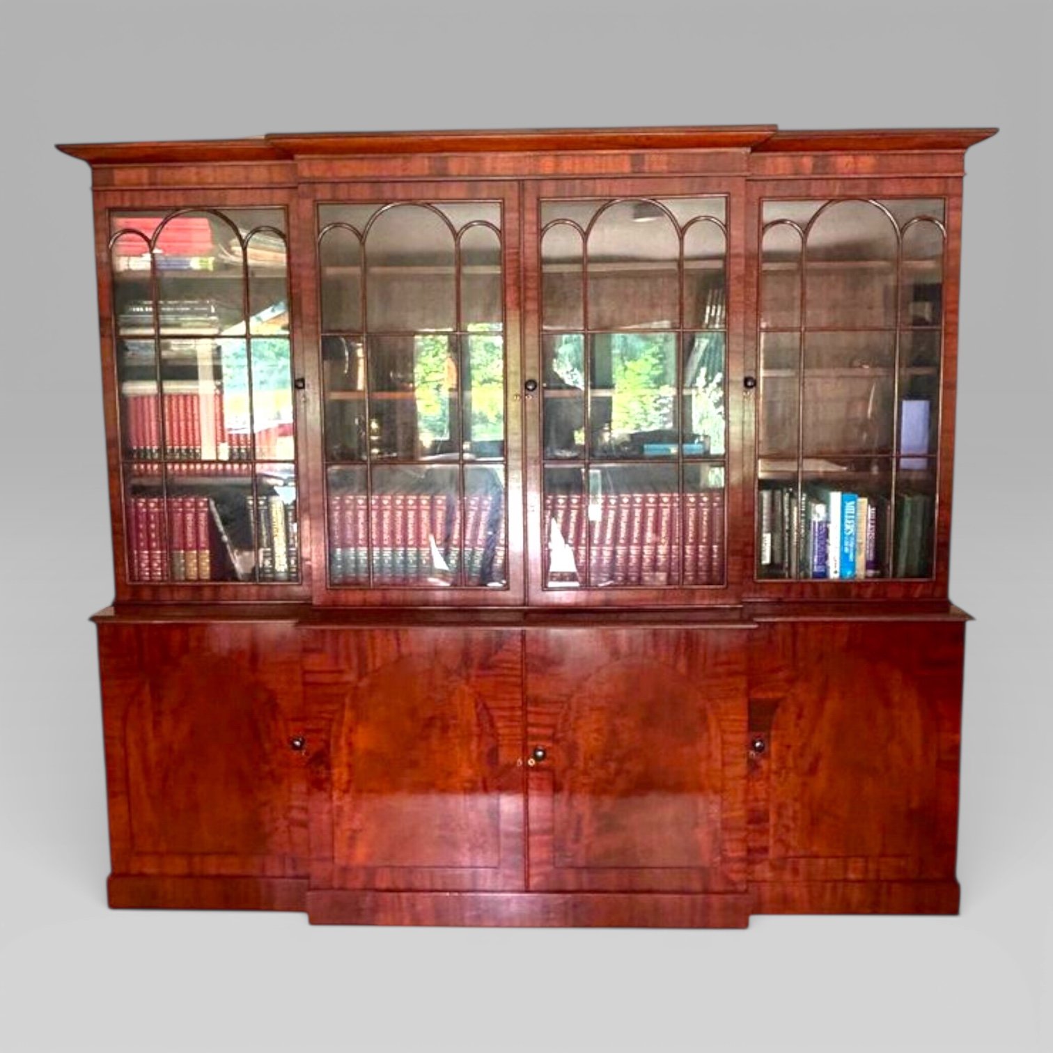 A Large William IV Mahogany Breakfront Library Bookcase, with 4 glazed doors above panelled cupboard doors.