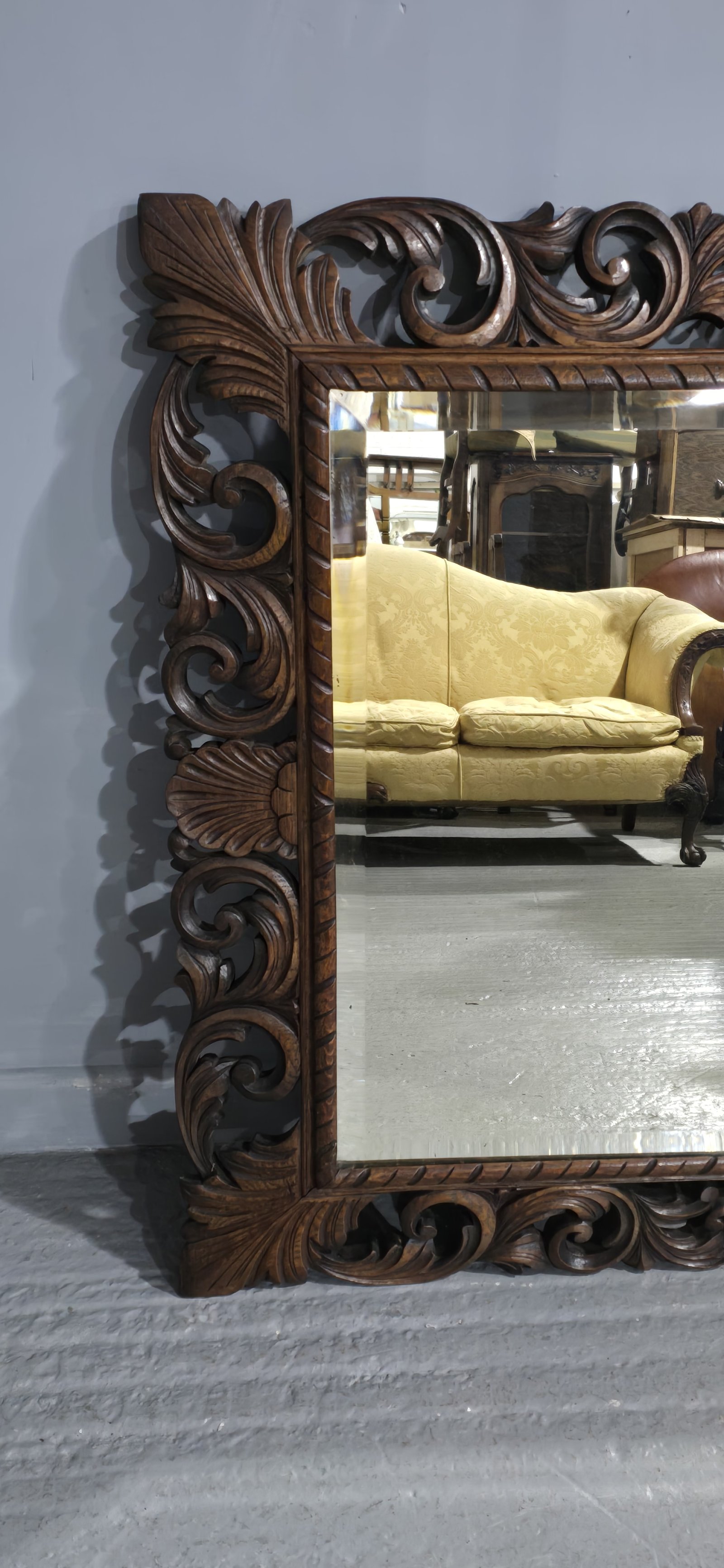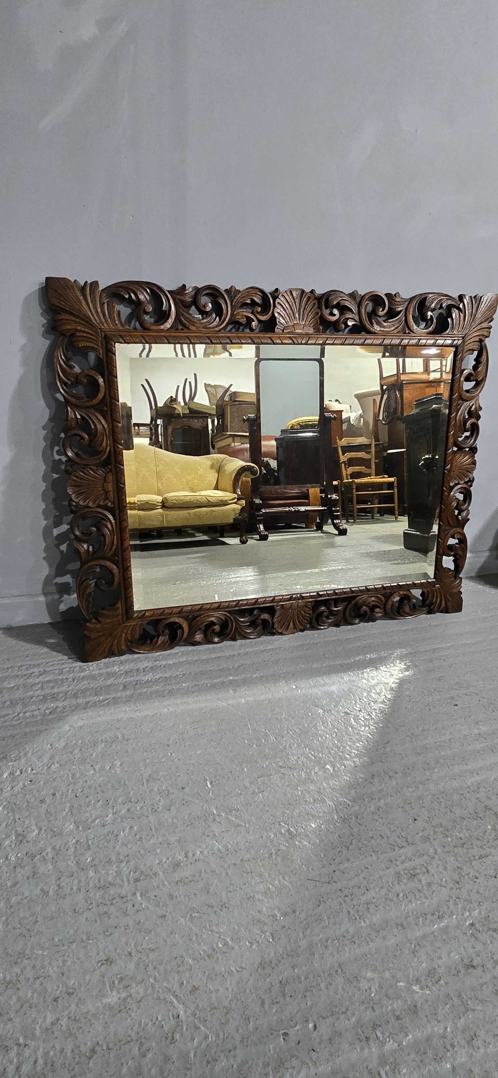 A very nice large carved oak cushion frame with original bevelled plate mirror, Can be hung portrait or landscape, excellent quality and ready to hang.