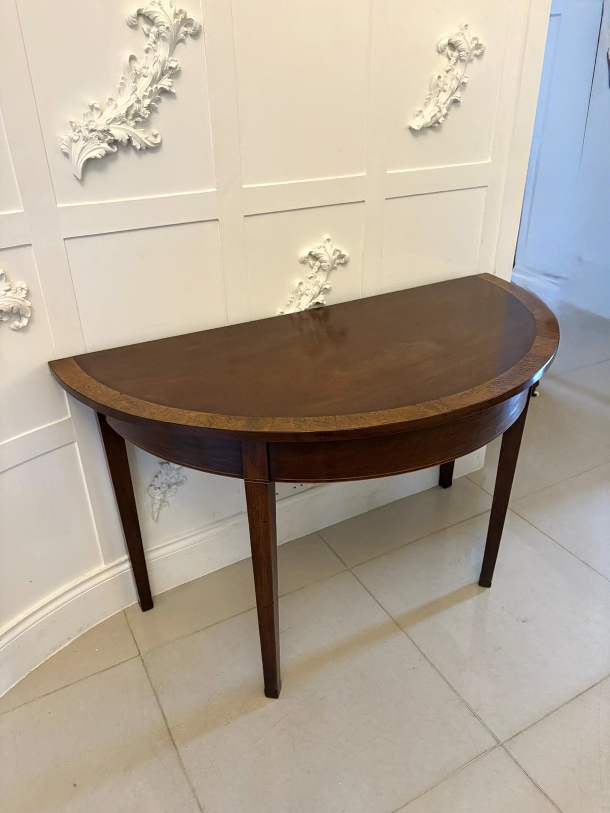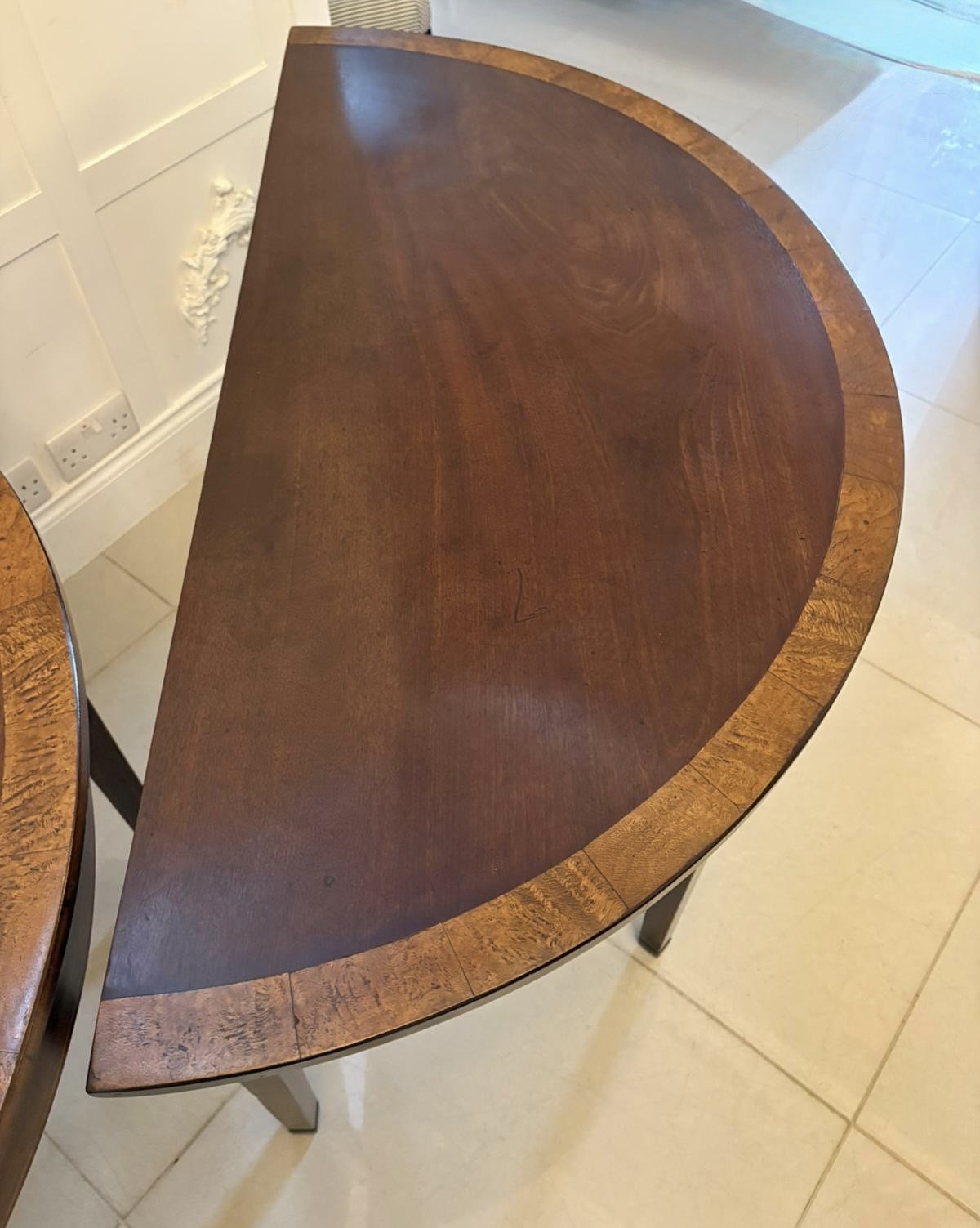 Large pair of antique George III quality figured mahogany Demi lune console tables having a quality figured mahogany satinwood crossbanded demi lune shaped top, mahogany frieze with inlaid satinwood stringing standing on four square tapering legs with block feet.