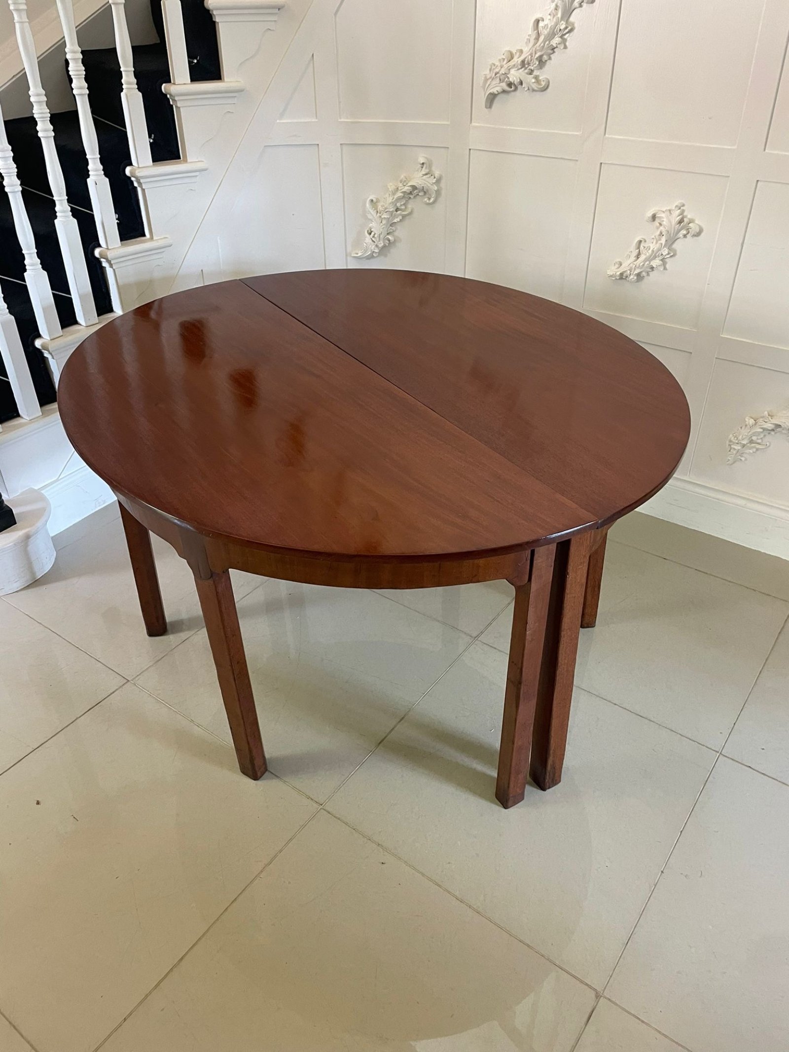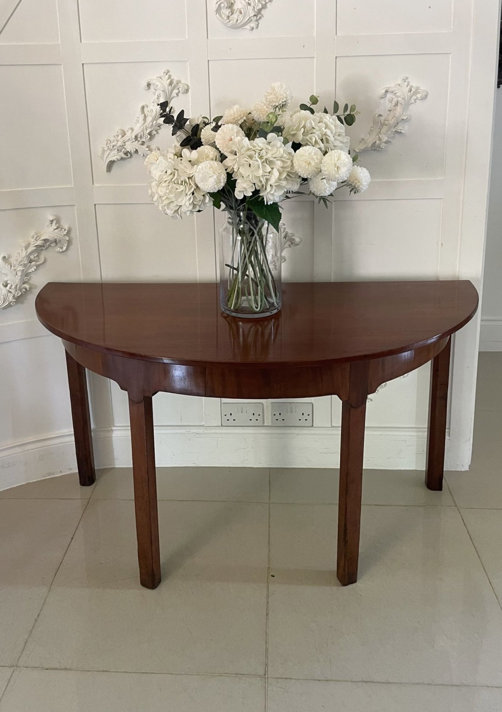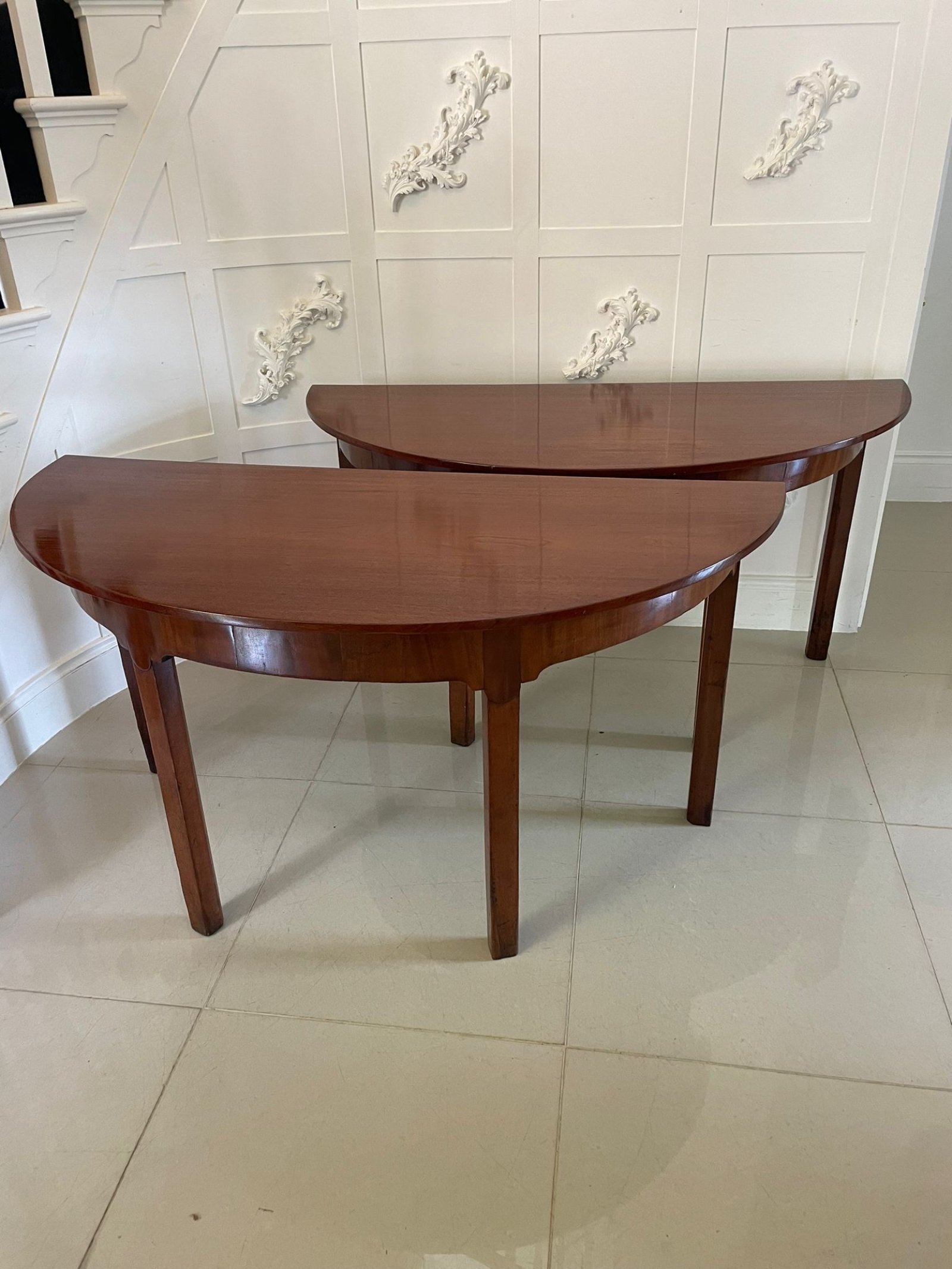 Large pair of antique George III quality figured mahogany demi lune shaped console tables having a quality figured mahogany demi lune shaped top above a figured mahogany shaped frieze standing on four square chamfered legs with an unusual attractive pear shaped carving to the top of the leg