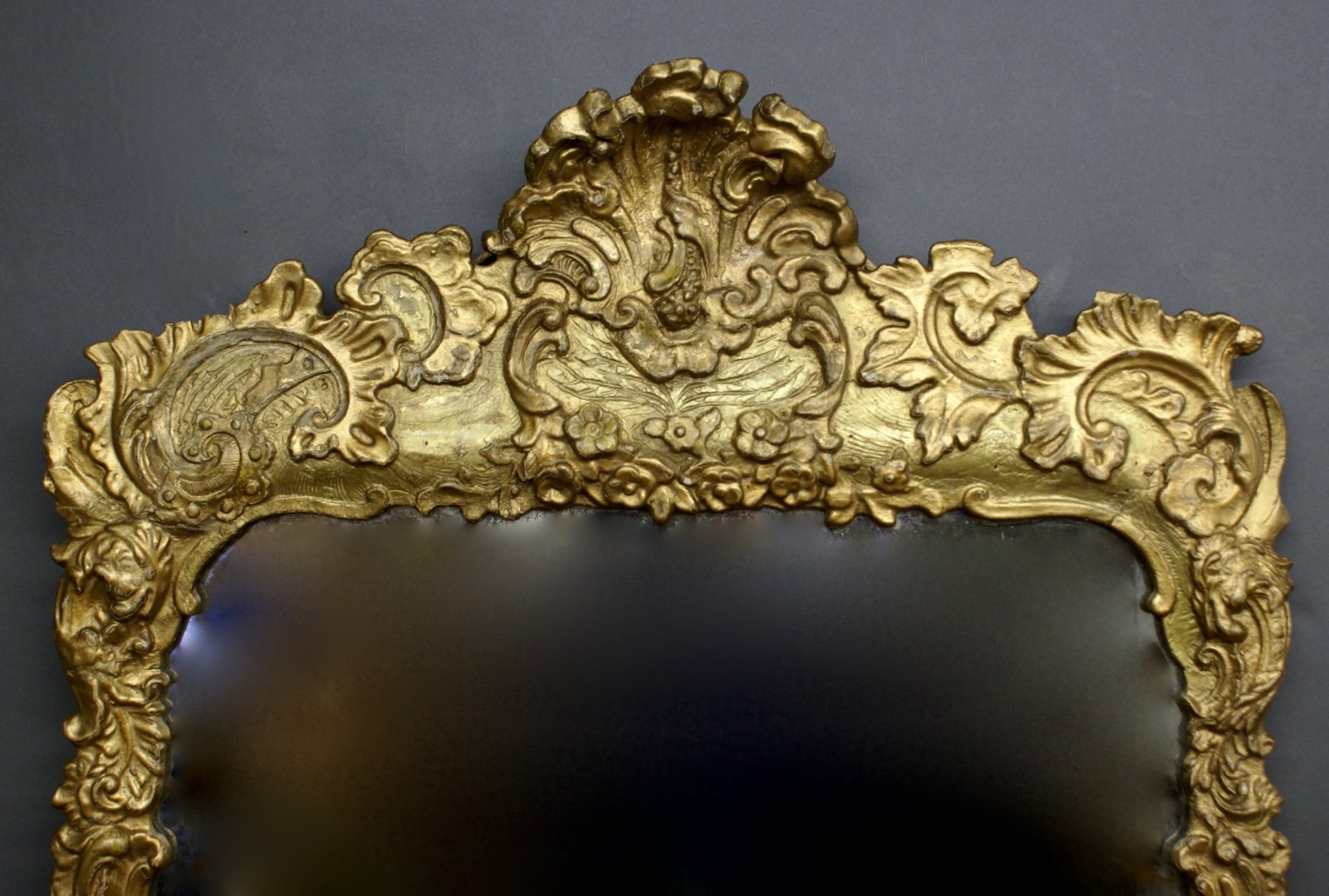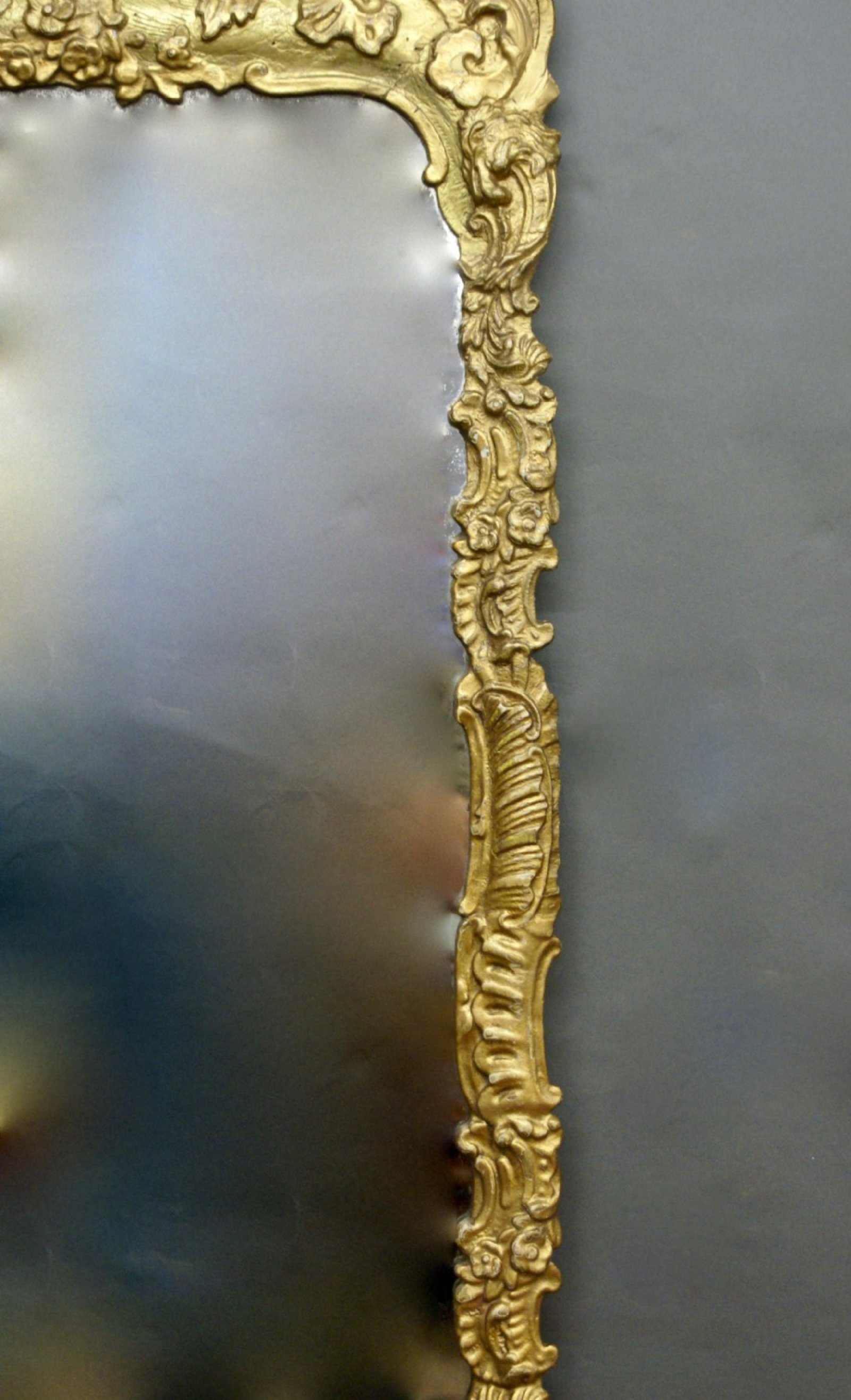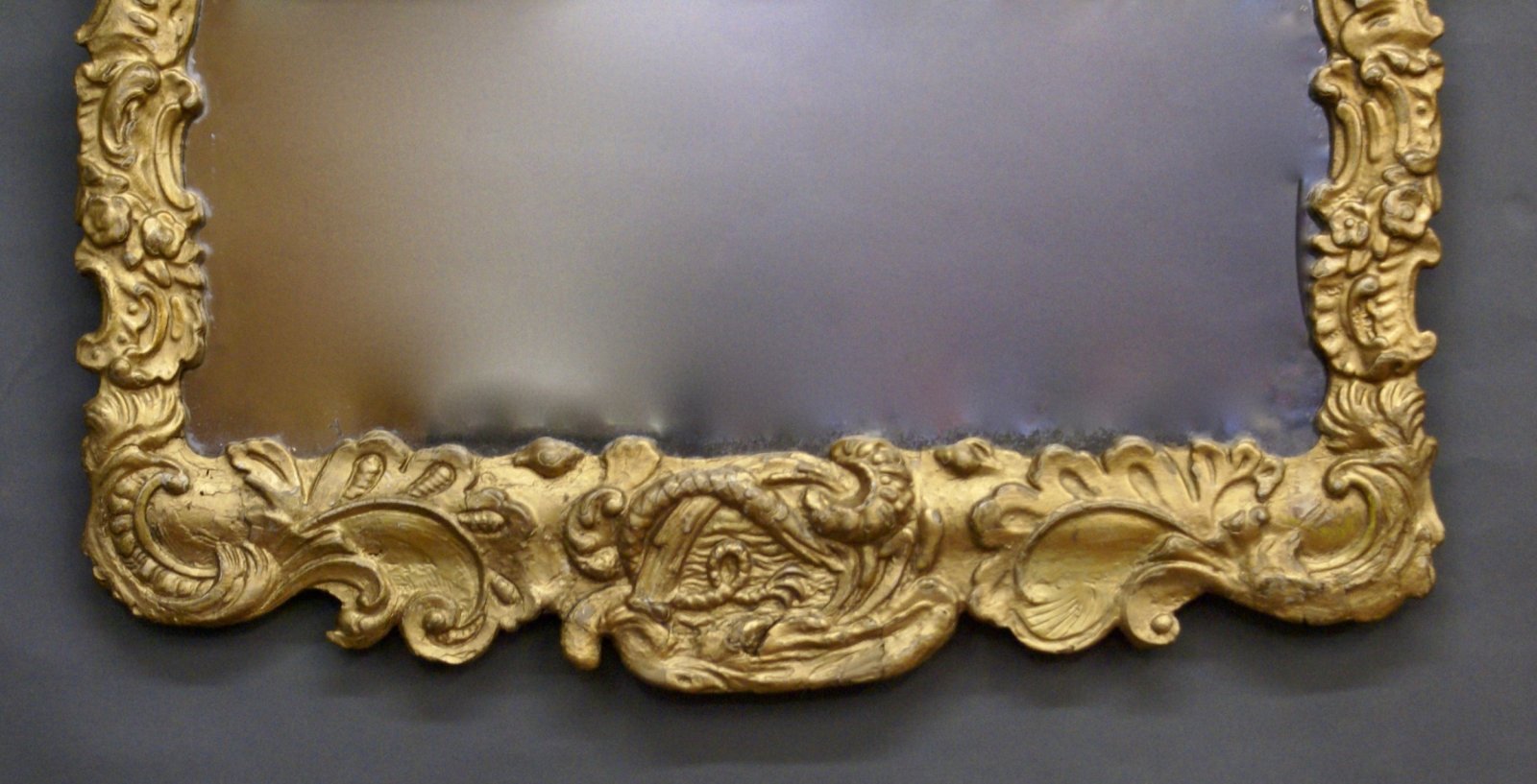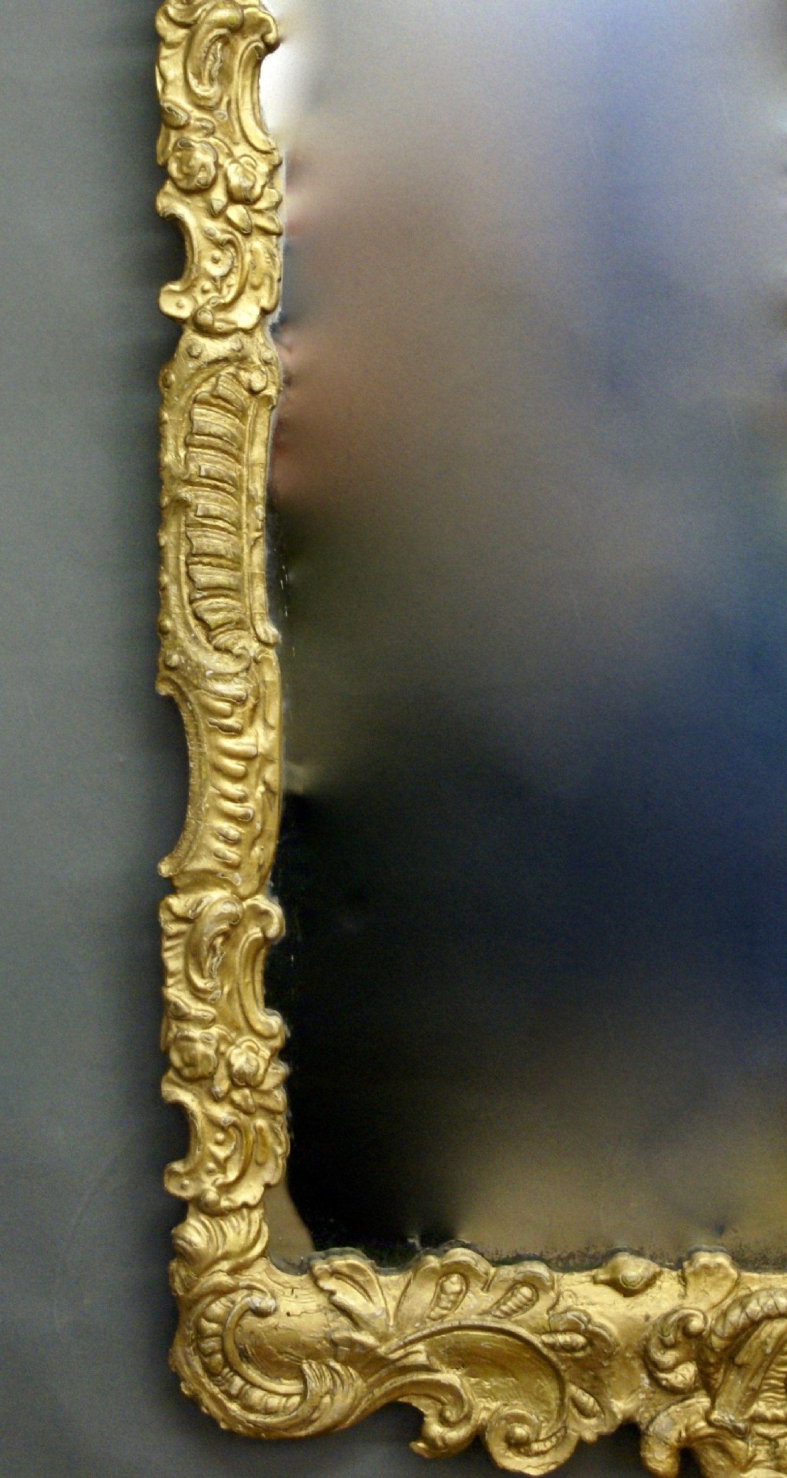 Late 18th Century Gilt frame Rococo wall mirror. In carved wood and Gesso and retaining most of its original gilding and its mirror plate. 1140mm high, 670mm wide and 80mm deep. Italian. Circa 1780.