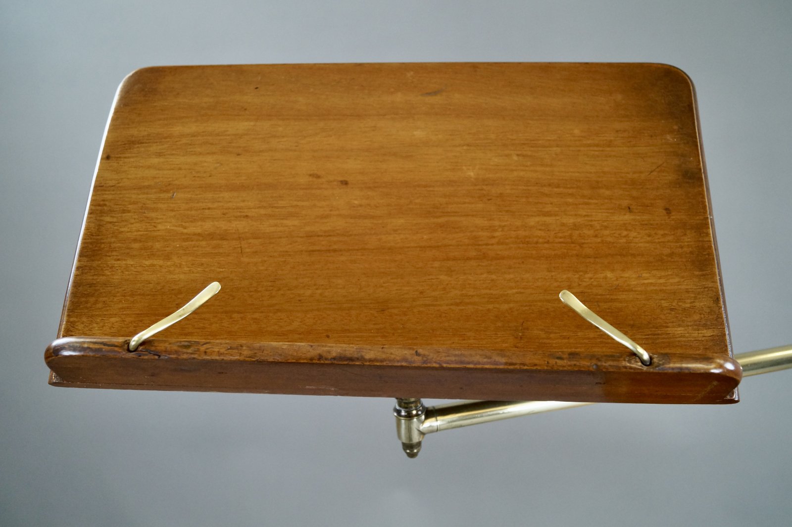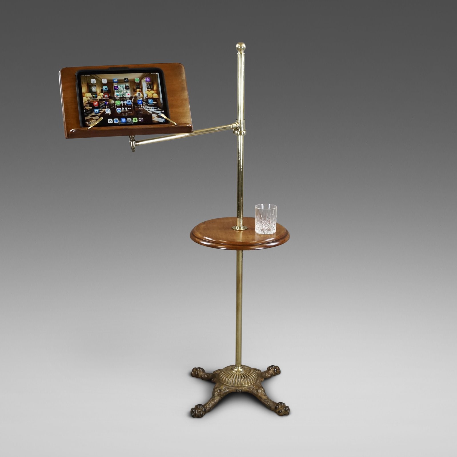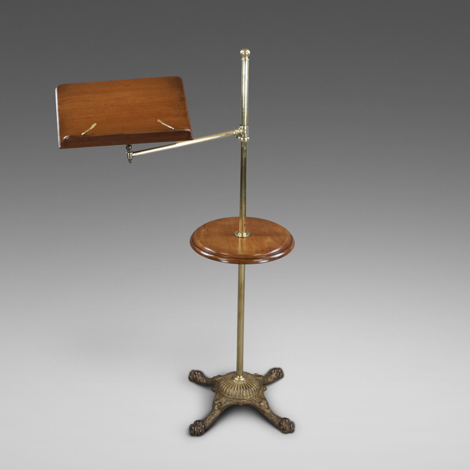 A Late 19th Century reading table. Raised on a cast iron base with paw feet and a brass pole supporting a circular walnut table and an adjustable walnut book rest. In very good and original condition. 1220mm high, 760mm wide and 140mm deep. English. Circa 1880.