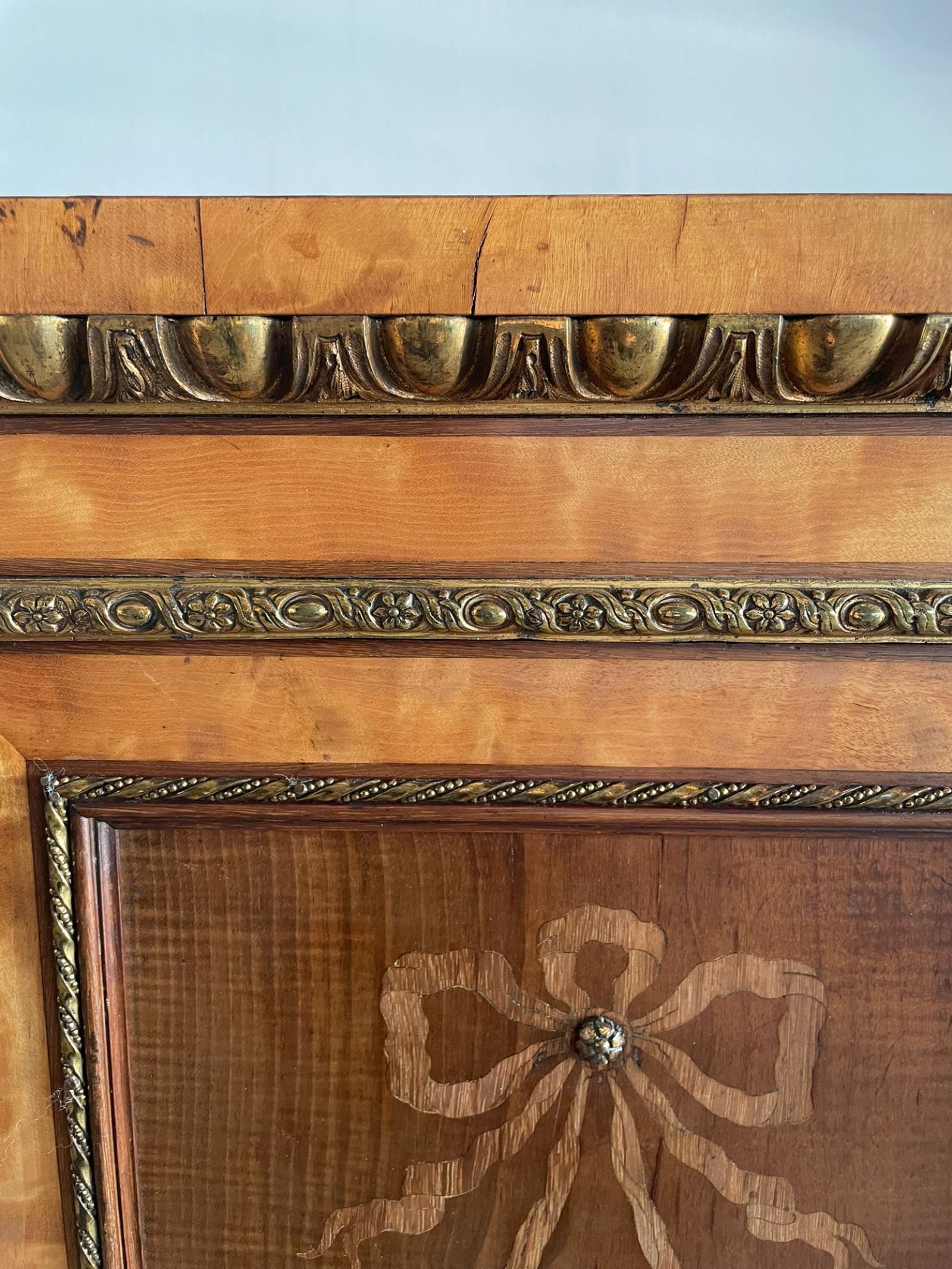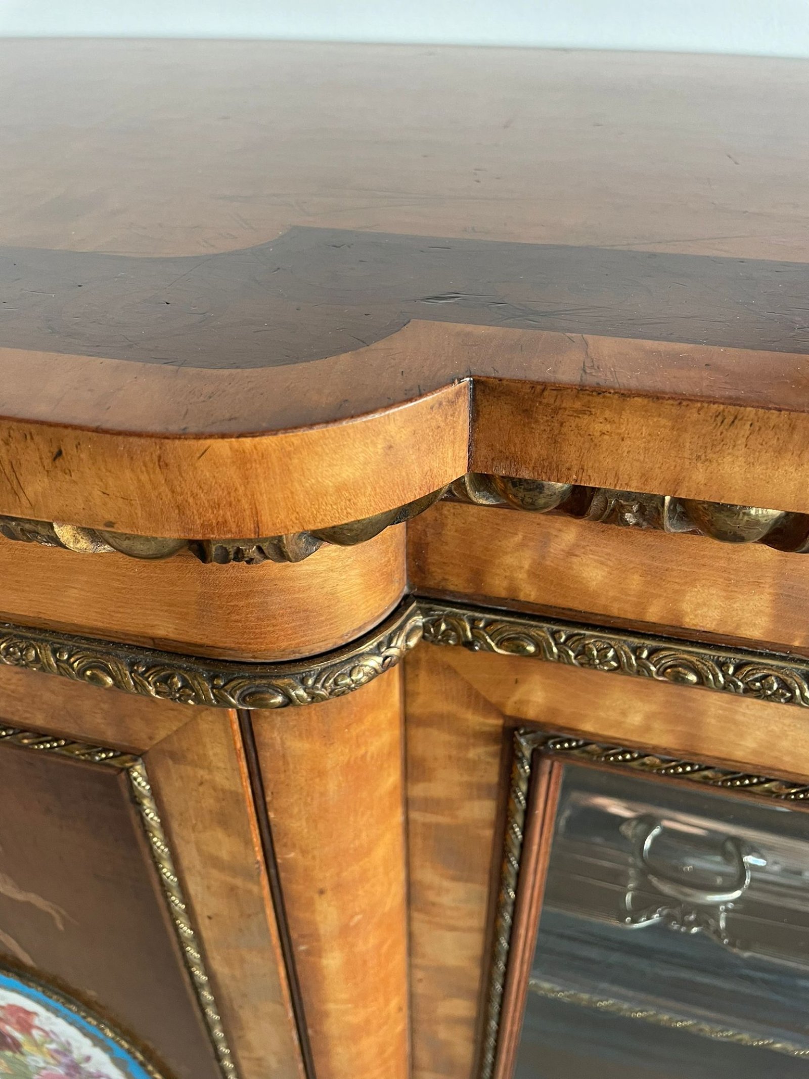 Magnificent exhibition quality extra large satinwood inlaid and ormolu mounted credenza/sideboard having a quality satinwood shaped top with fantastic marquetry inlay, satinwood and ormolu mounted frieze, a pair of satinwood ormolu mounted and glazed doors to the centre opening to reveal two shelves with ormolu beading and a mirror back flanked by two cupboard doors inlaid with bows and ribbons, hand painted porcelain panels with ormolu mounts opening to reveal fitted shelves flanked by open display ends with mirror backs; fantastic parquetry inlaid shelves crossbanded in satinwood supported by six solid satinwood turned columns with ormolu mounts standing on a shaped satinwood ormolu mounted plinth.