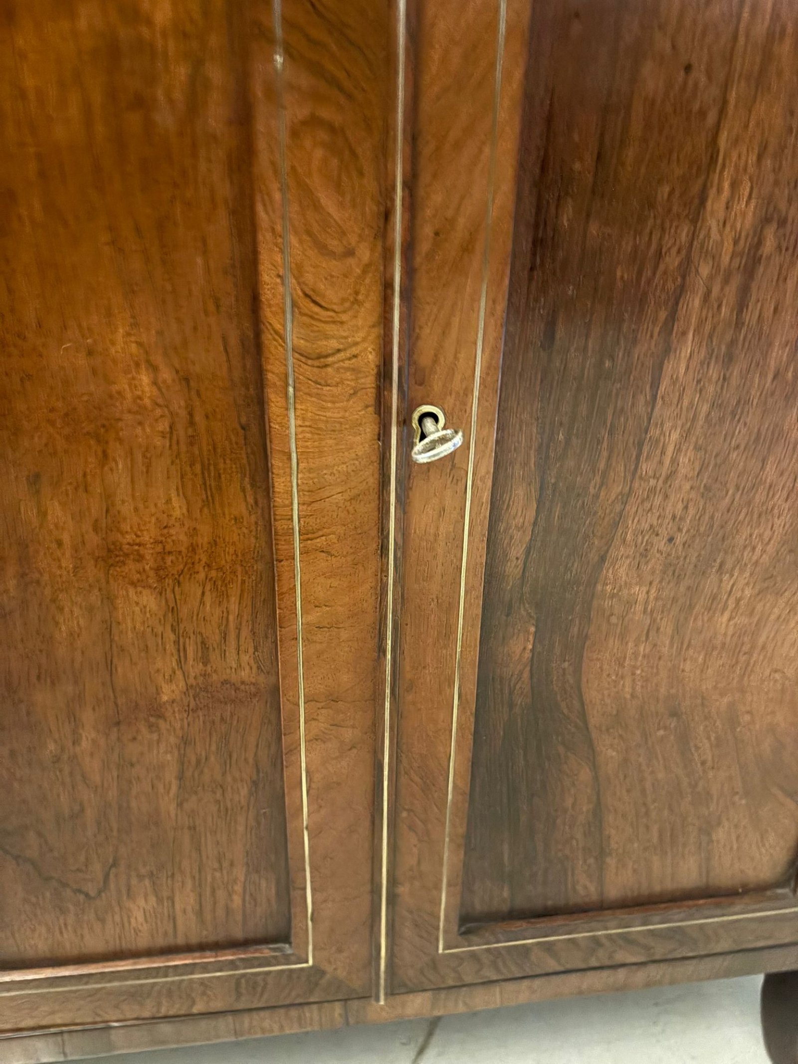 Excellent condition for its age. The brass inlay is intact and displays beautifully, and the cabinet stands solid and level.