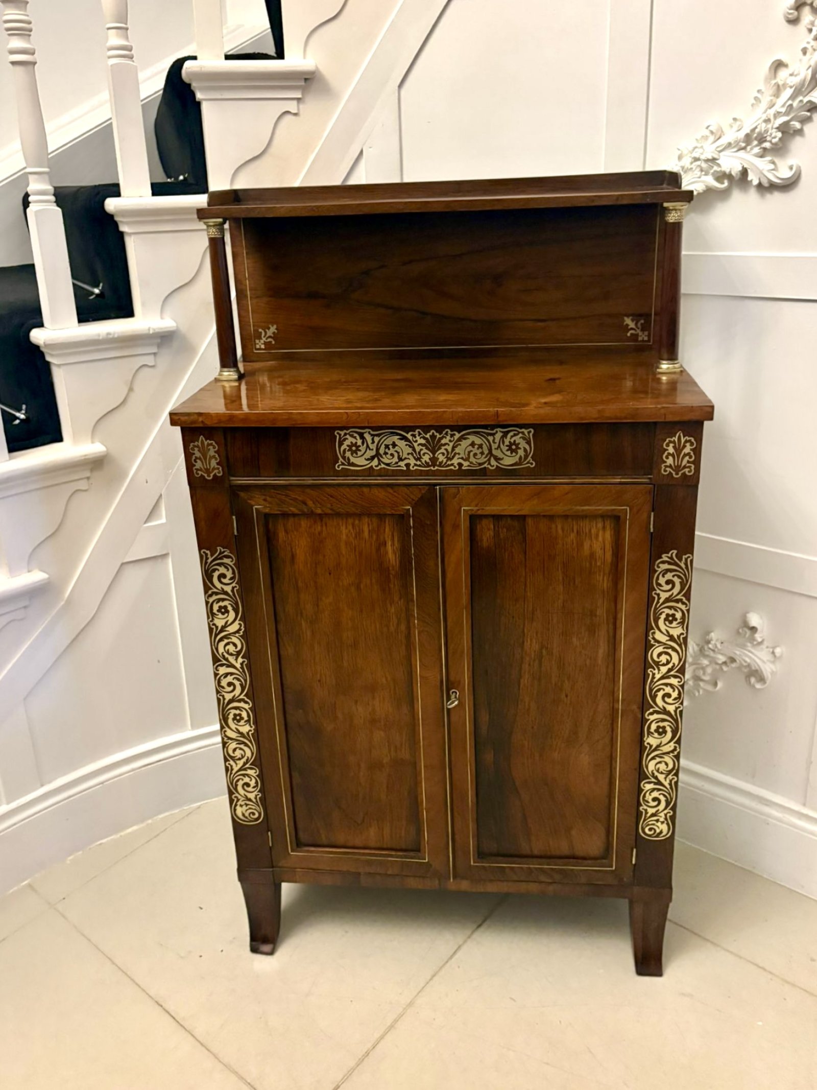 A superb early 19th-century Regency mahogany chiffonier of elegant form enriched with finely executed brass inlay and mounted columns. The piece displays the refined proportions and distinctive decorative language of the Regency period offering presence without heaviness.