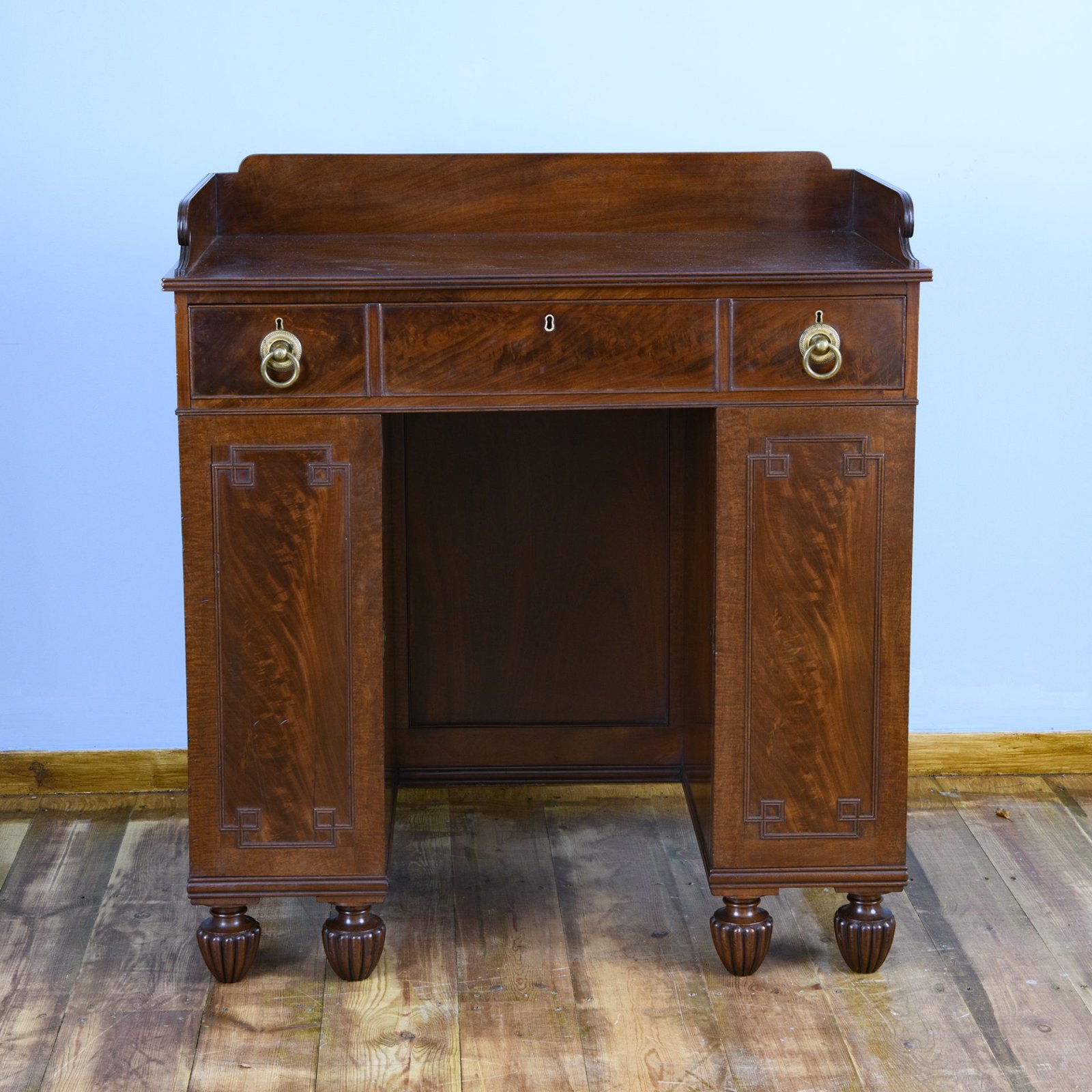 The solid mahogany and reeded gallery surmounted onto a figured mahogany top with a double reeded moulded edge sits above a single long drawer. The faux drawers to the front retain the original gilt brass ring pulled handles on crisply cast back plates. The faux drawers and flamed mahogany with cock beaded frames. The mahogany lined drawer is full length and made with finely tapered dovetail joints.